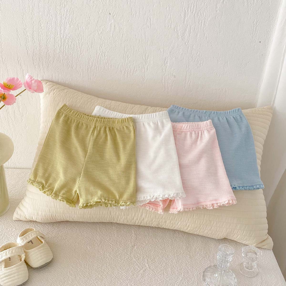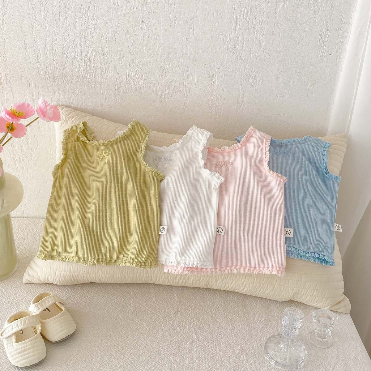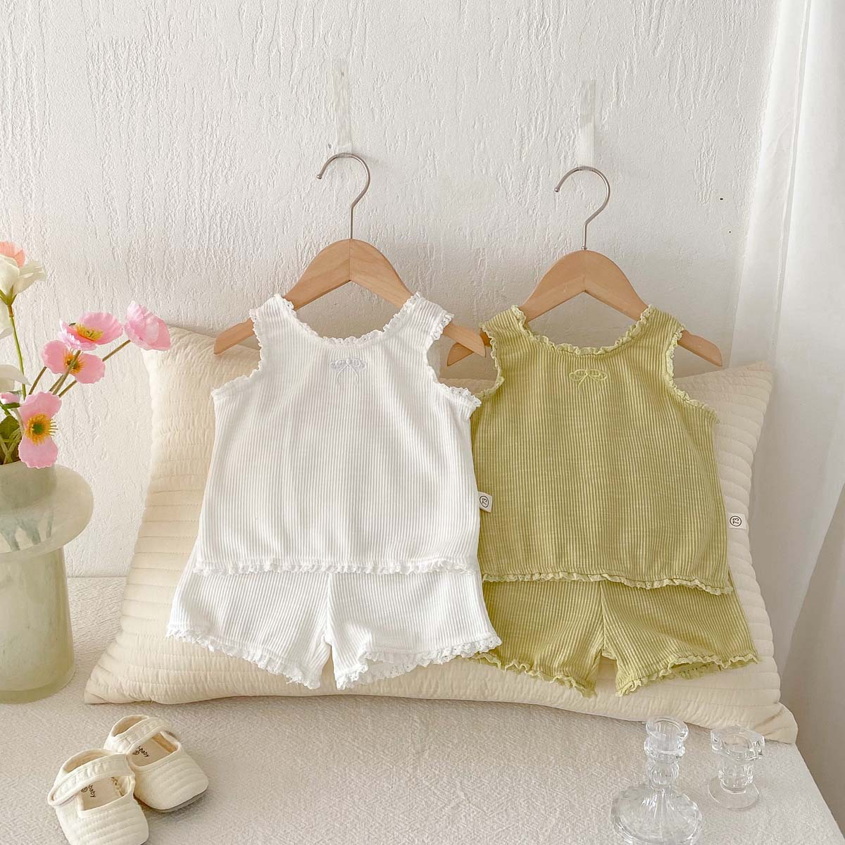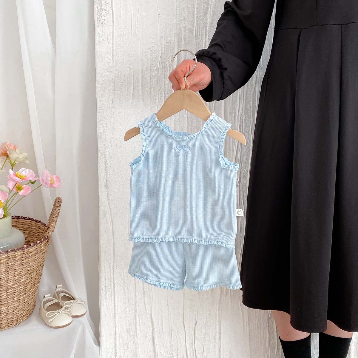 The top is a cool, sleeveless tank top . The openwork design makes it breathable, making it comfortable even on hot summer days. The ribbons and frills on the shoulders add a touch of girly sweetness. The bottoms are shorts that are easy to move in. The waist is elastic, making it easy to put on and take off.