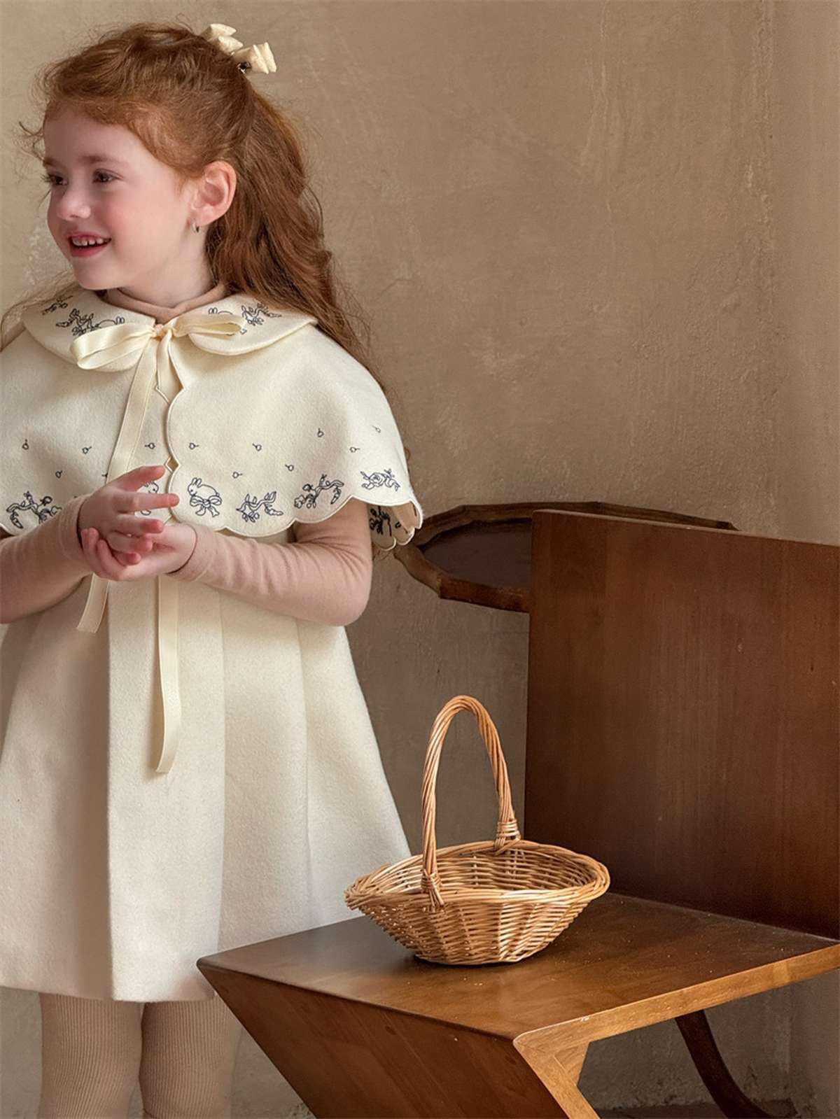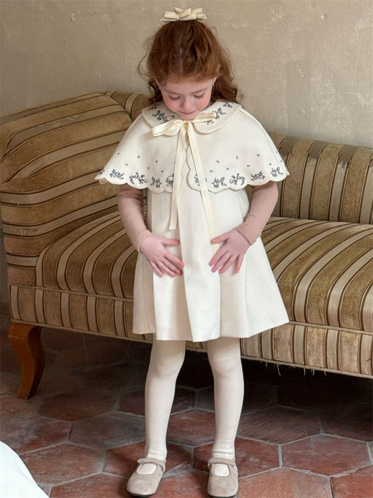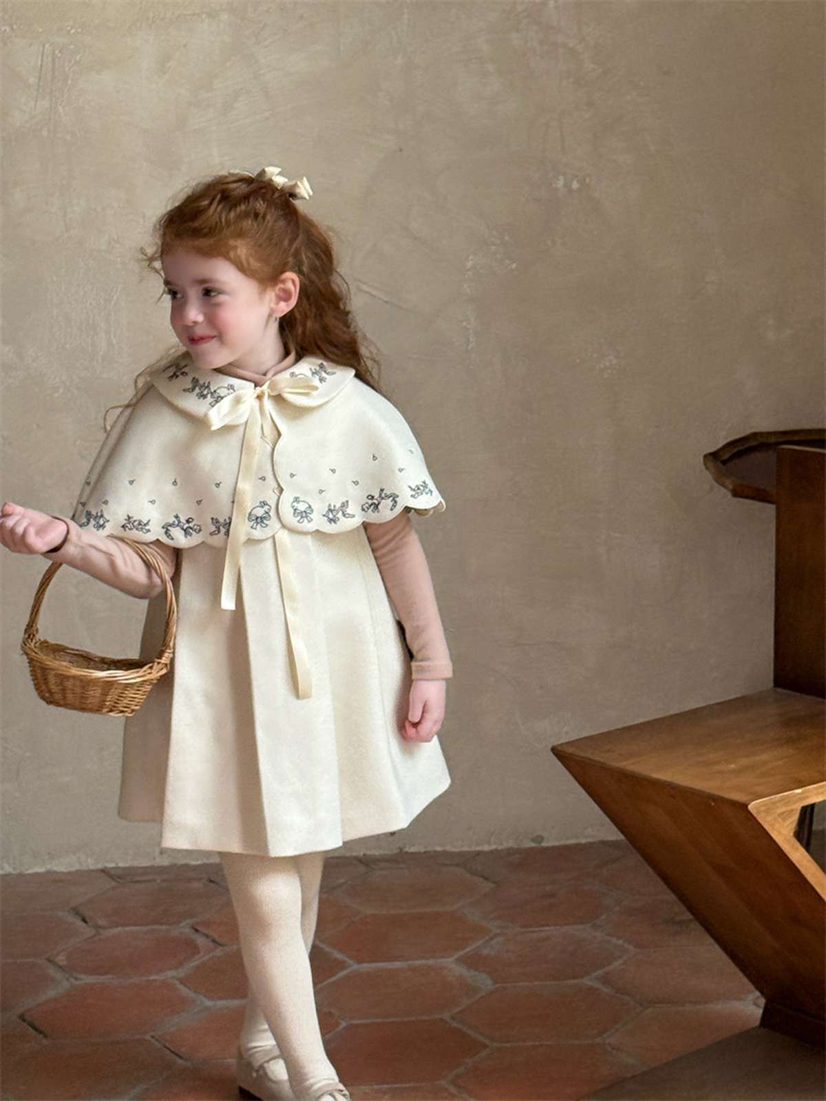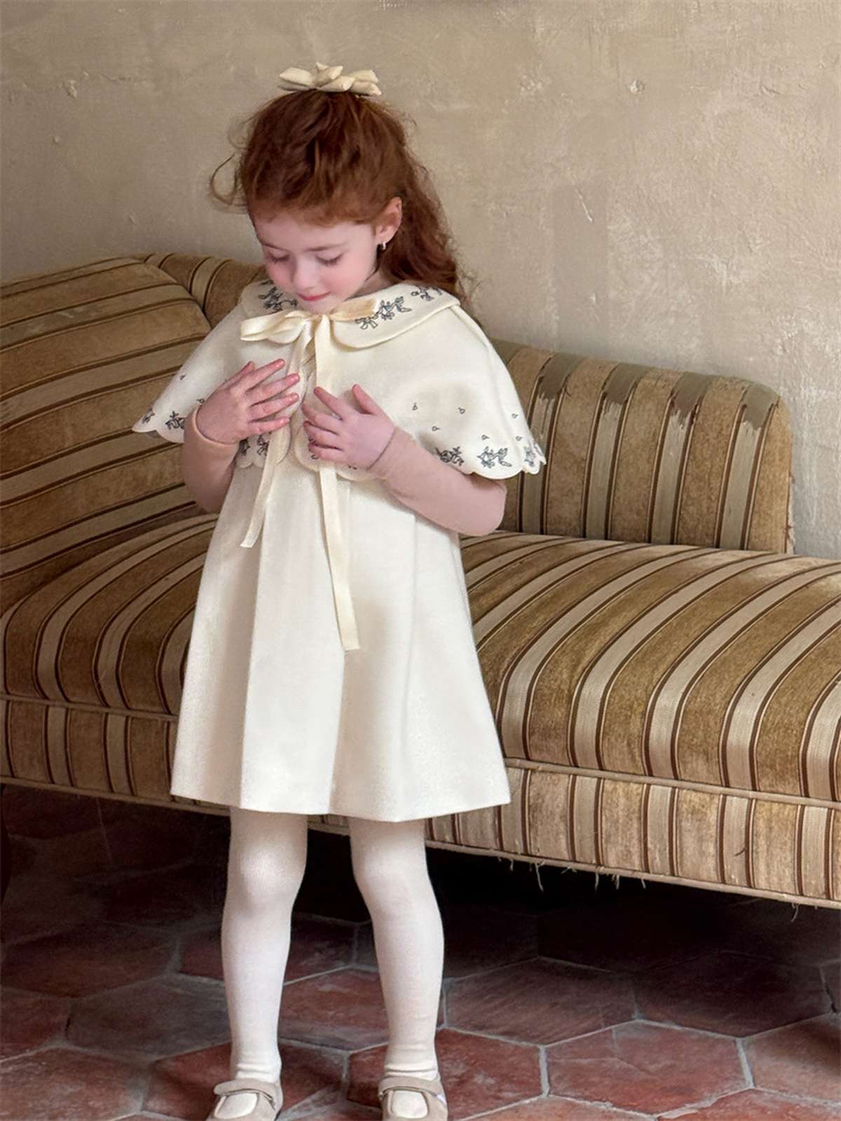 This set, featuring a classic box-pleat dress and a cape with ribbon embroidery, will make any outing a special occasion. The tweed-like material and doll-collar dress create a sophisticated and stylish look. By adding the cape, the simple dress instantly transforms into a glamorous look, creating an elegant look that is perfect for your baby's stylish formal occasions.