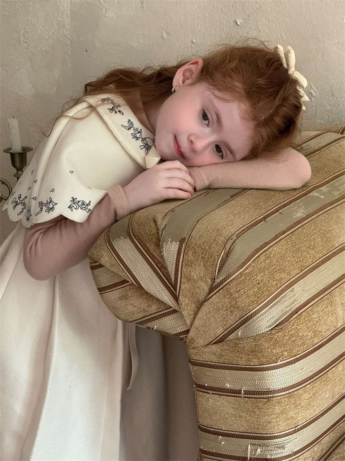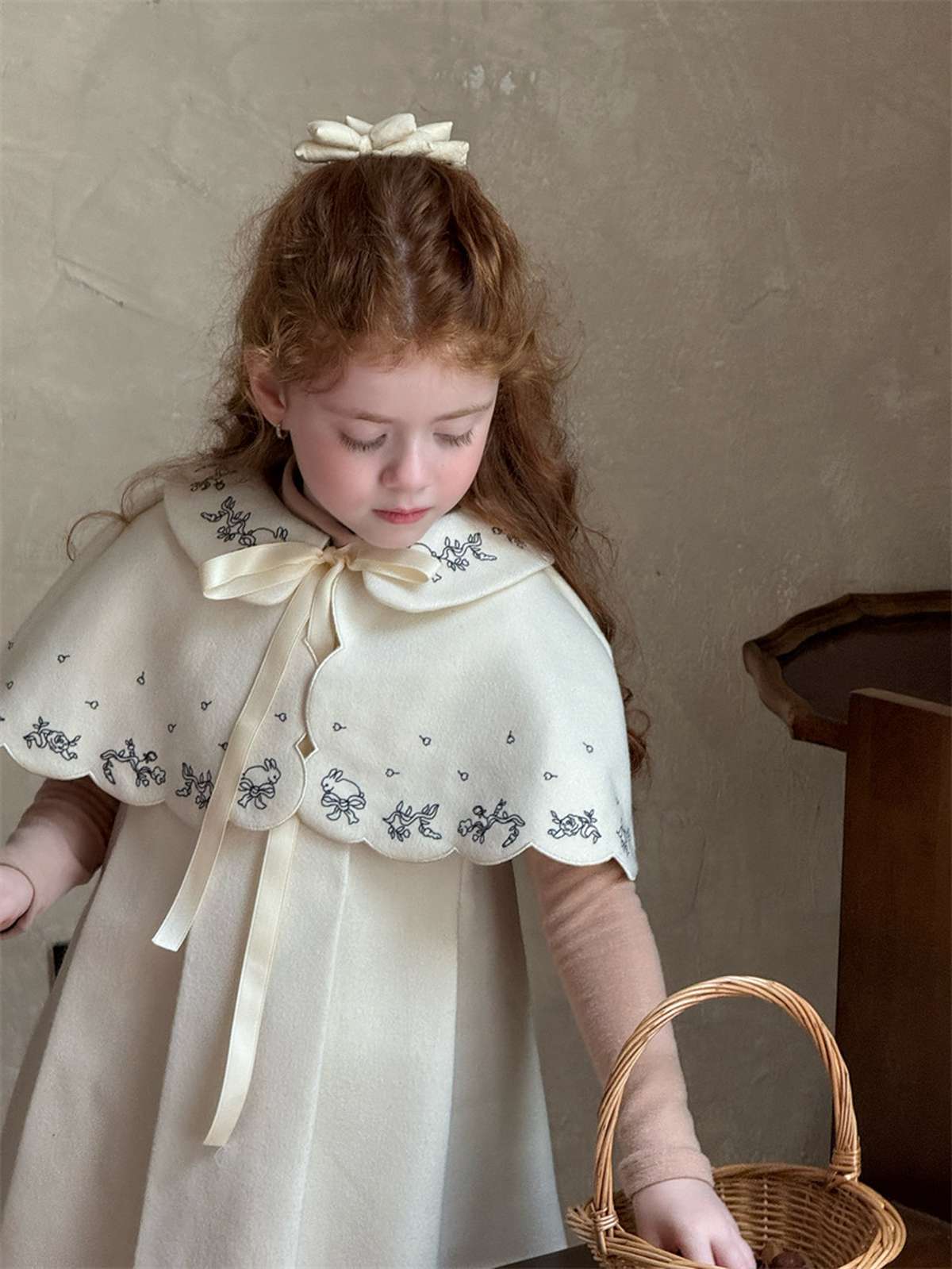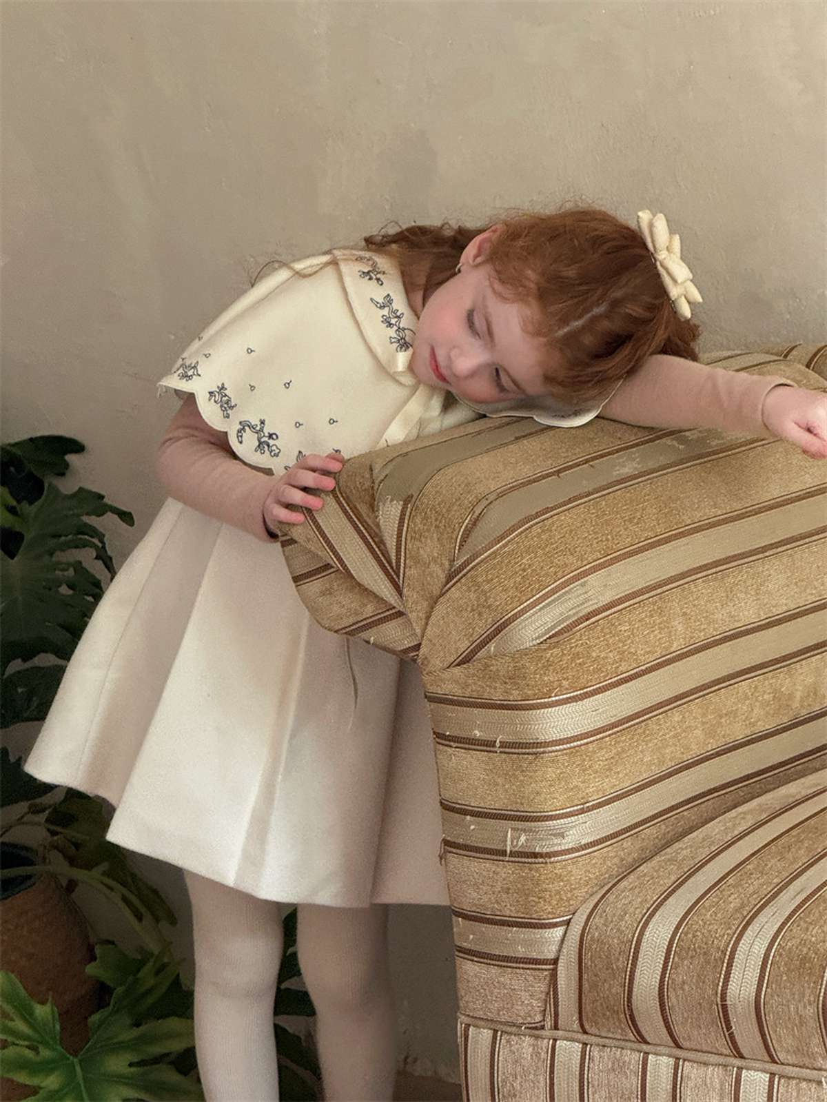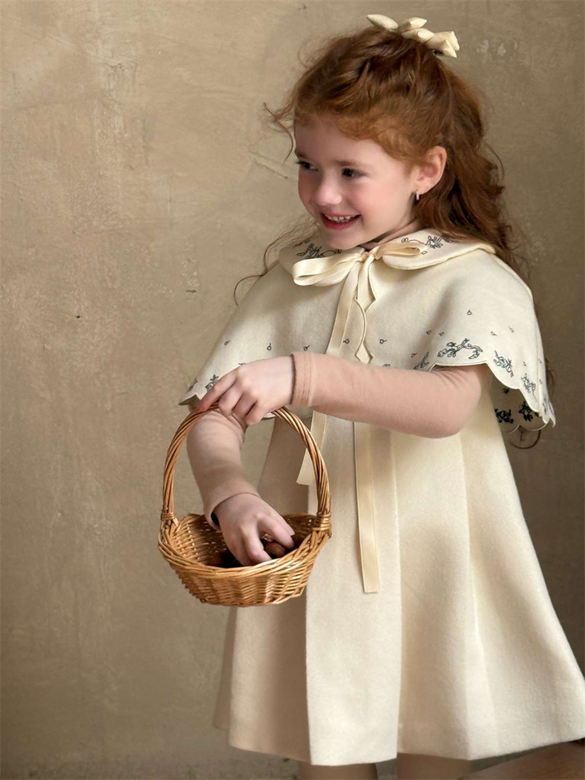 This set, featuring a classic box-pleat dress and a cape with ribbon embroidery, will make any outing a special occasion. The tweed-like material and doll-collar dress create a sophisticated and stylish look. By adding the cape, the simple dress instantly transforms into a glamorous look, creating an elegant look that is perfect for your baby's stylish formal occasions.