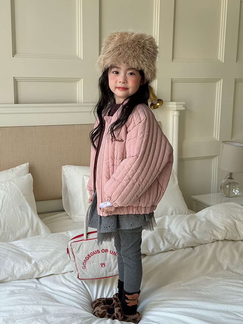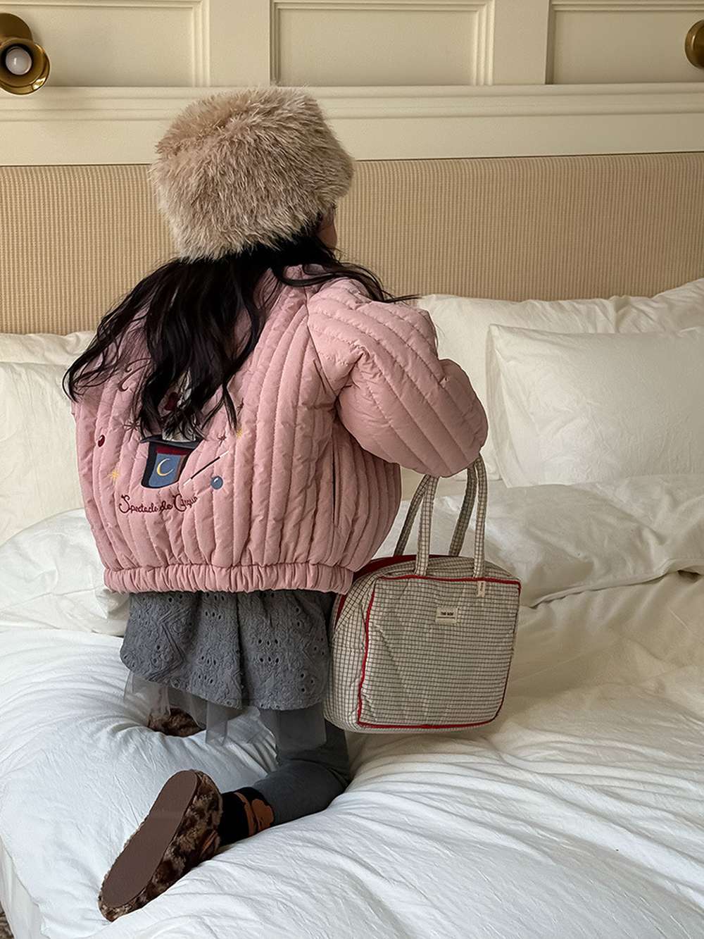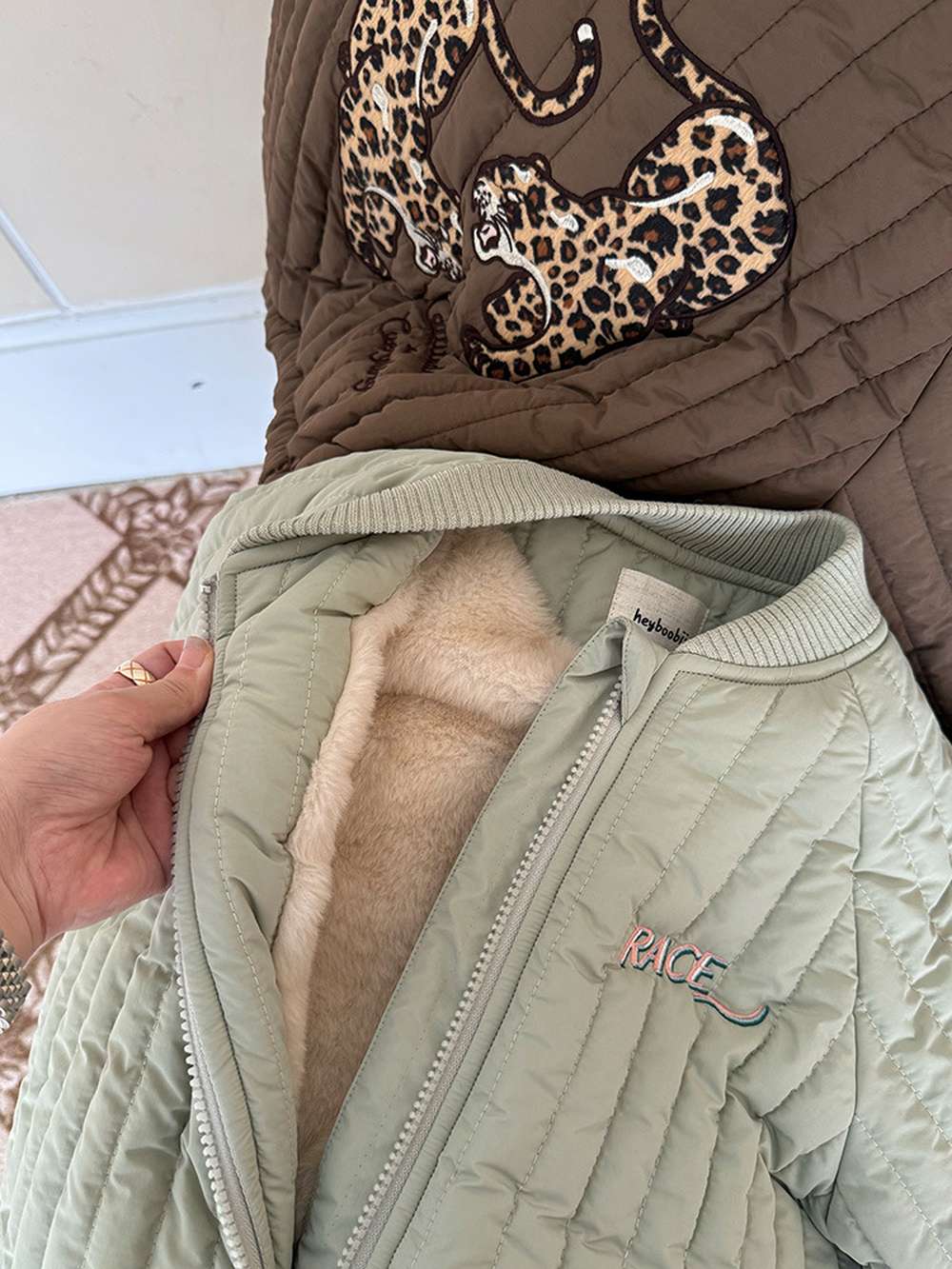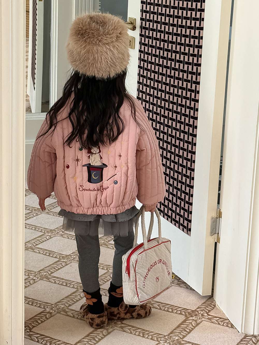 This long-sleeved quilted jacket is a children's item that is filled with padding for fluffy warmth. The all-over embroidery of character patterns adds a special, adorable touch to this casual outerwear . The lining is made of soft rabbit fur-like material, making this jacket both comfortable and stylish, making it a stylish winter garment for the cold season.