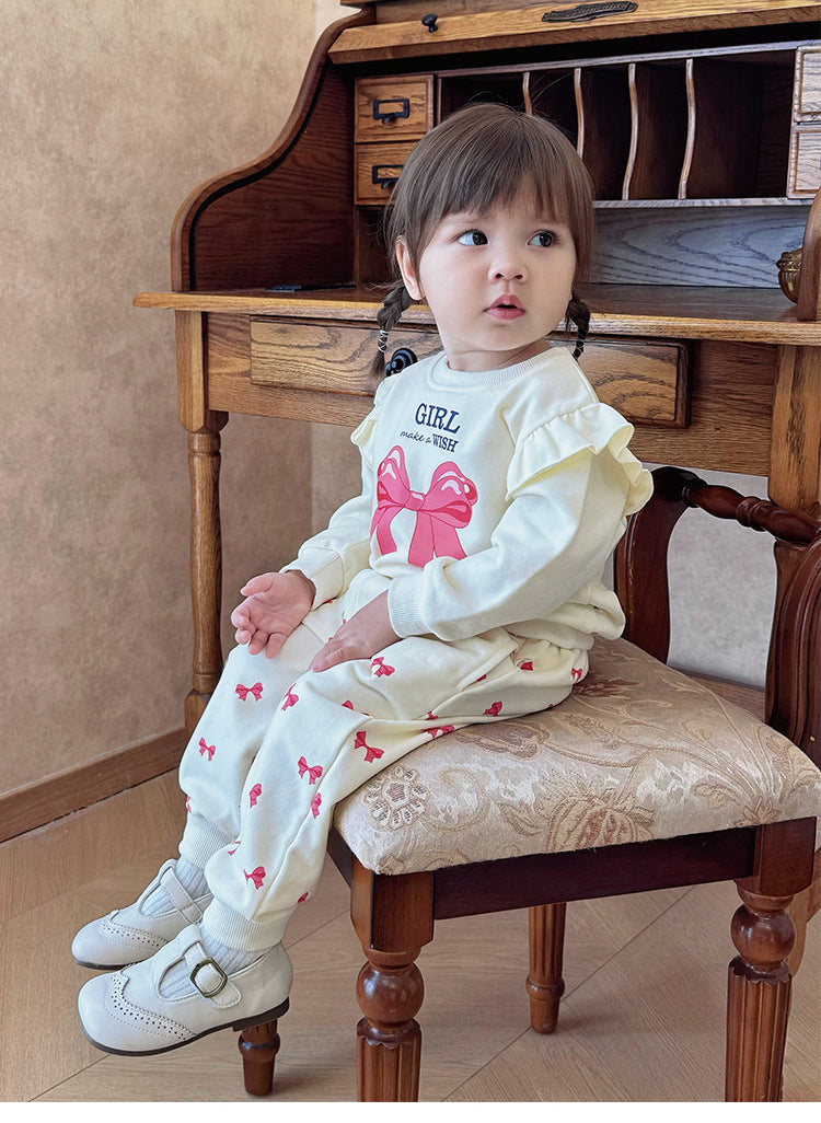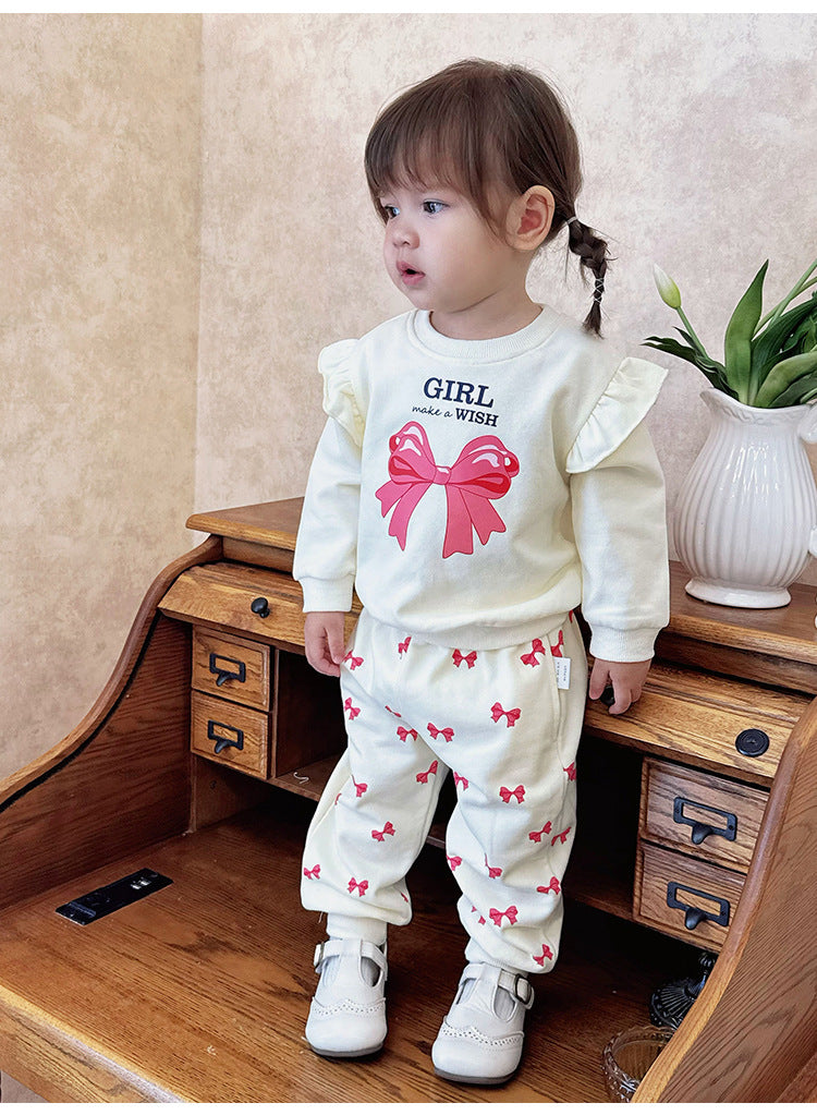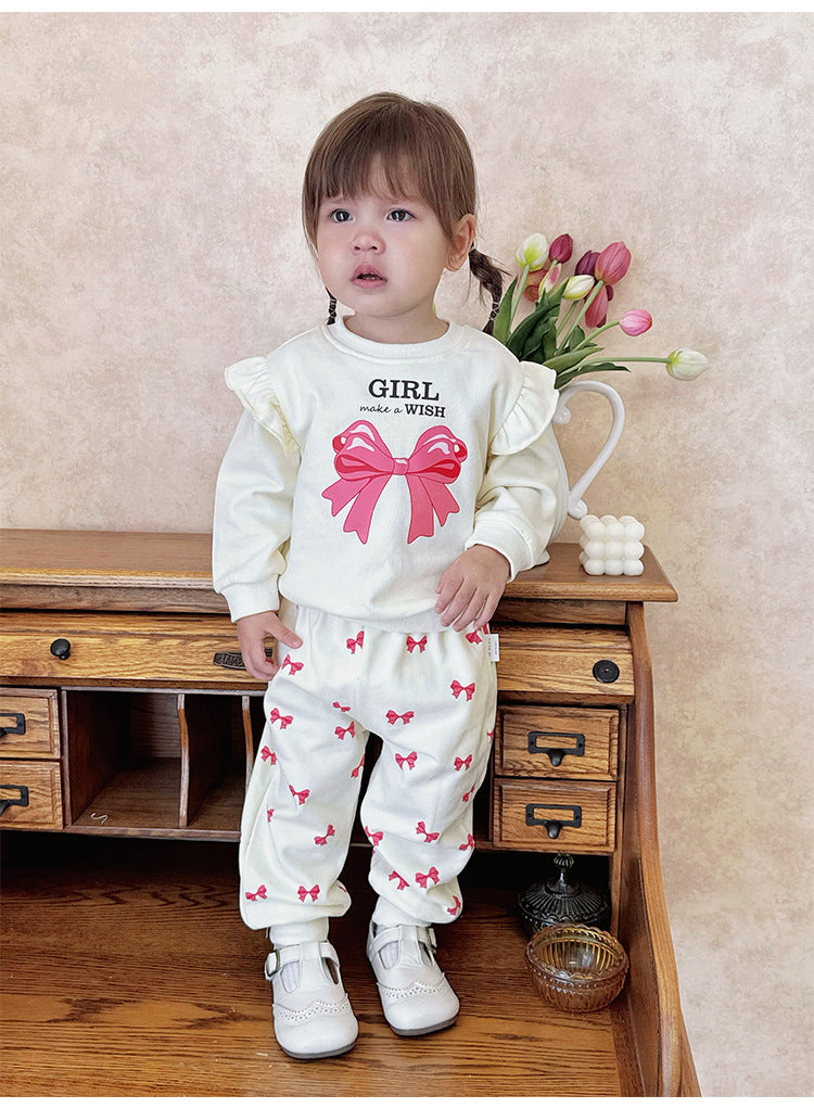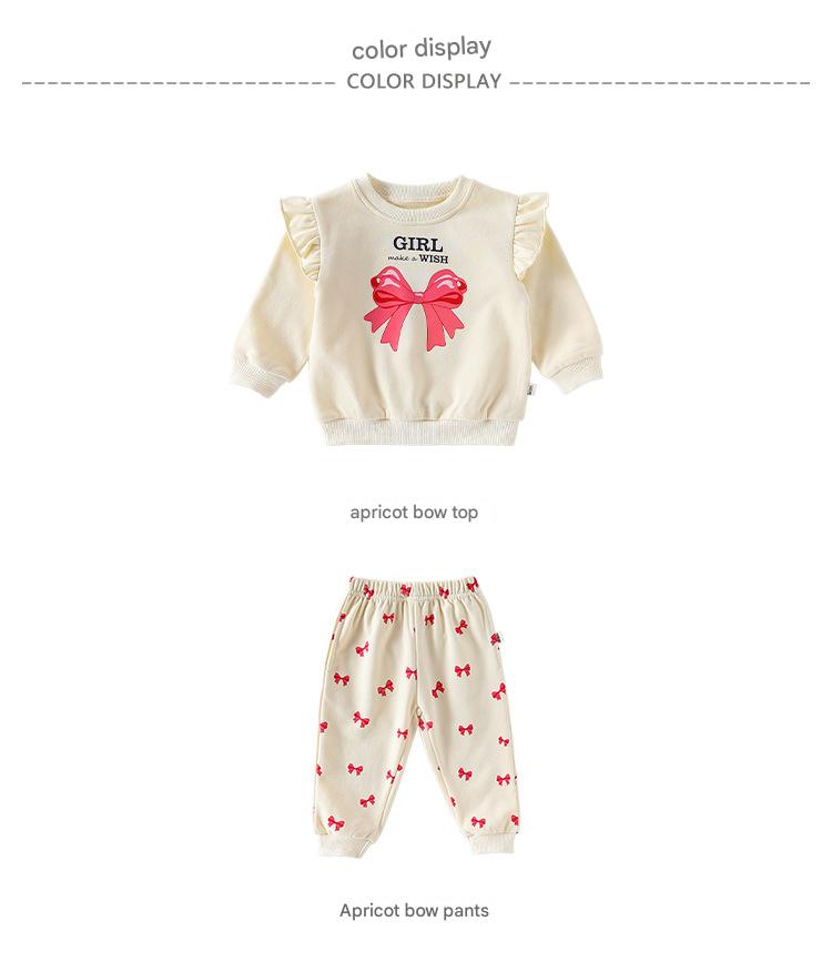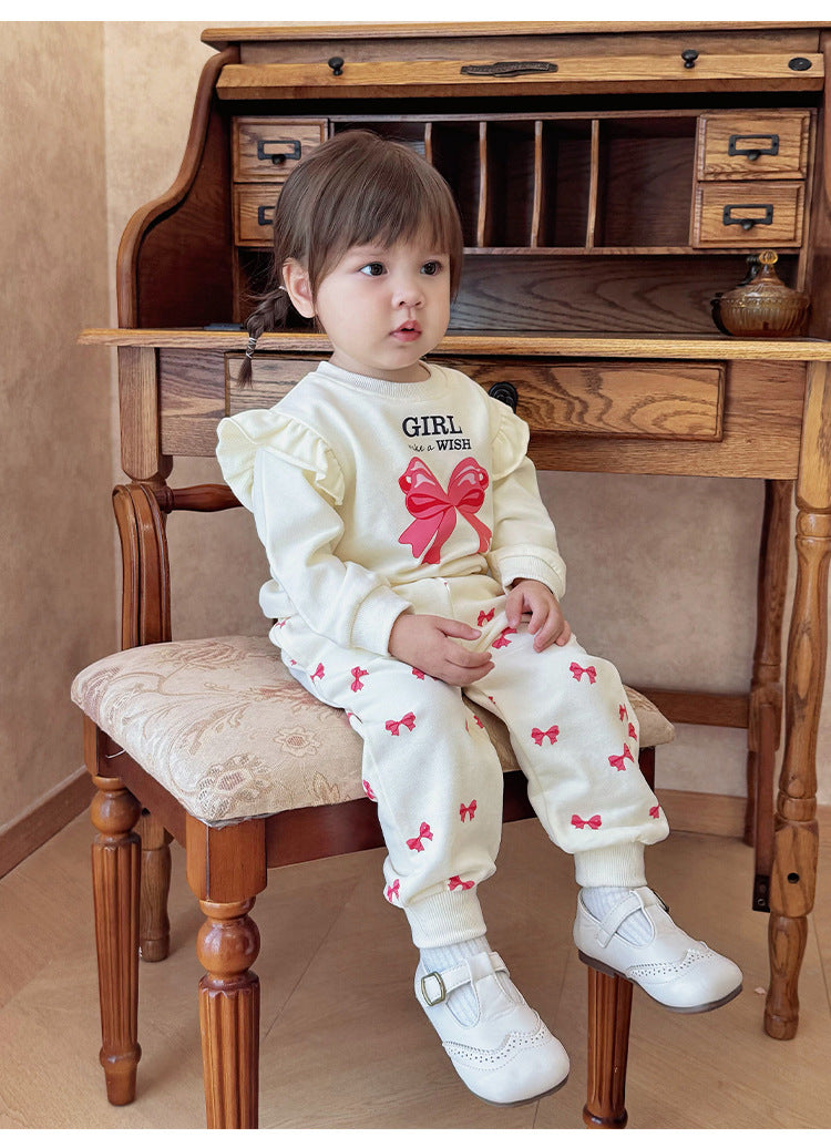 キュートなリボンプリントが目を引くフリル付きスウェットシャツと、合わせやすいスウェットパンツのセットアップです。動きやすい素材で仕立てられたこの長袖子ども服は、デイリーのお出かけスタイルを快適かつおしゃれに演出します。トップスに施されたフリルがさりげない華やかさを添え、洗練された印象を与えるツーピースのコーディネートが楽しめます。