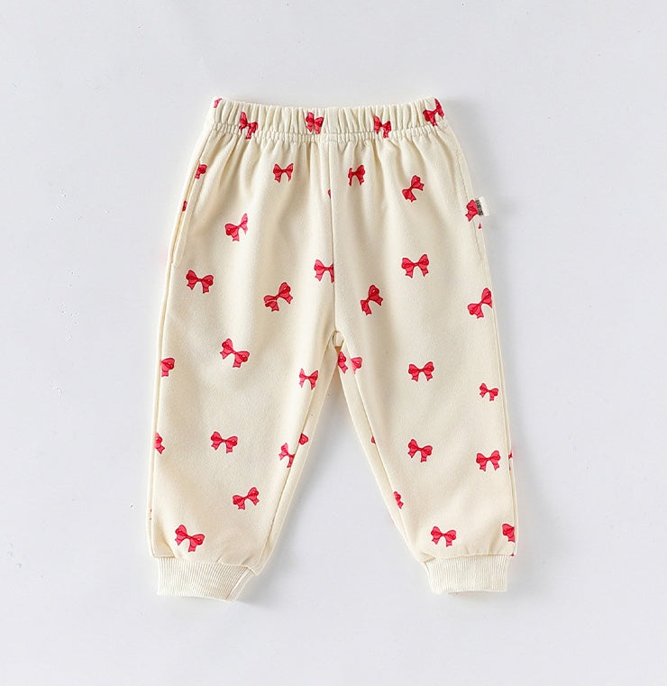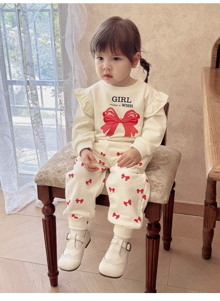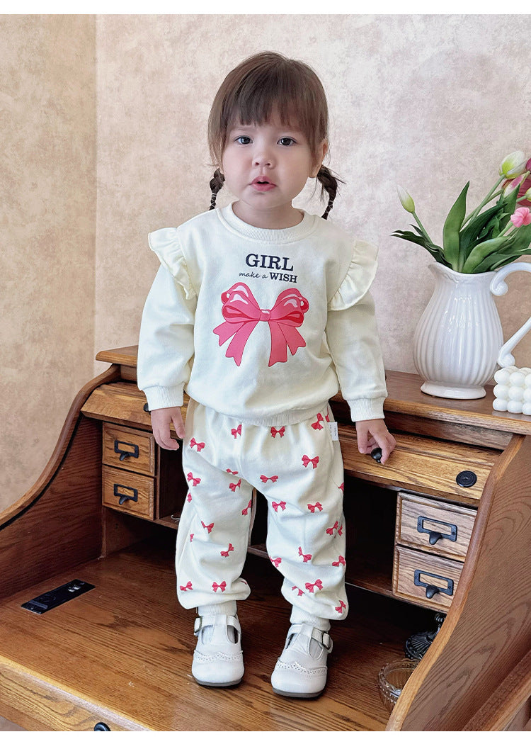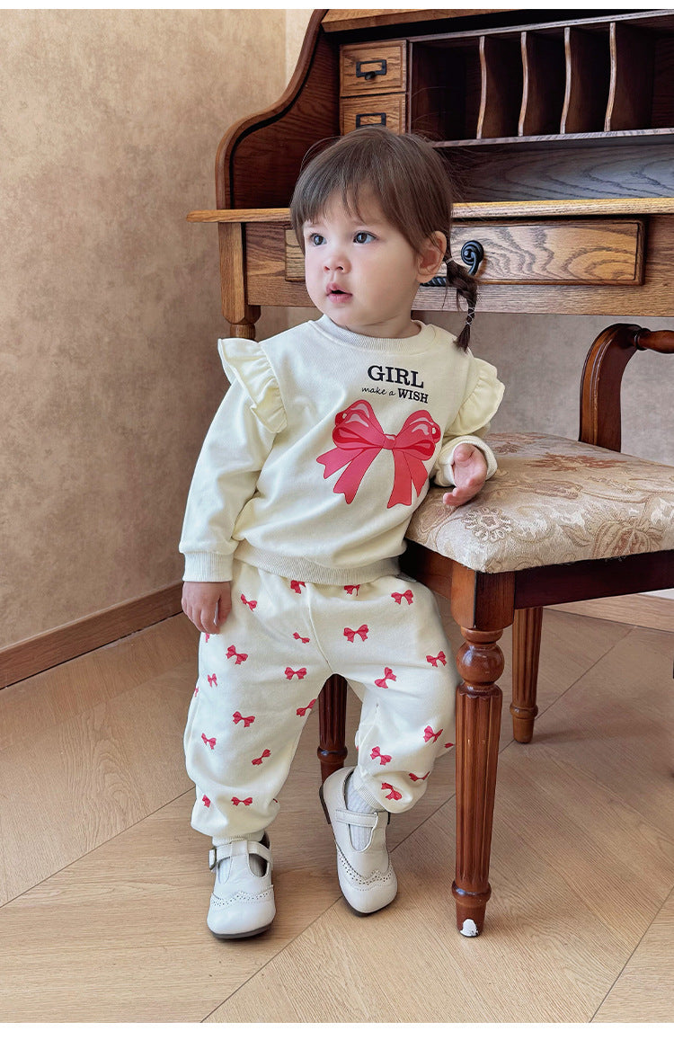 キュートなリボンプリントが目を引くフリル付きスウェットシャツと、合わせやすいスウェットパンツのセットアップです。動きやすい素材で仕立てられたこの長袖子ども服は、デイリーのお出かけスタイルを快適かつおしゃれに演出します。トップスに施されたフリルがさりげない華やかさを添え、洗練された印象を与えるツーピースのコーディネートが楽しめます。