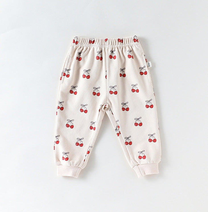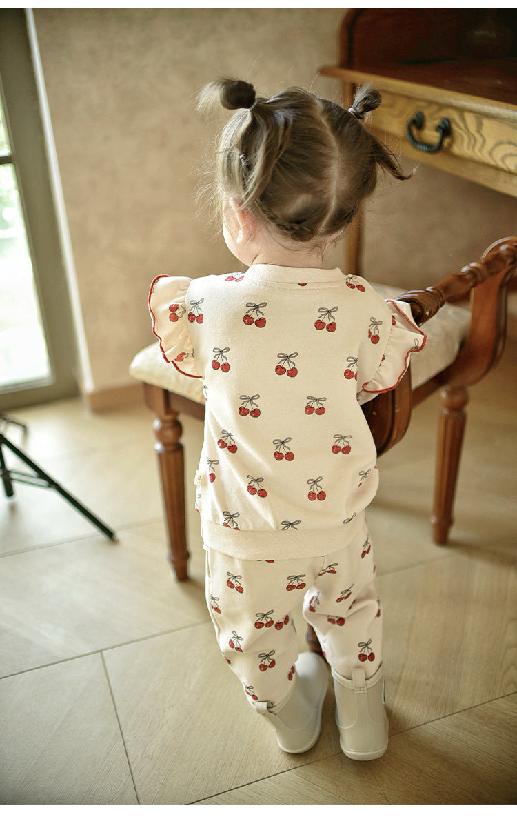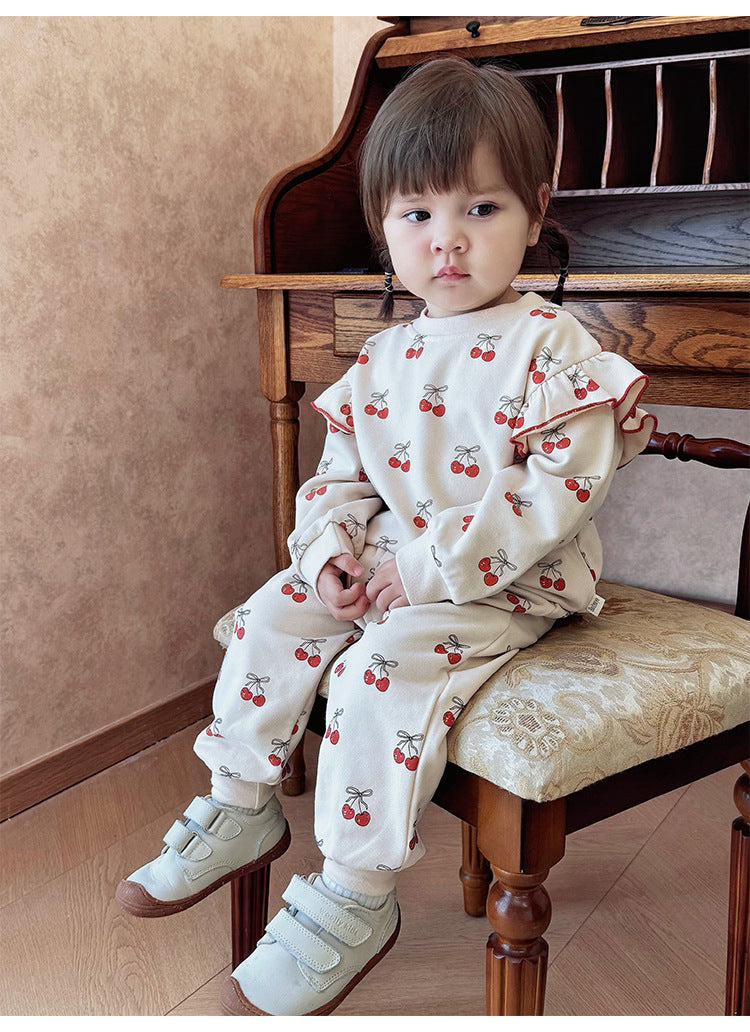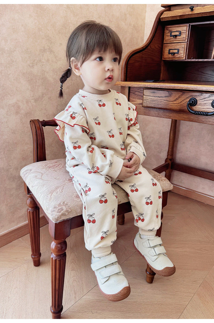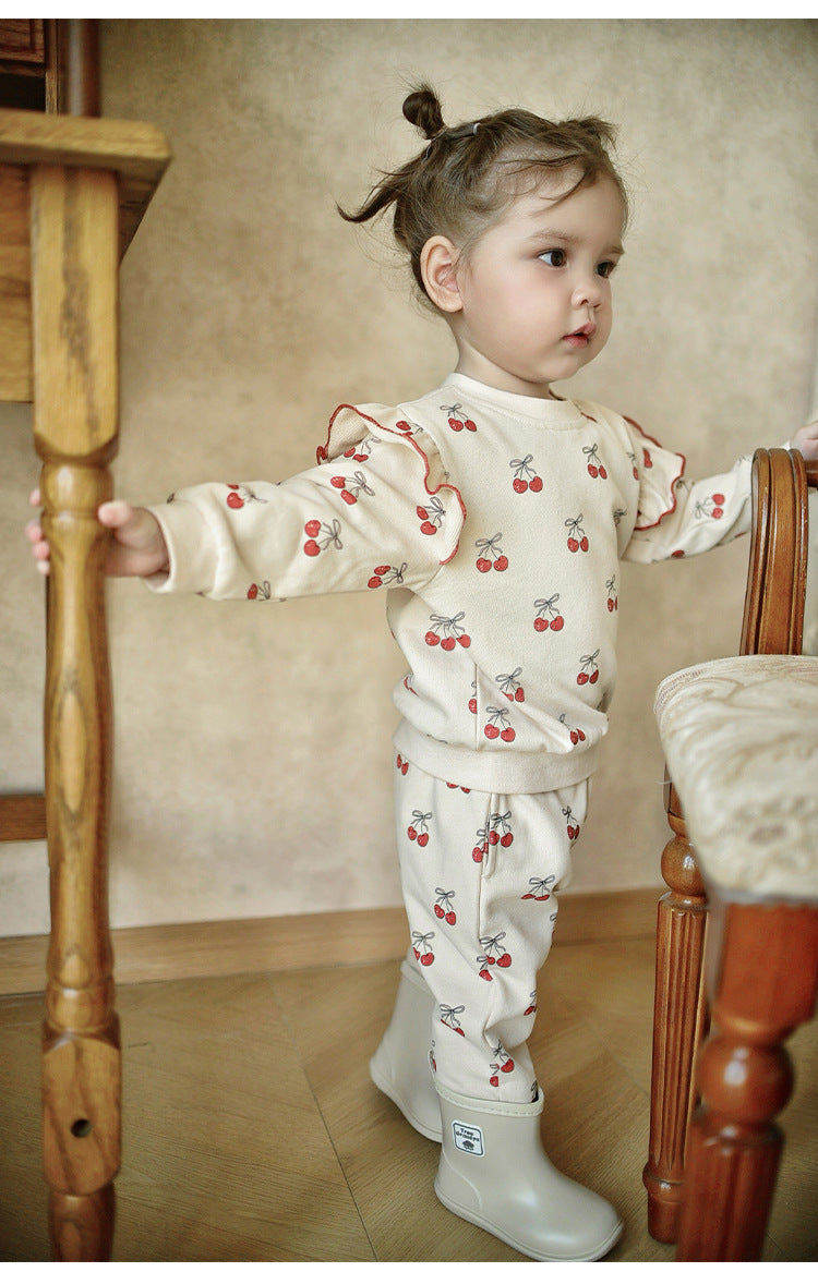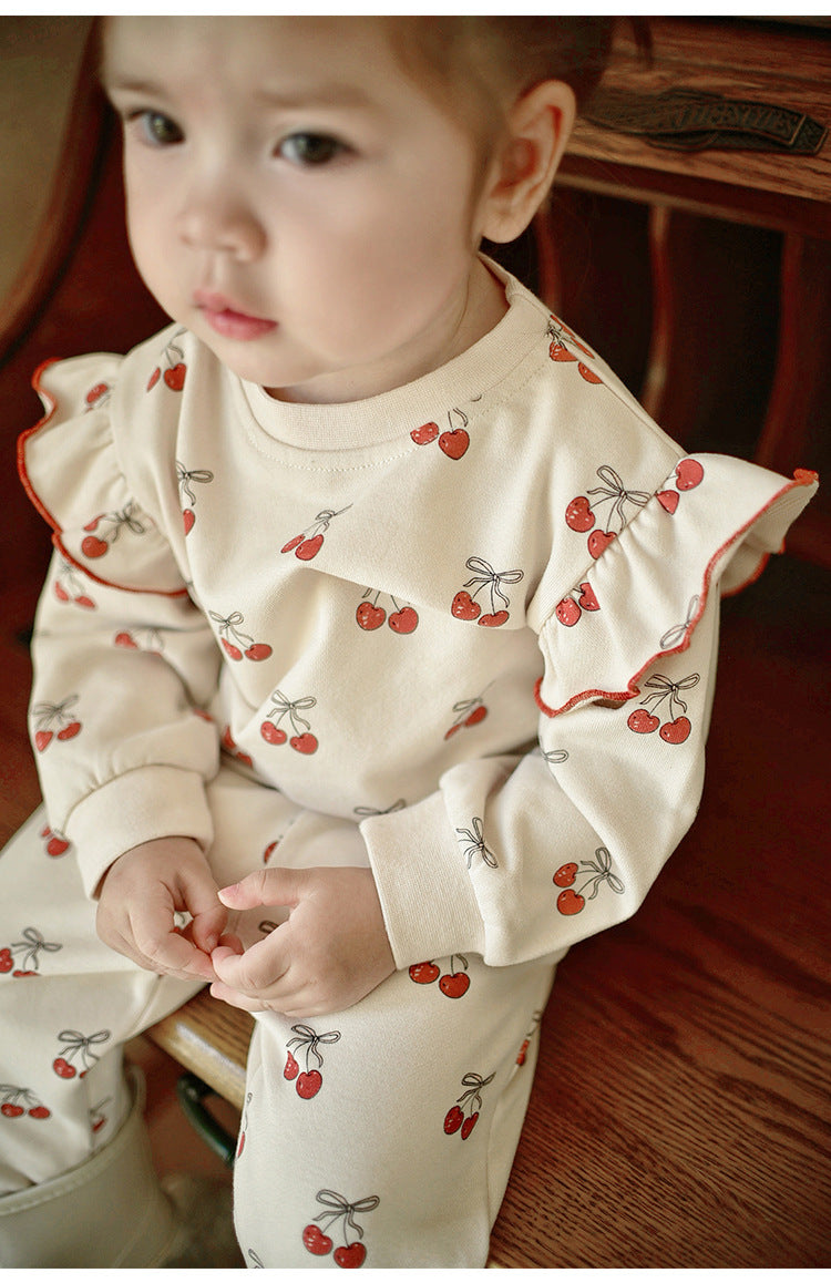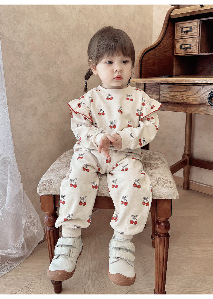 愛らしいチェリープリントが散りばめられたフリル付きスウェットシャツと、着回しやすいスウェットパンツのセットアップです。北欧デザインのエッセンスを取り入れたこの長袖子ども服は、普段のお出かけをスタイリッシュに演出します。動きやすいのに洗練された印象を与えるデザインで、ベビー服として重ね着にも適したトップスとパンツの二点セットです。