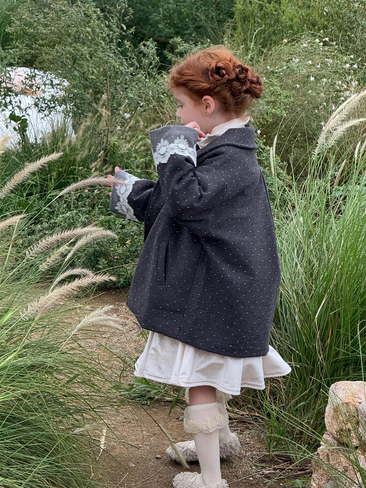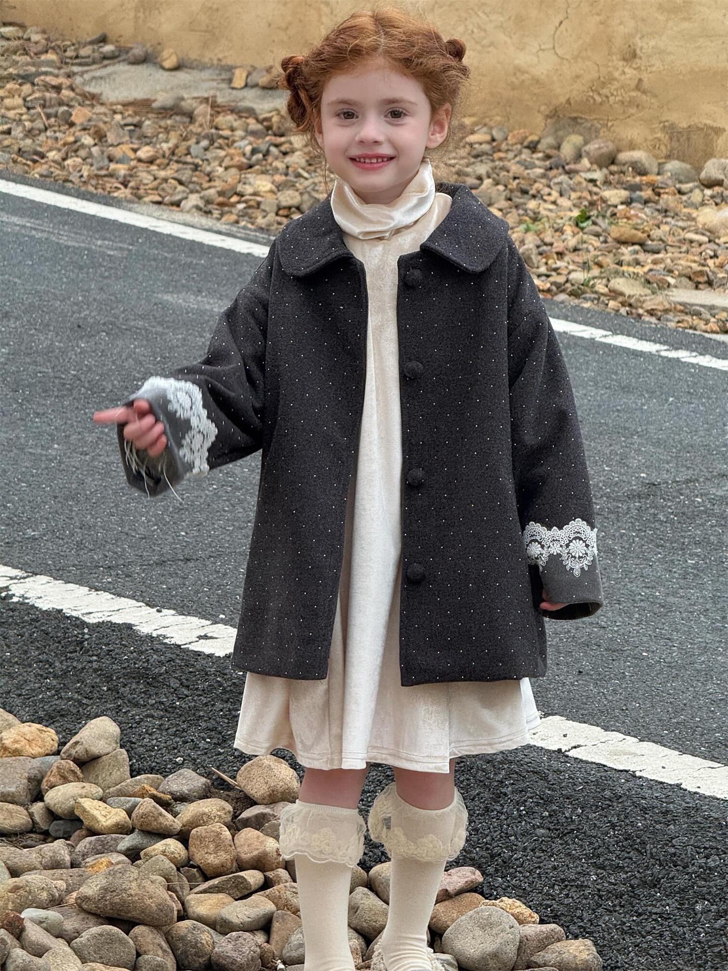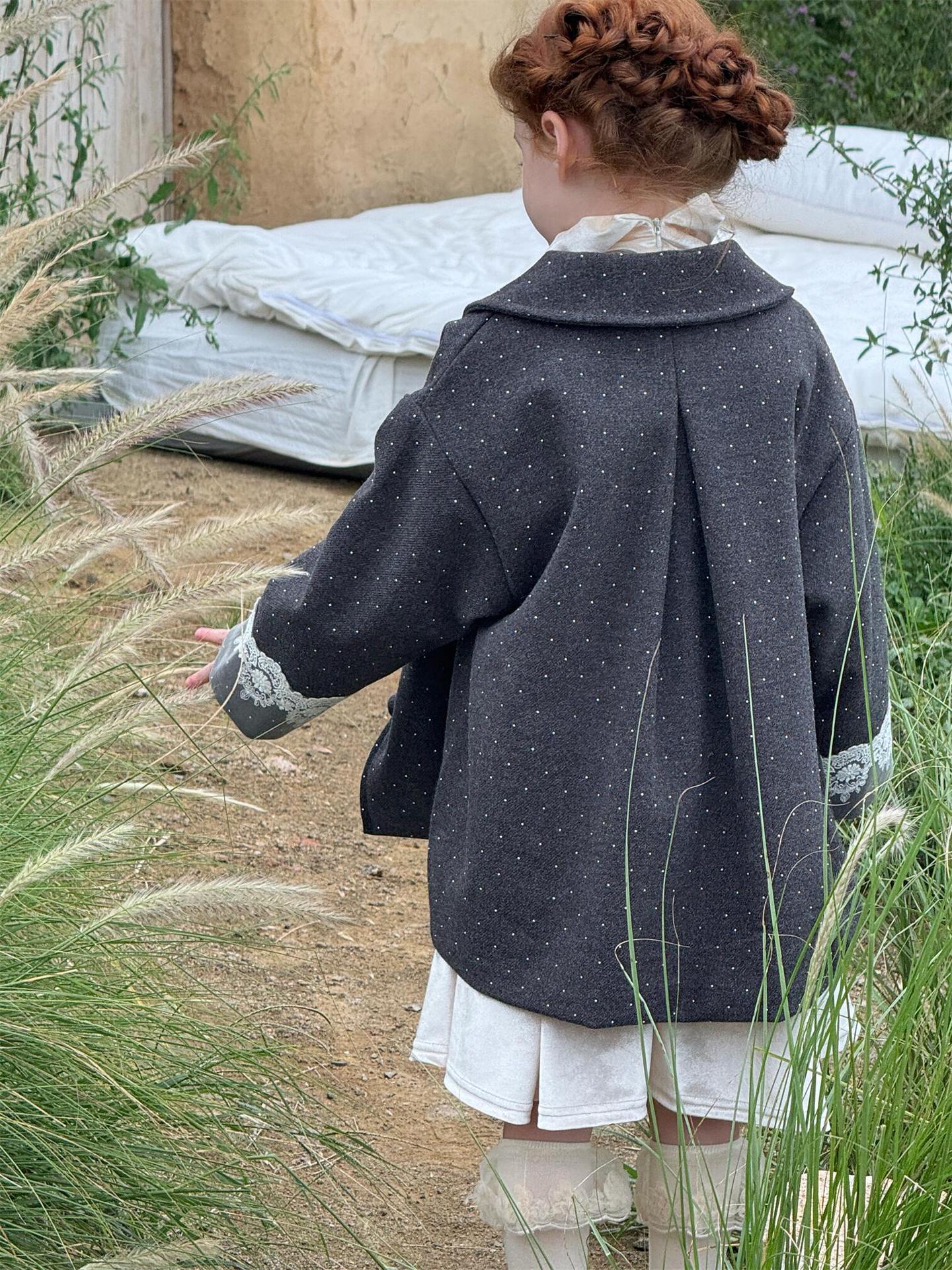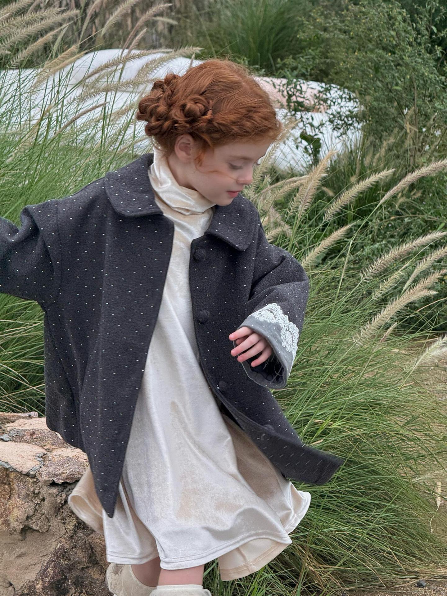 This mid-length coat is crafted from high-quality wool and features a sophisticated, muted gray color. The quilted lining ensures warmth and comfort. The rhinestones on the collar and pockets add a subtle sparkle, creating a casual yet glamorous look for children, perfect for elevating their style for cold-weather outings.