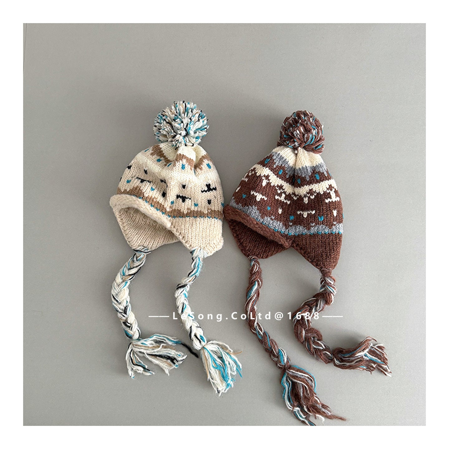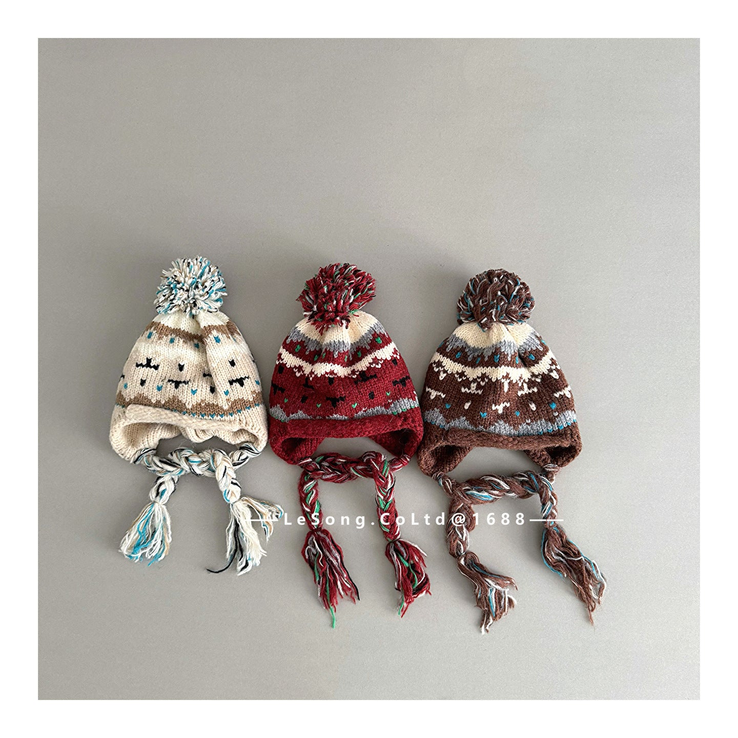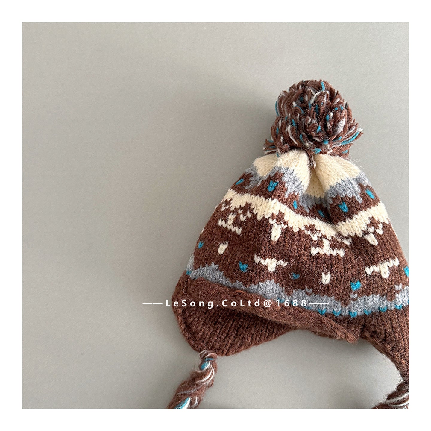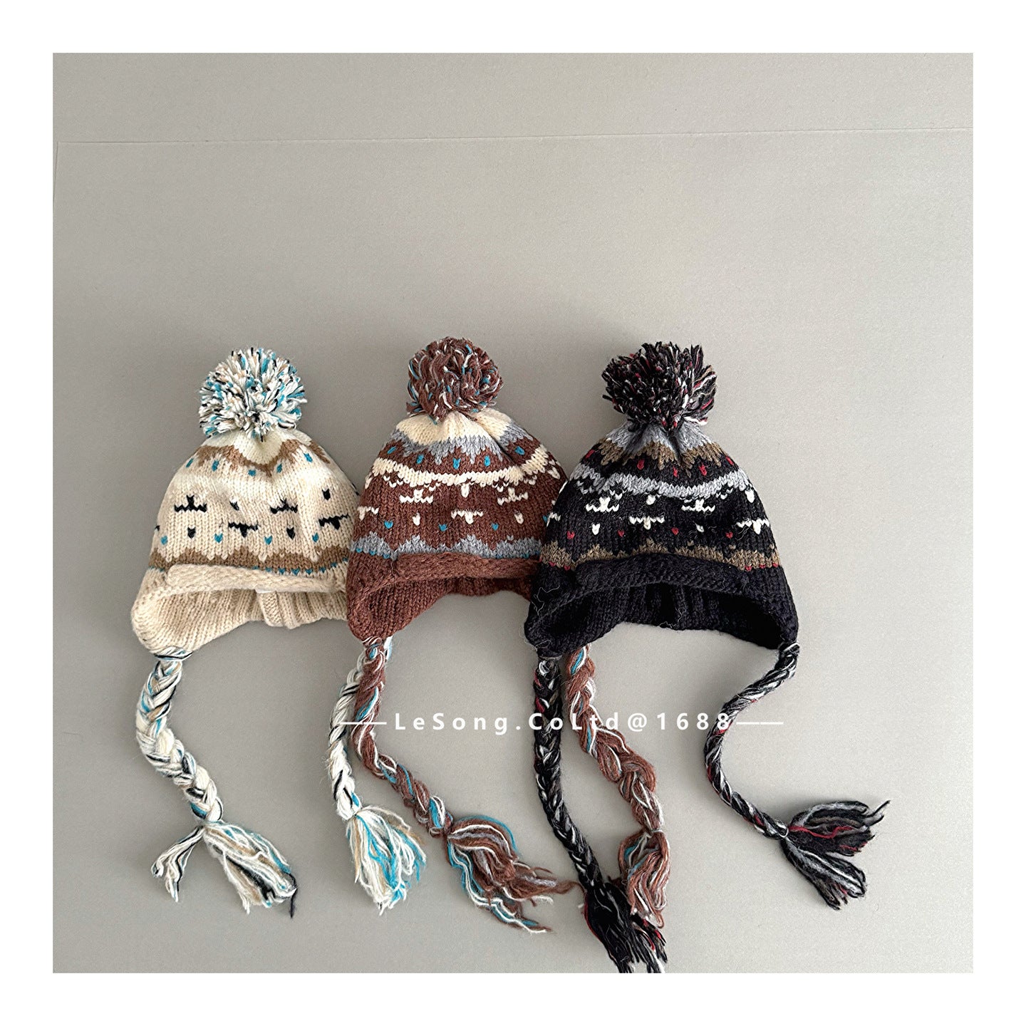 キッズ帽子 ジャカードニット ぽんぽん 耳当て付き 三つ編みコード【mh0011803】