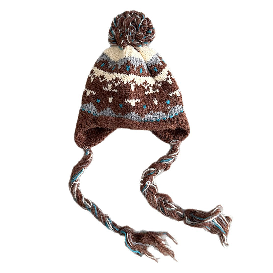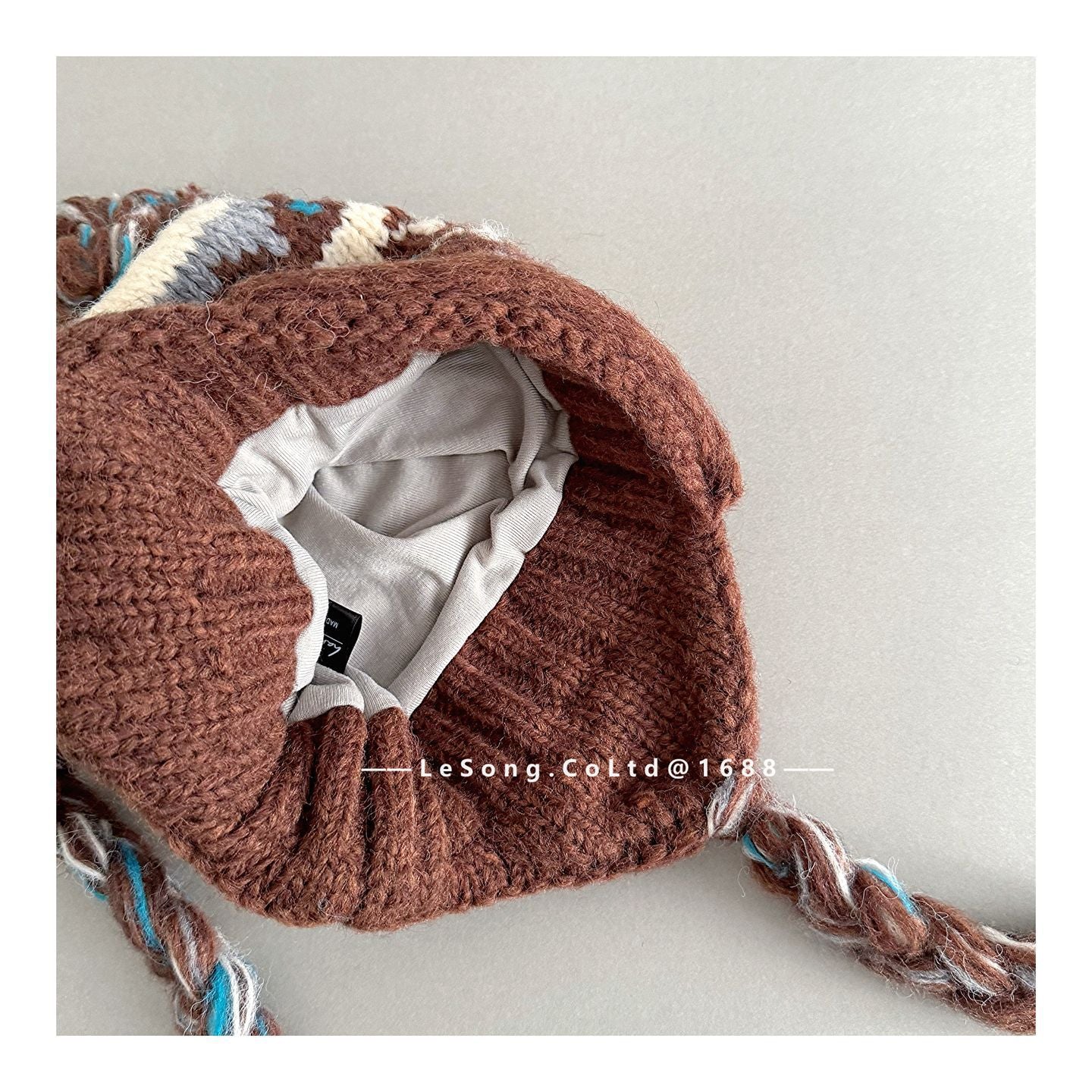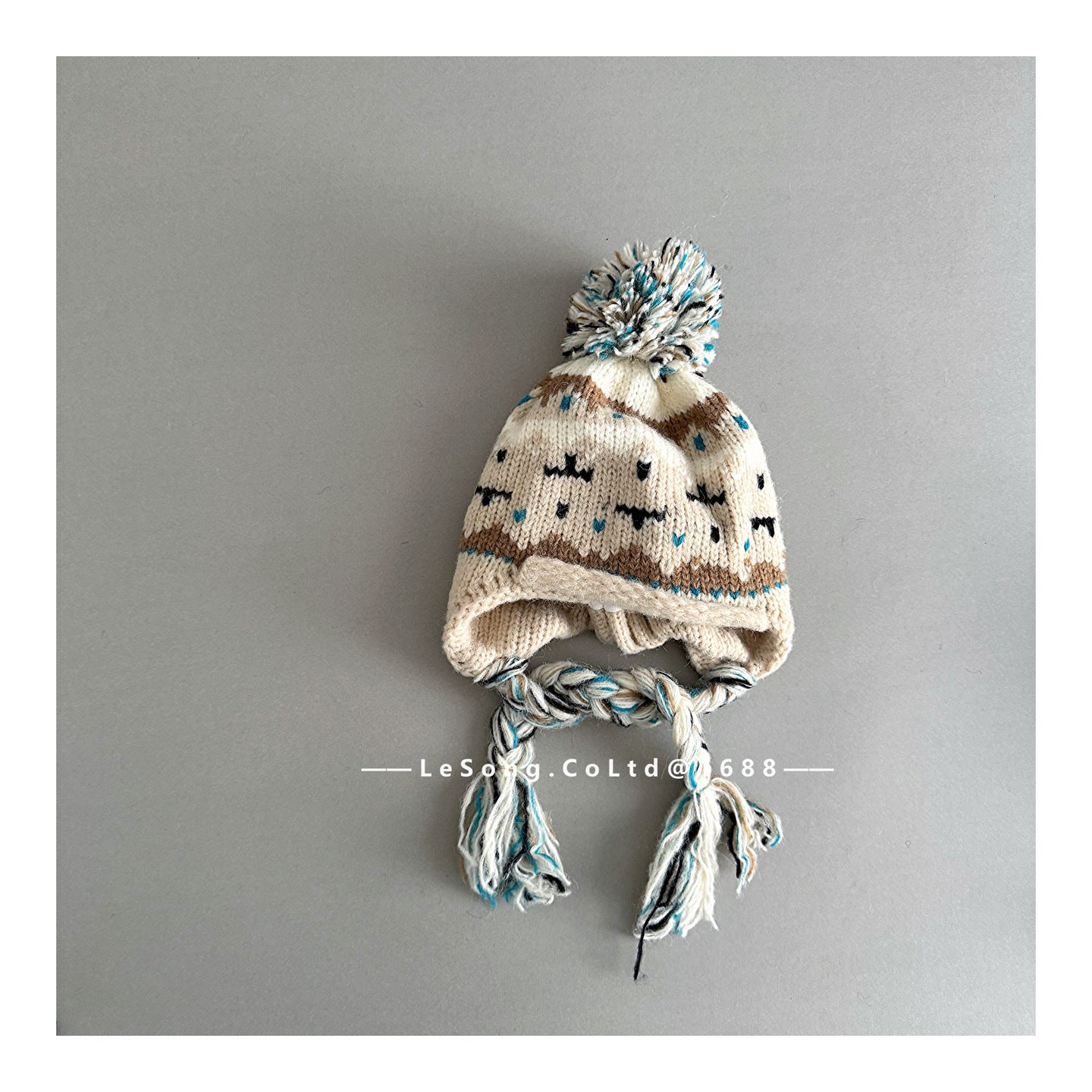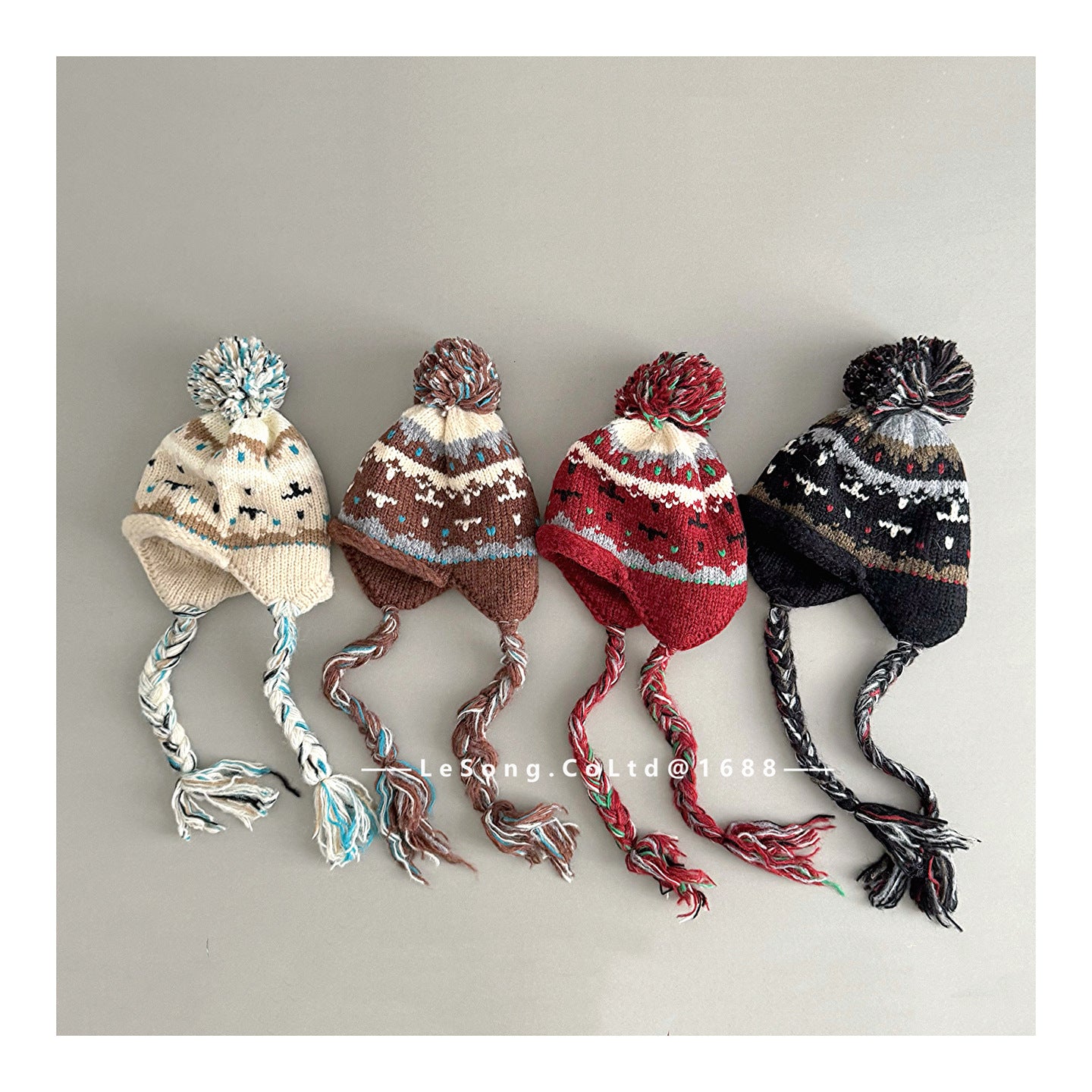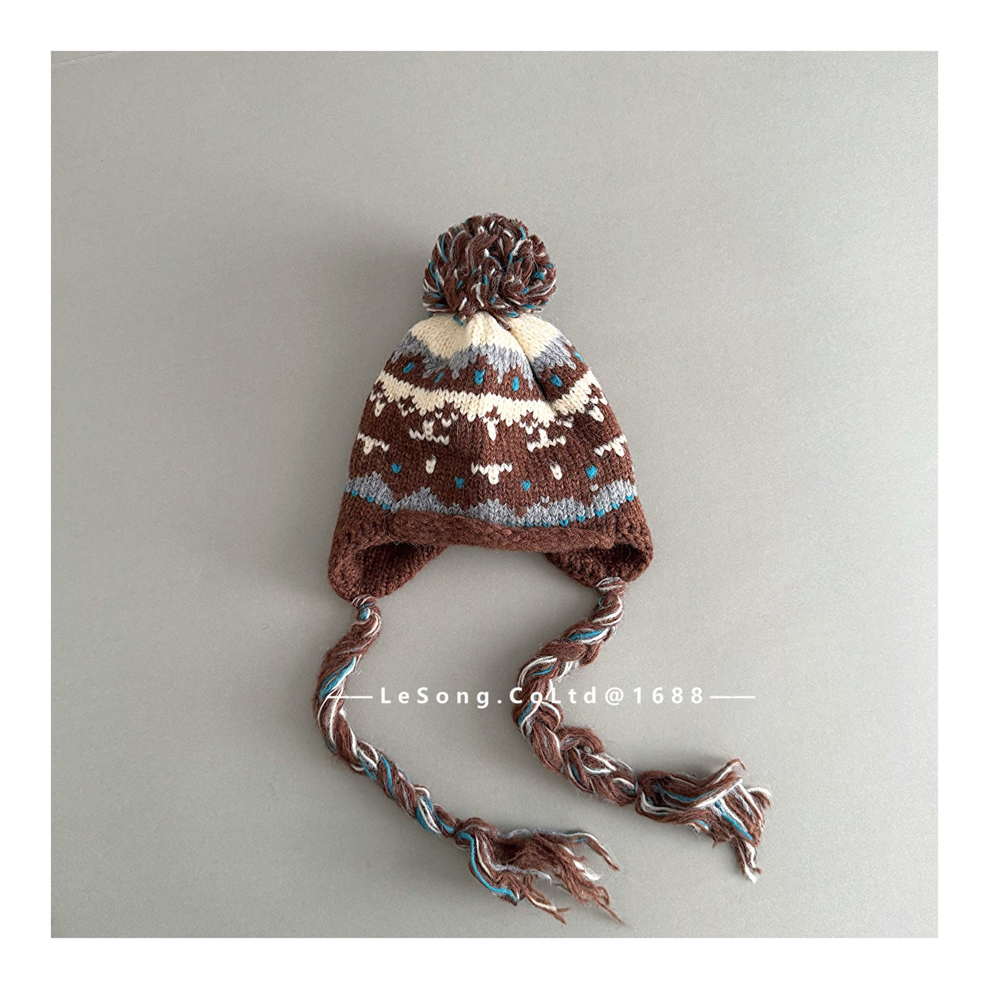キッズ帽子 ジャカードニット ぽんぽん 耳当て付き 三つ編みコード【mh0011803】