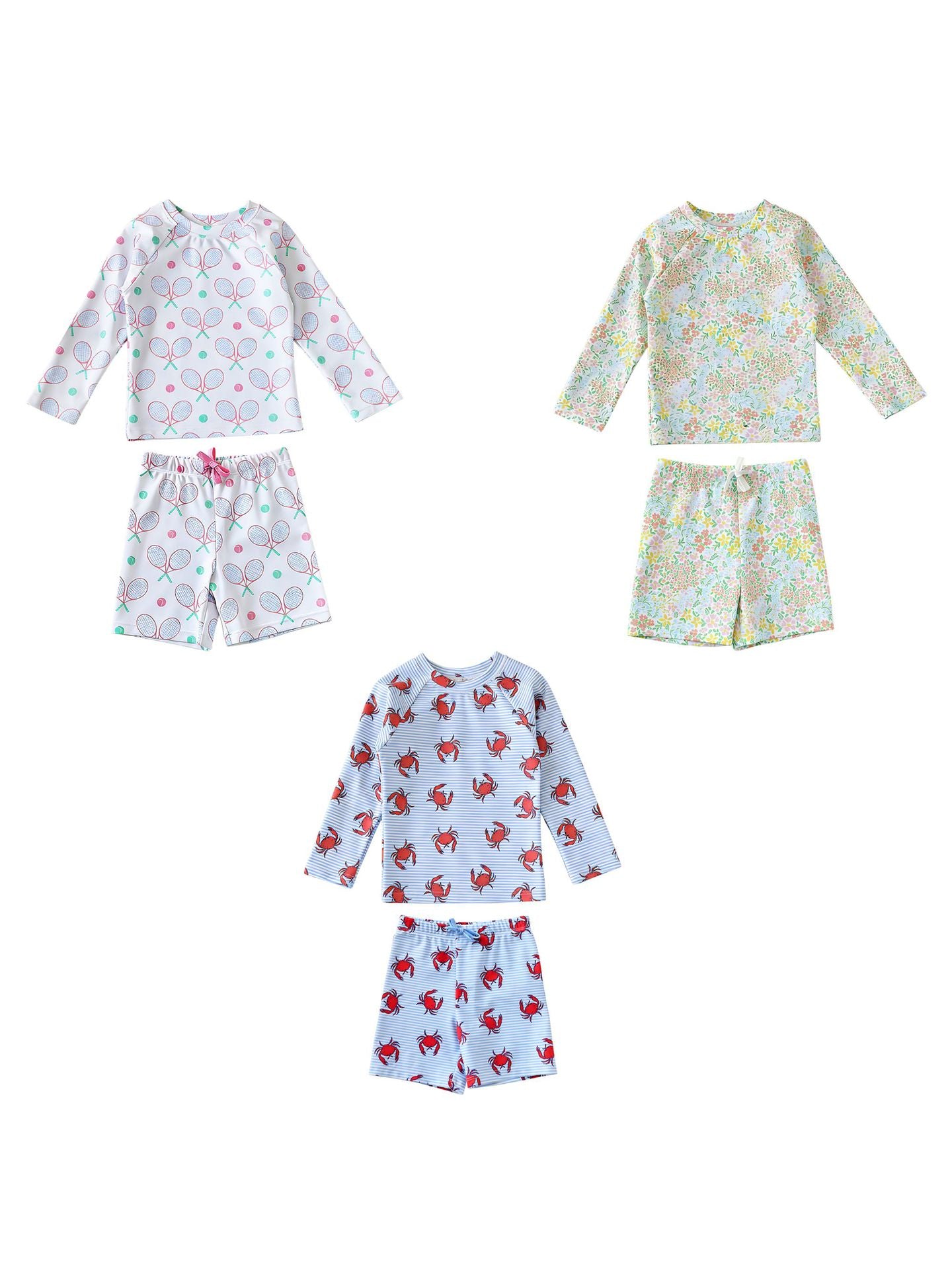 - Design: Long-sleeve rash guard & shorts with drawstring waist