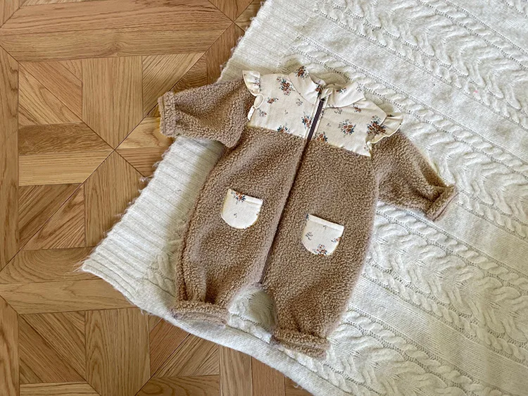 Mono de bebé de forro polar, de manga larga, con estampado floral y volantes, patchwork, color marrón claro.