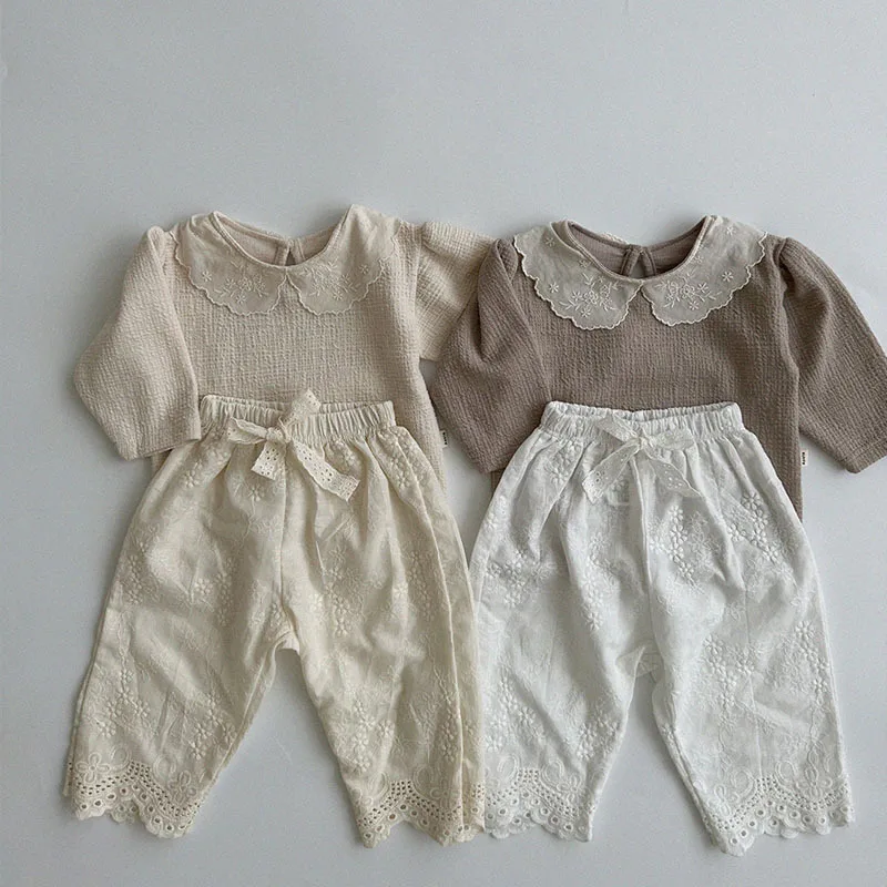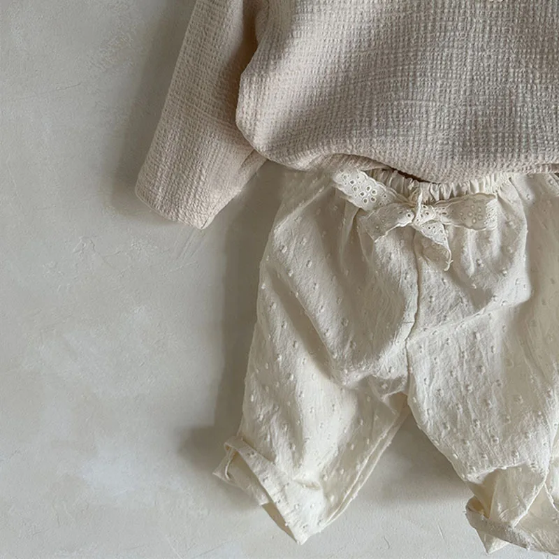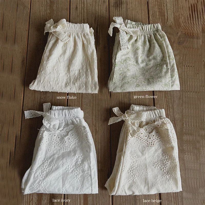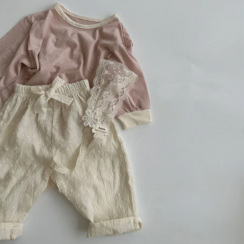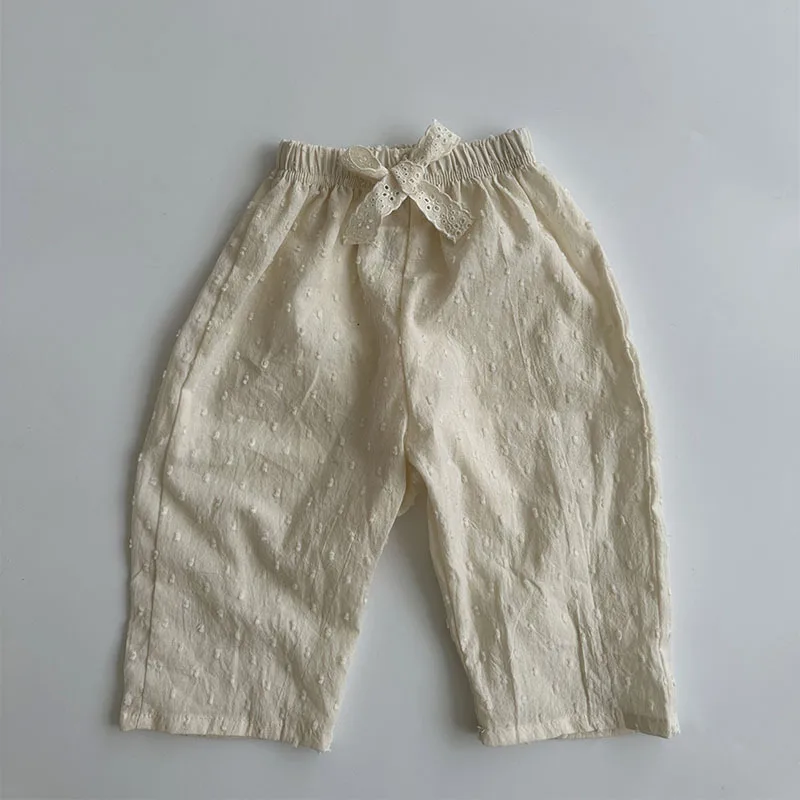 Pantalones de bebé, bordado de encaje, pantalones largos, cinta, pantalones de verano.