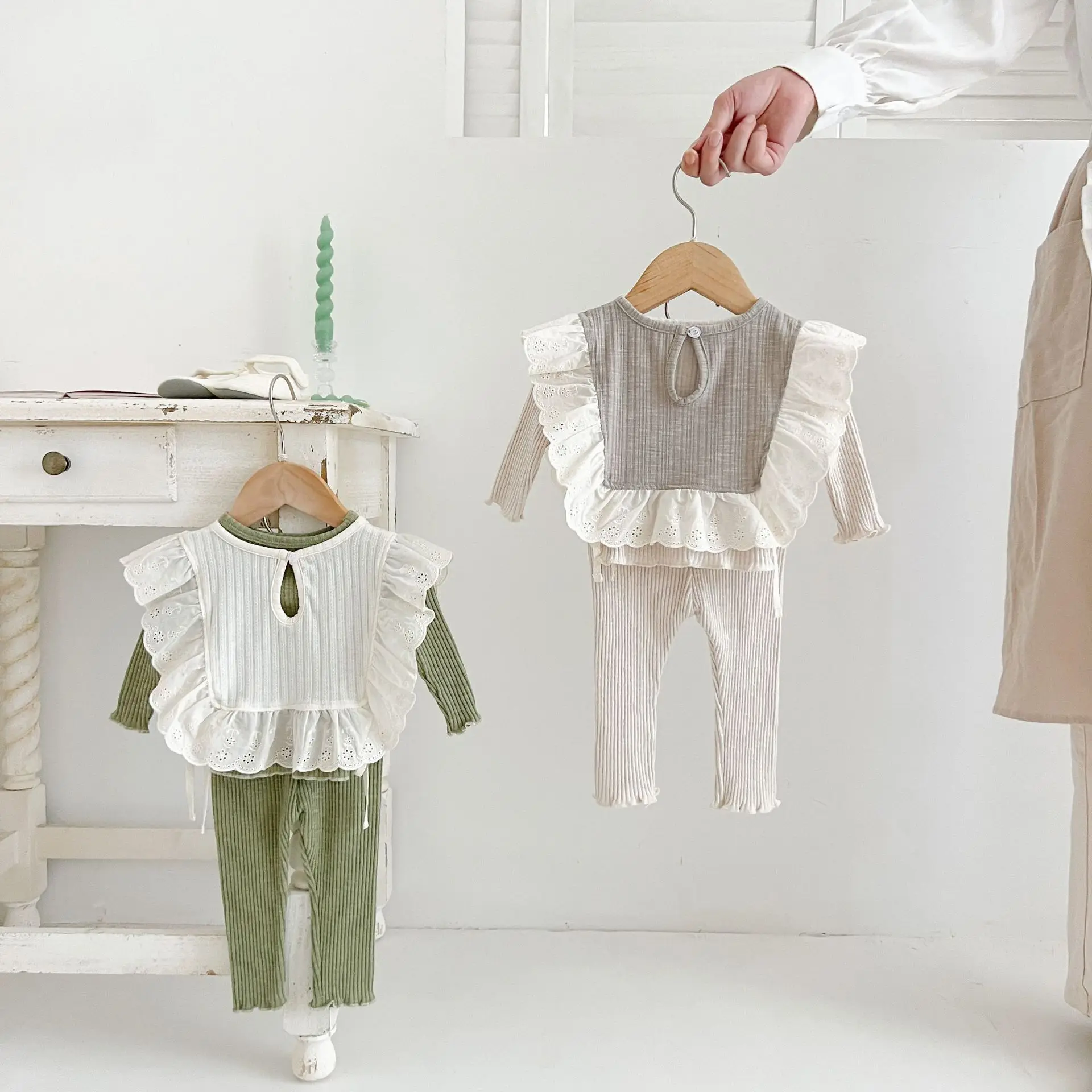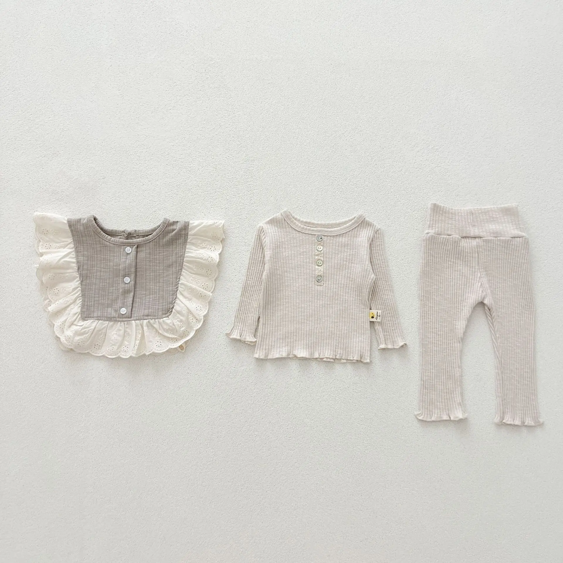 Conjunto de 3 piezas para bebé: camiseta de manga larga, pantalón largo y babero con volantes, 2 colores