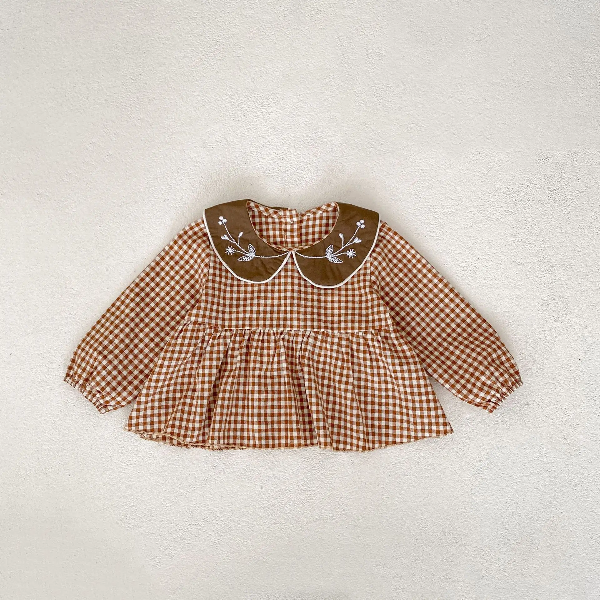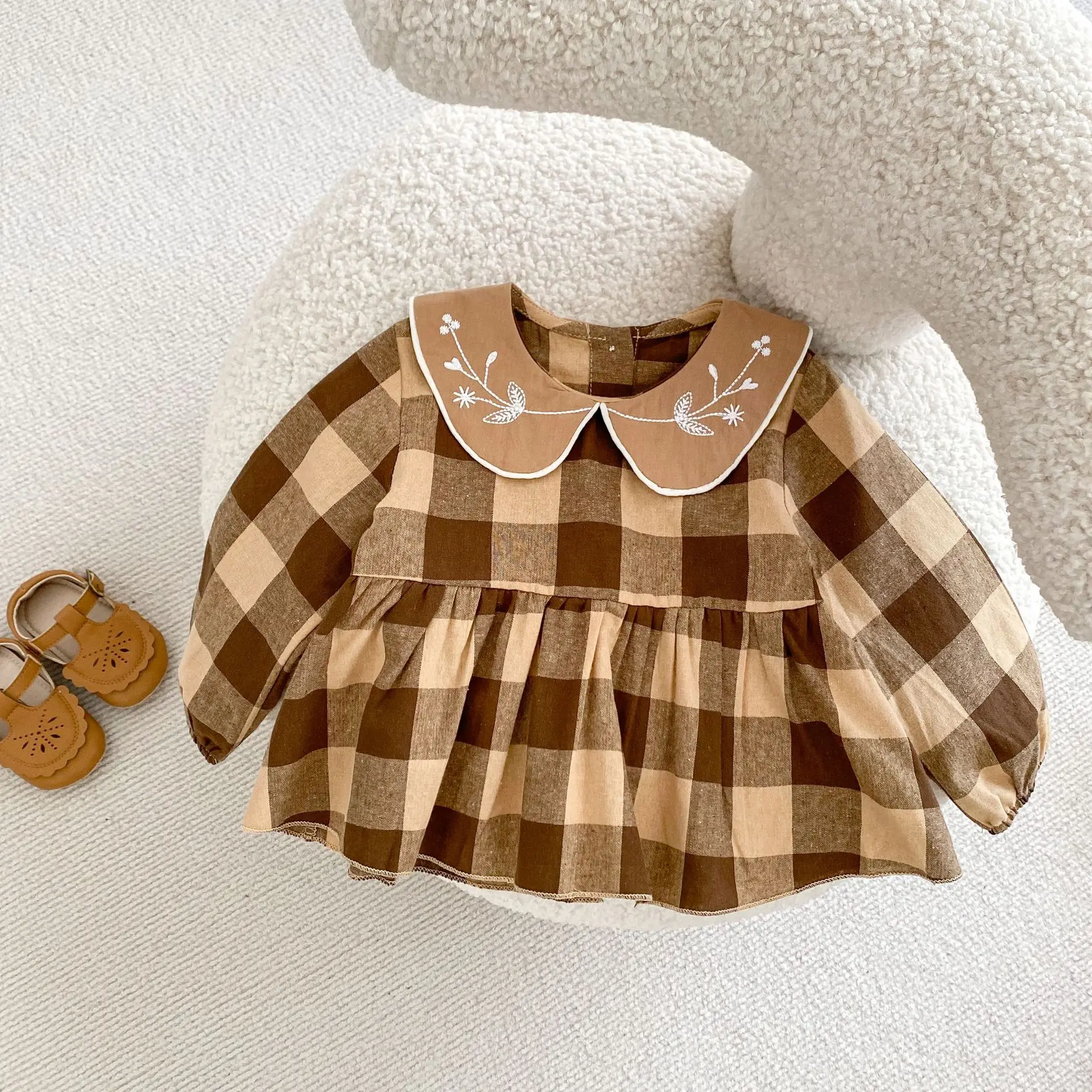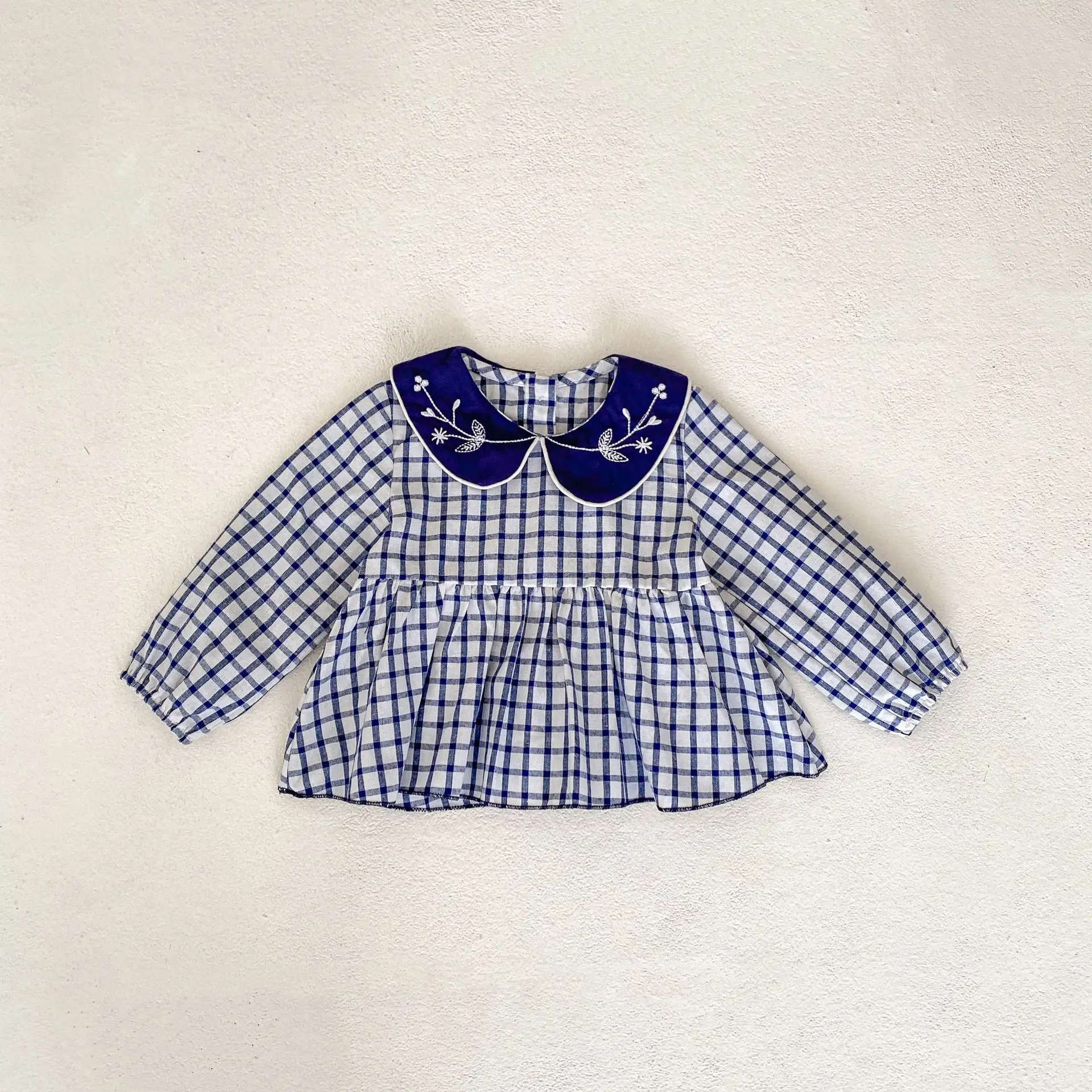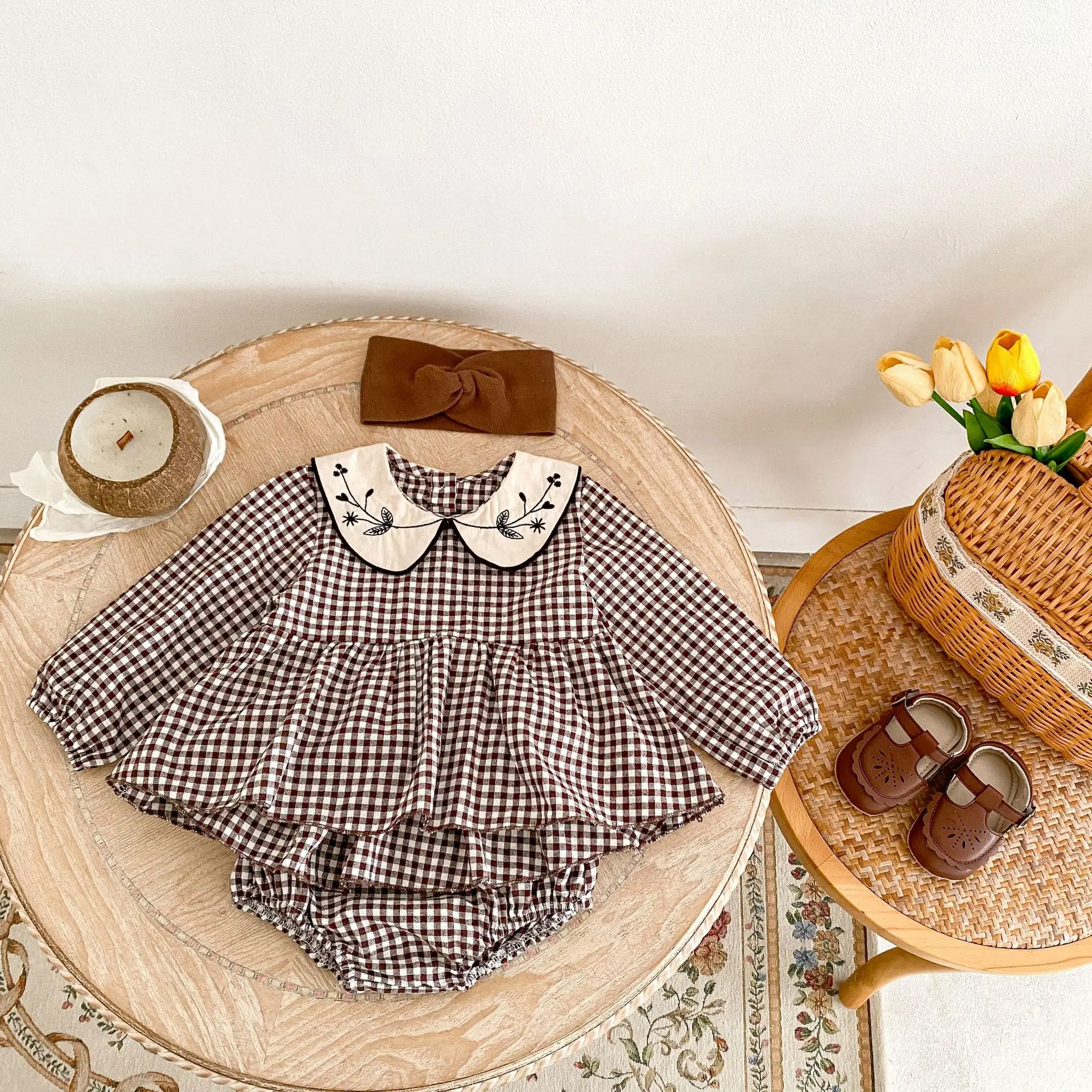 Conjunto de 2 piezas para bebé y niño, cuello bordado con flores, blusa tipo túnica de manga larga y falda con volantes, pantalones bombachos a cuadros en 4 colores