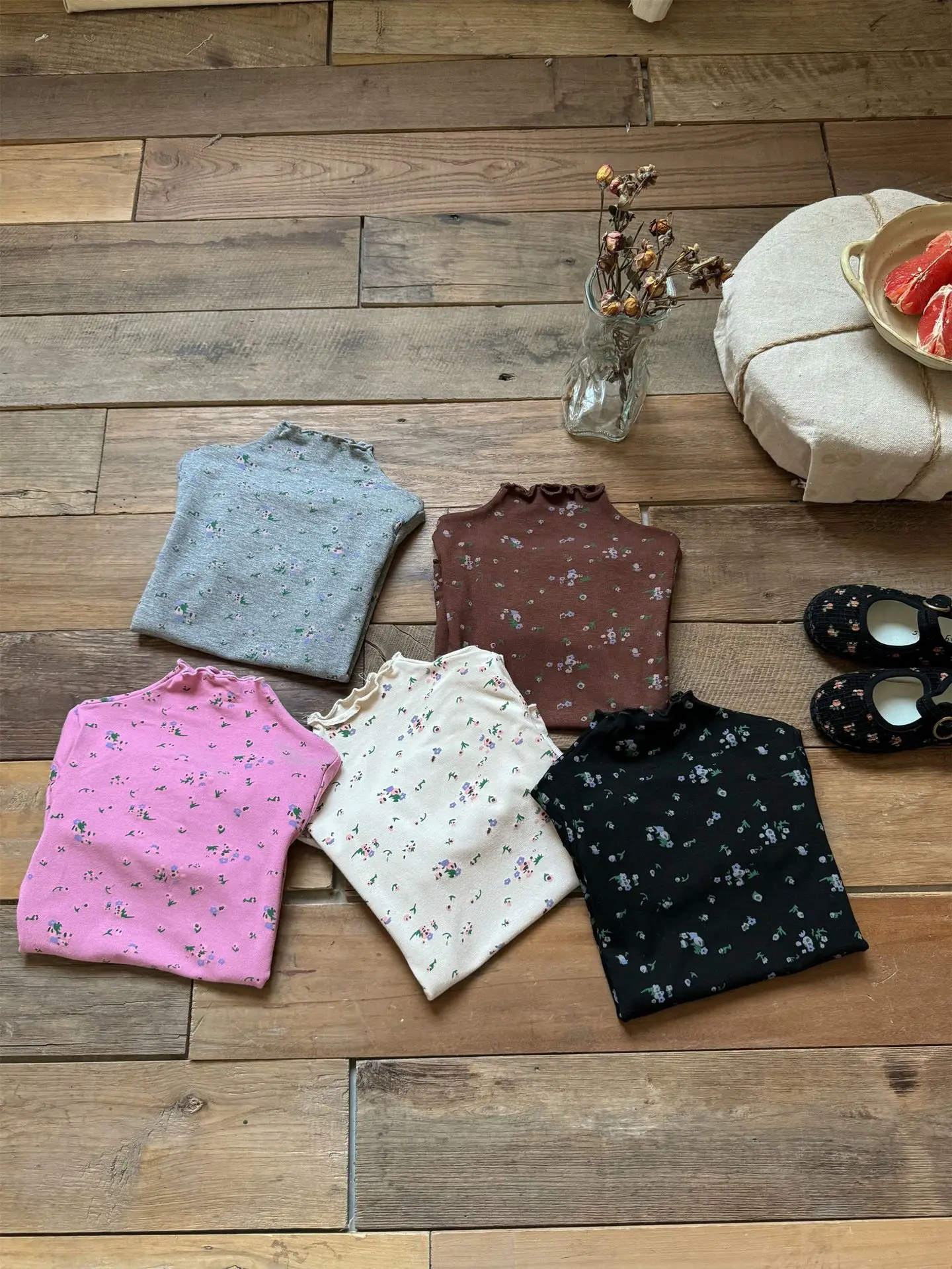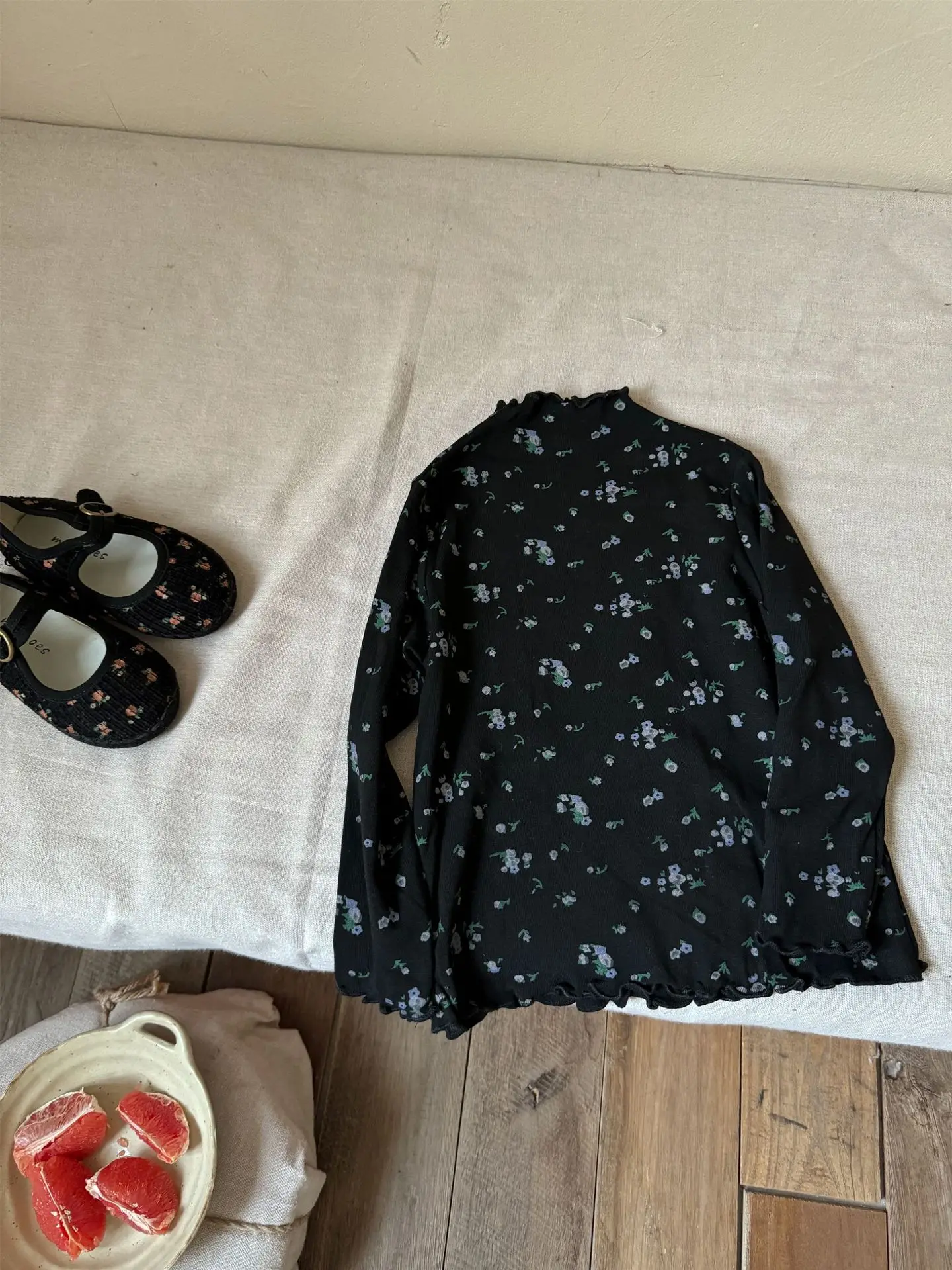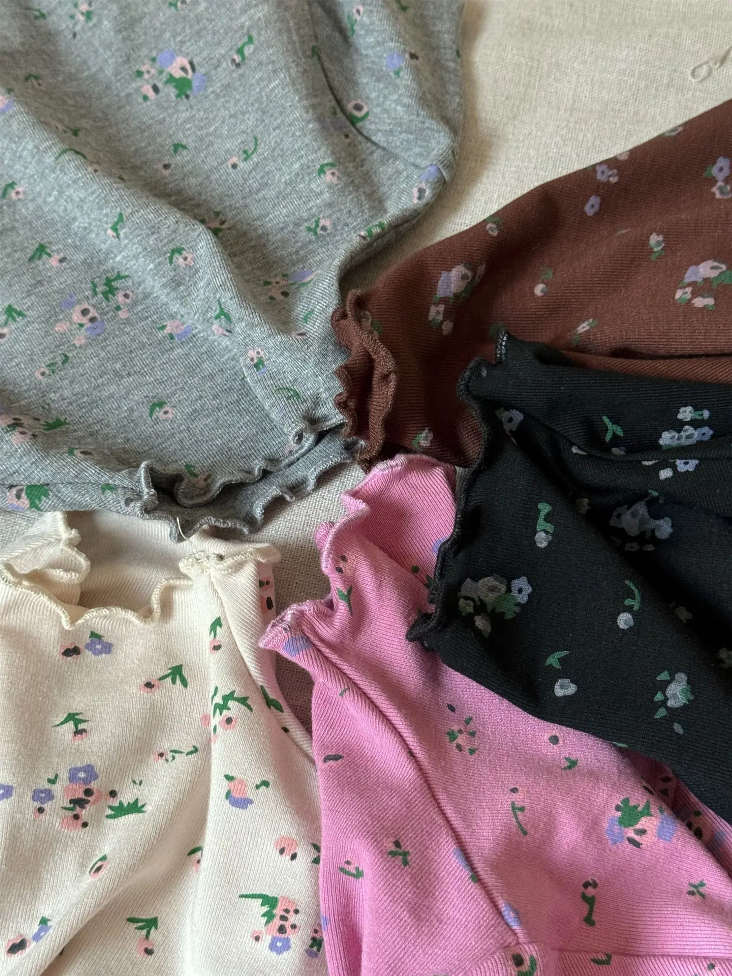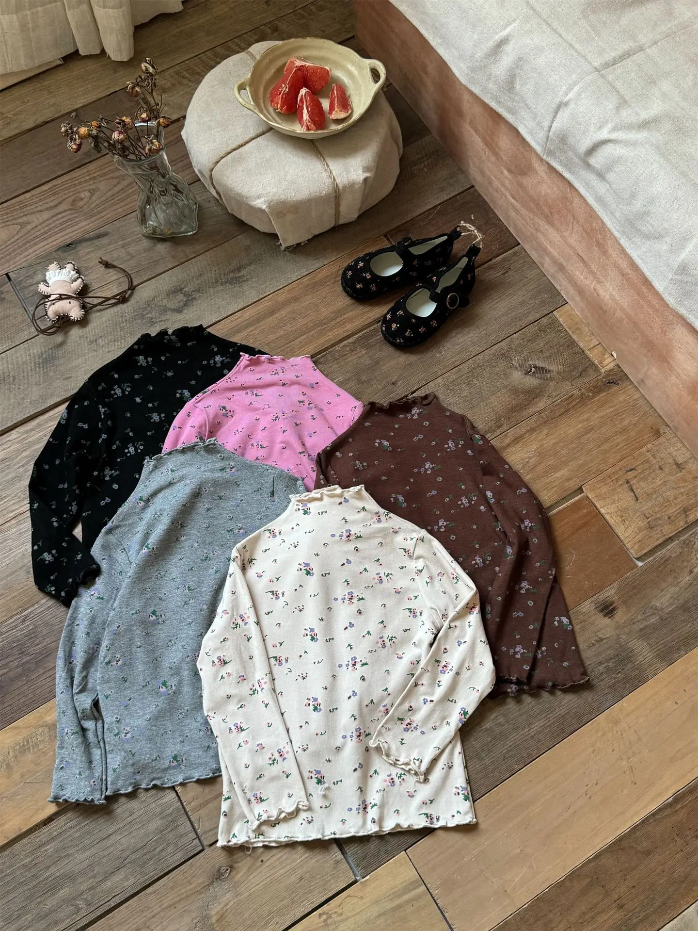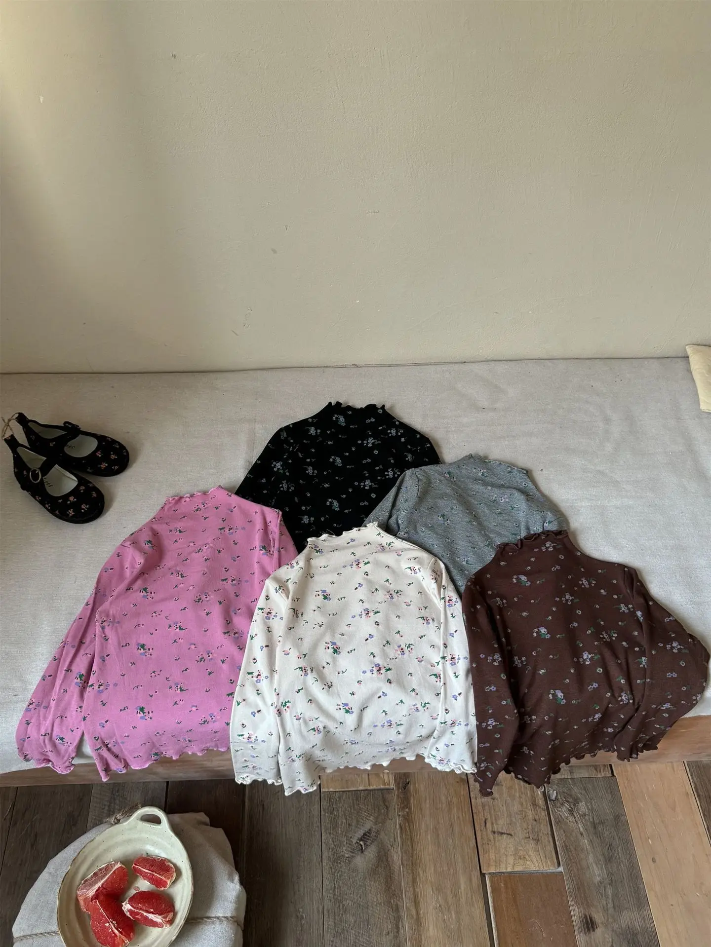Camiseta infantil de manga larga con cuello de botella y volantes, estampado floral, 5 colores [mh0007159]
