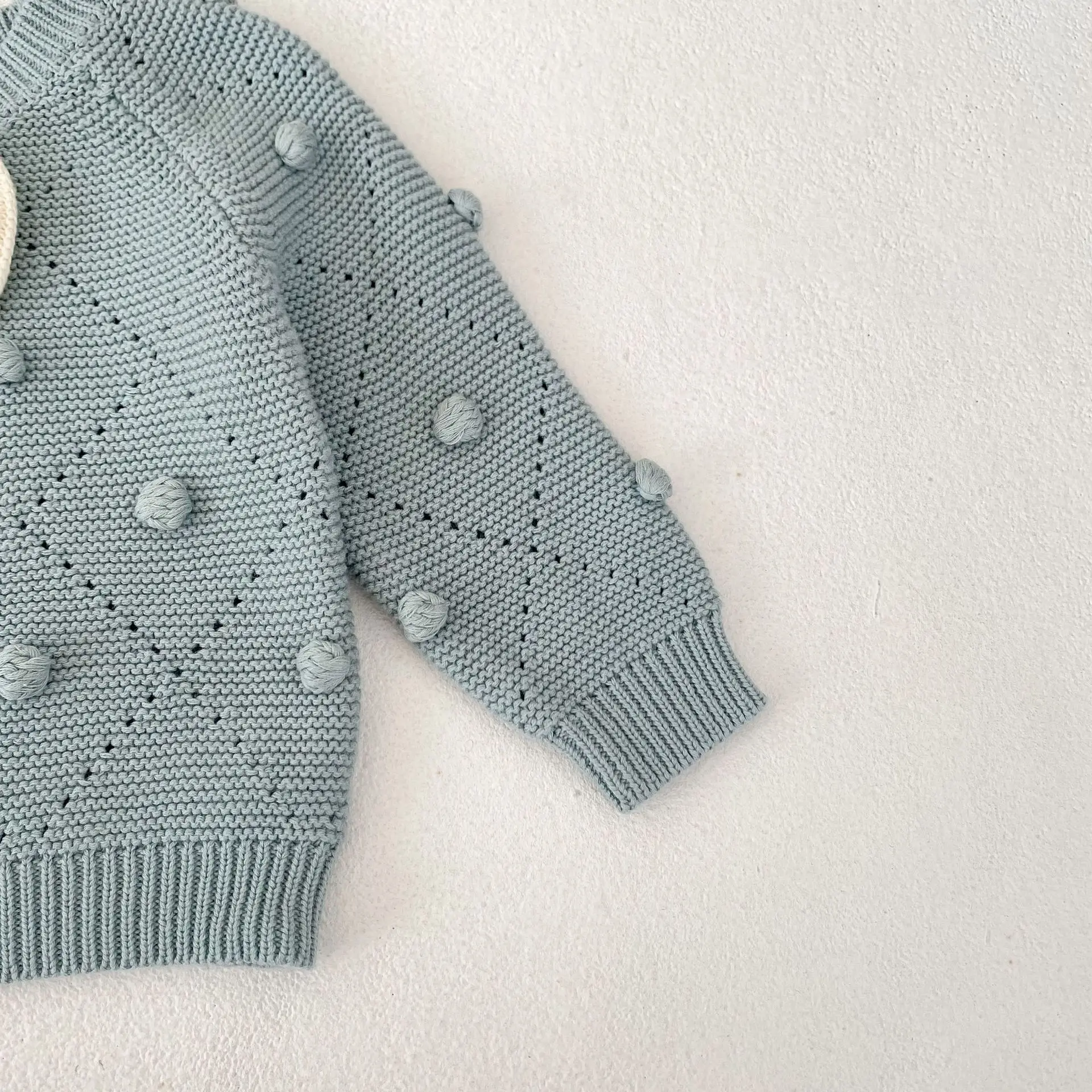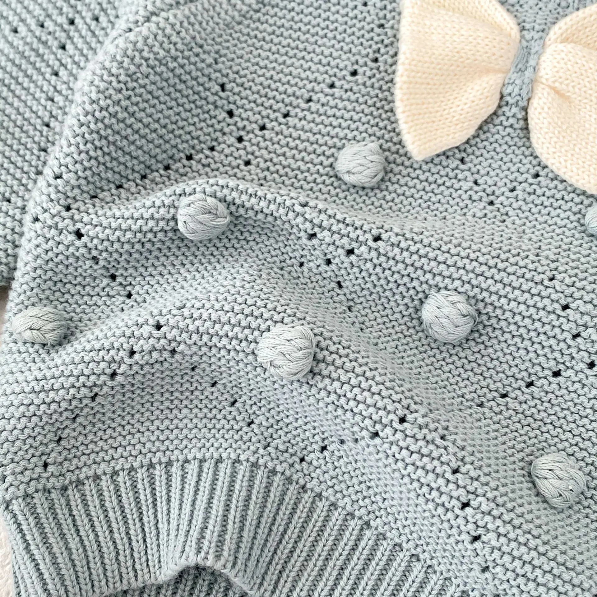 Este suéter de punto con lindas cintas y pompones es una prenda adorable para bebés. Su suave color azul es perfecto para conjuntos de otoño. El algodón es agradable al tacto y cómodo. El diseño está decorado con cintas y bolas, lo que le da un toque sencillo pero elegante. Es una prenda perfecta para el día a día y para salir, y combina con cualquier prenda inferior. Disfruta de un estilo adorable.