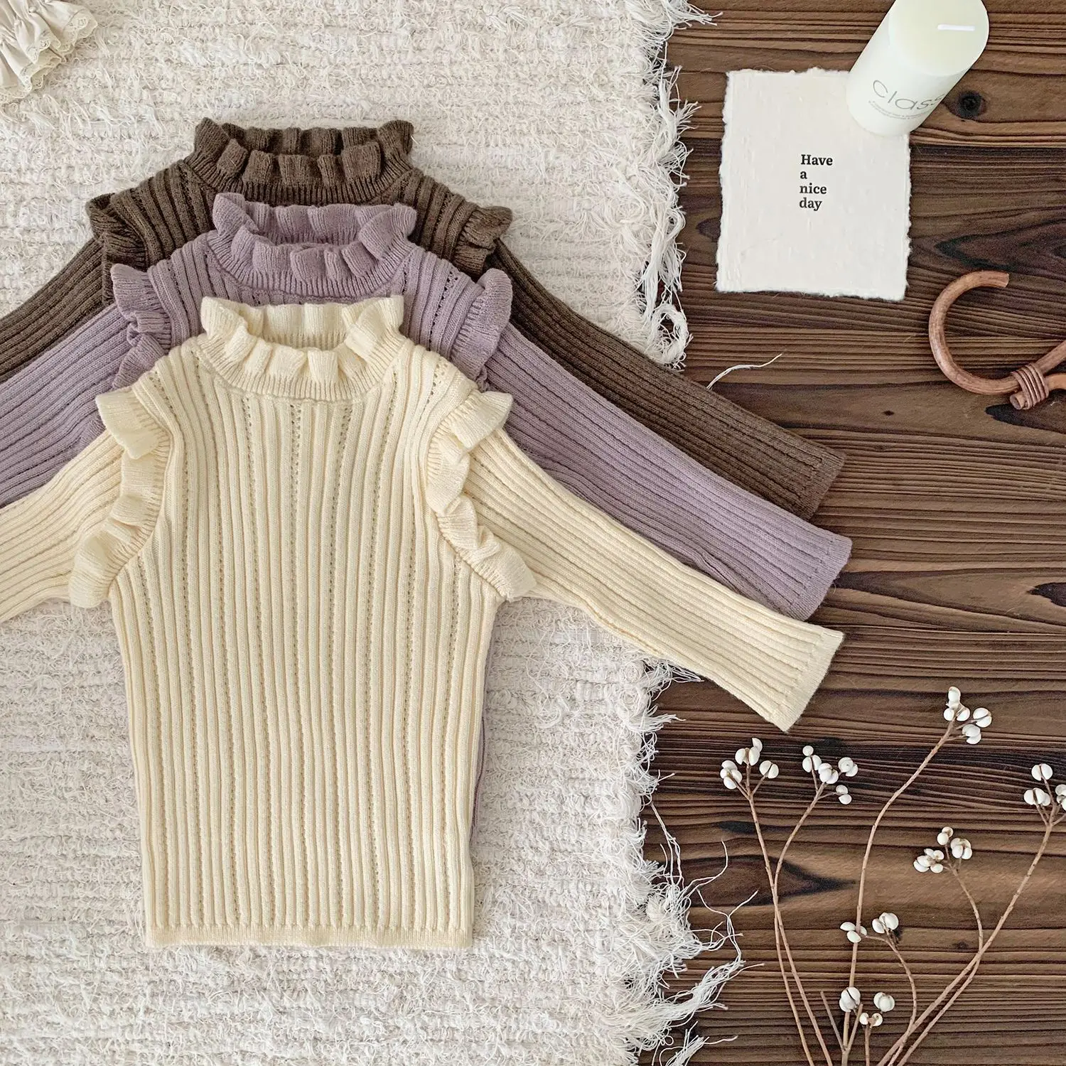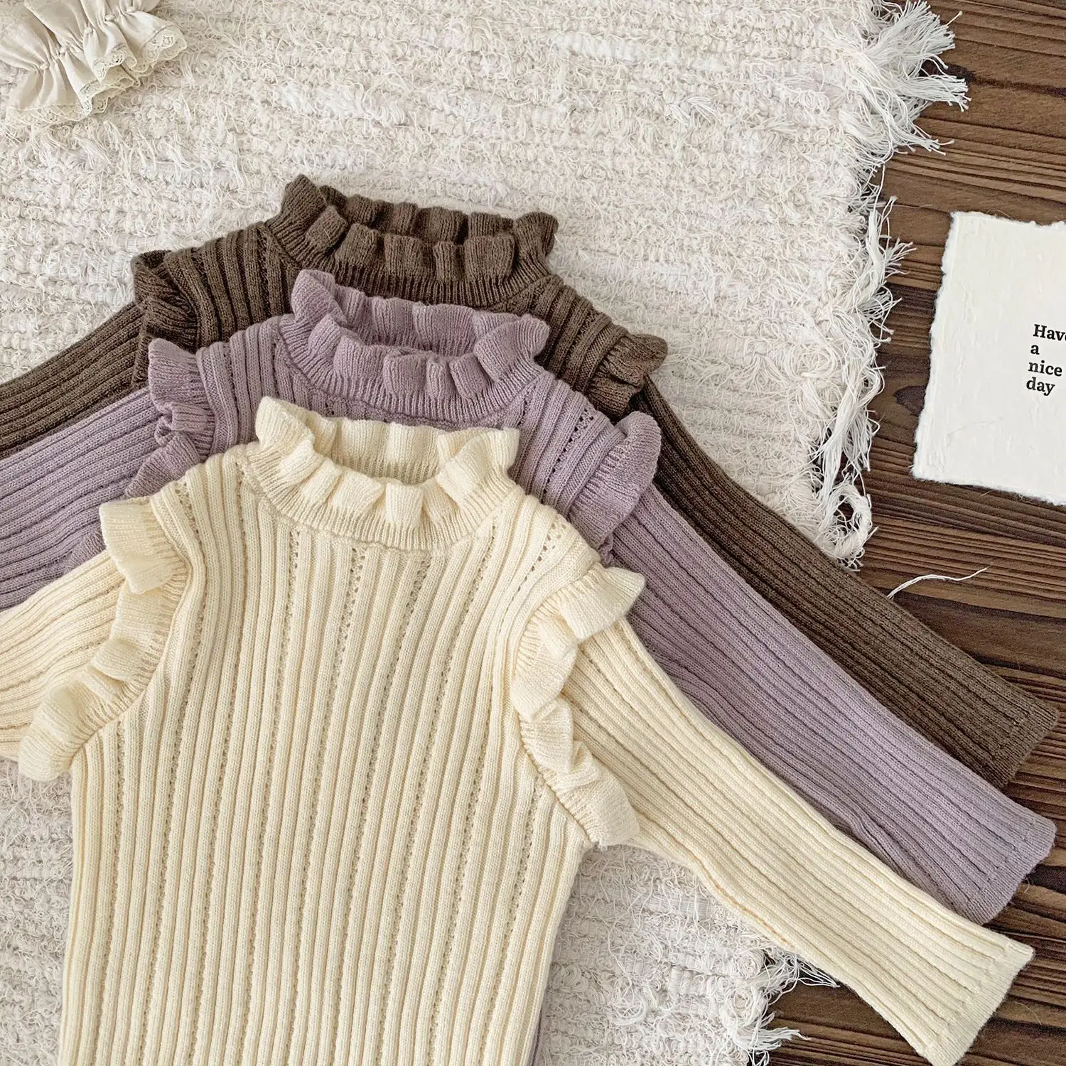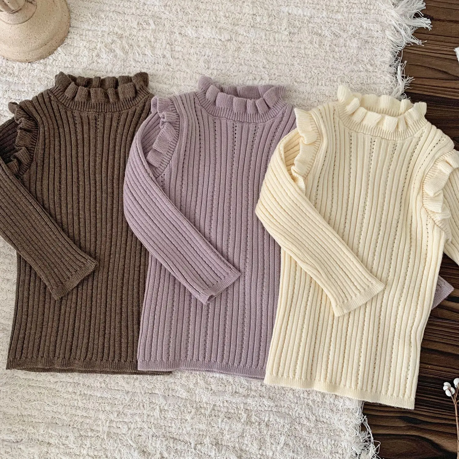 Camiseta de punto con cuello alto y volantes para bebés y niños, cortada y cosida, 3 colores