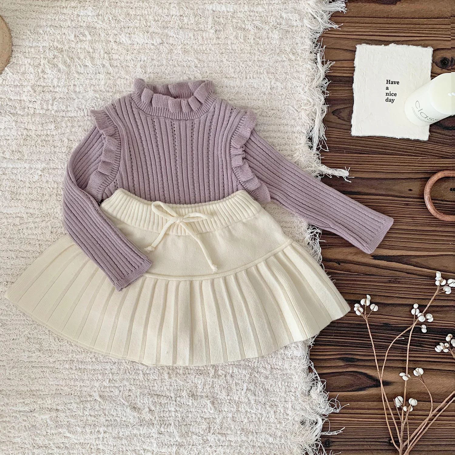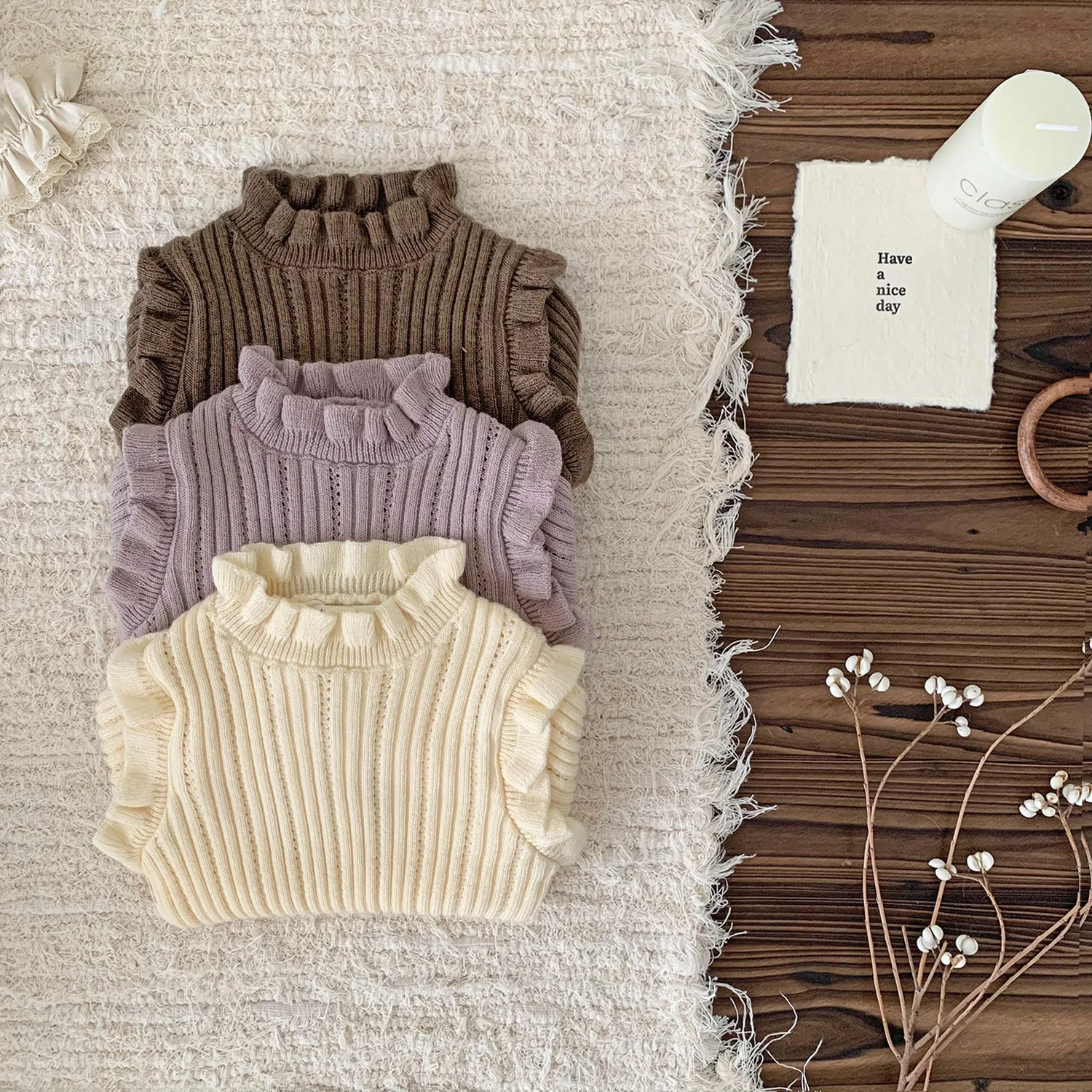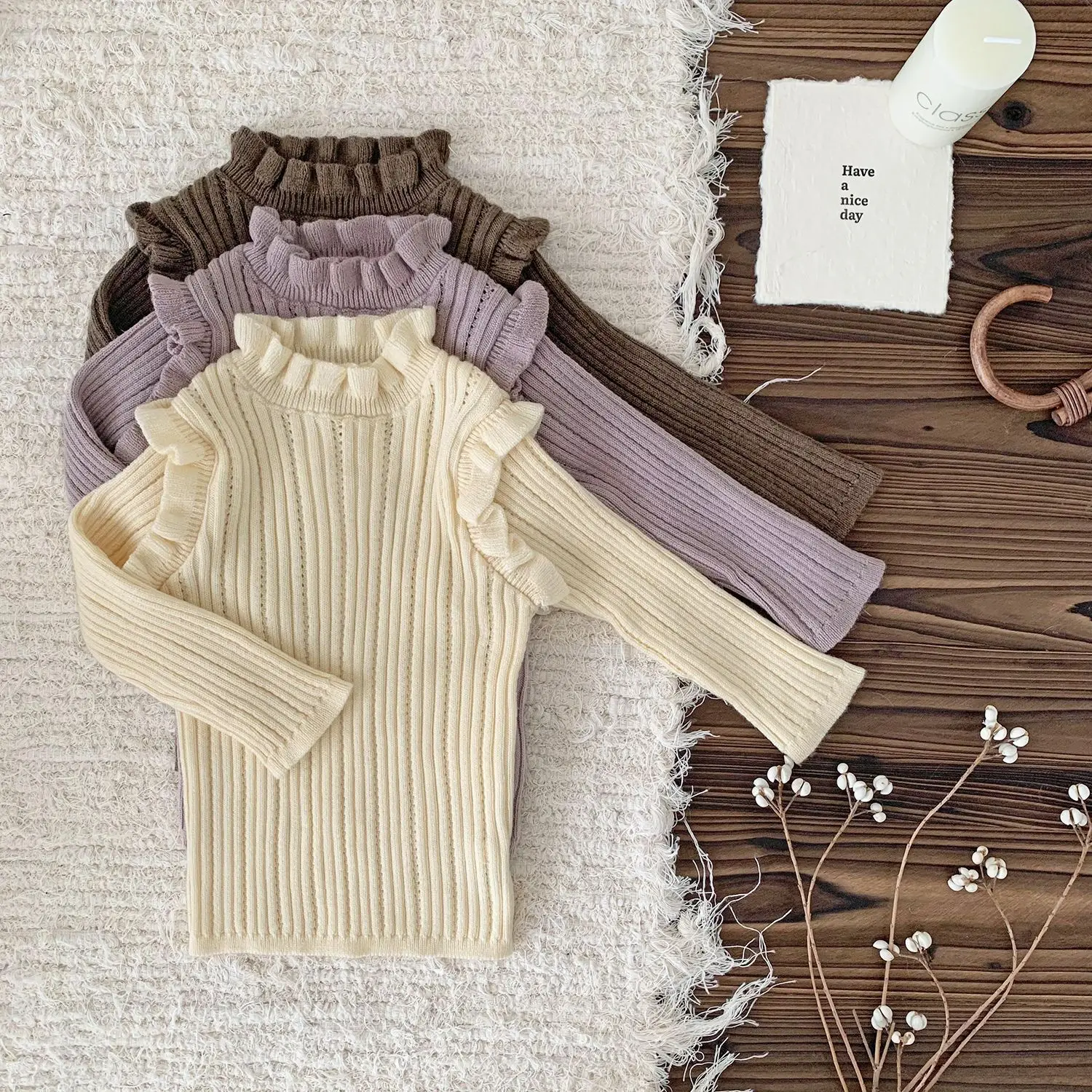 Camiseta de punto con cuello alto y volantes para bebés y niños, cortada y cosida, 3 colores