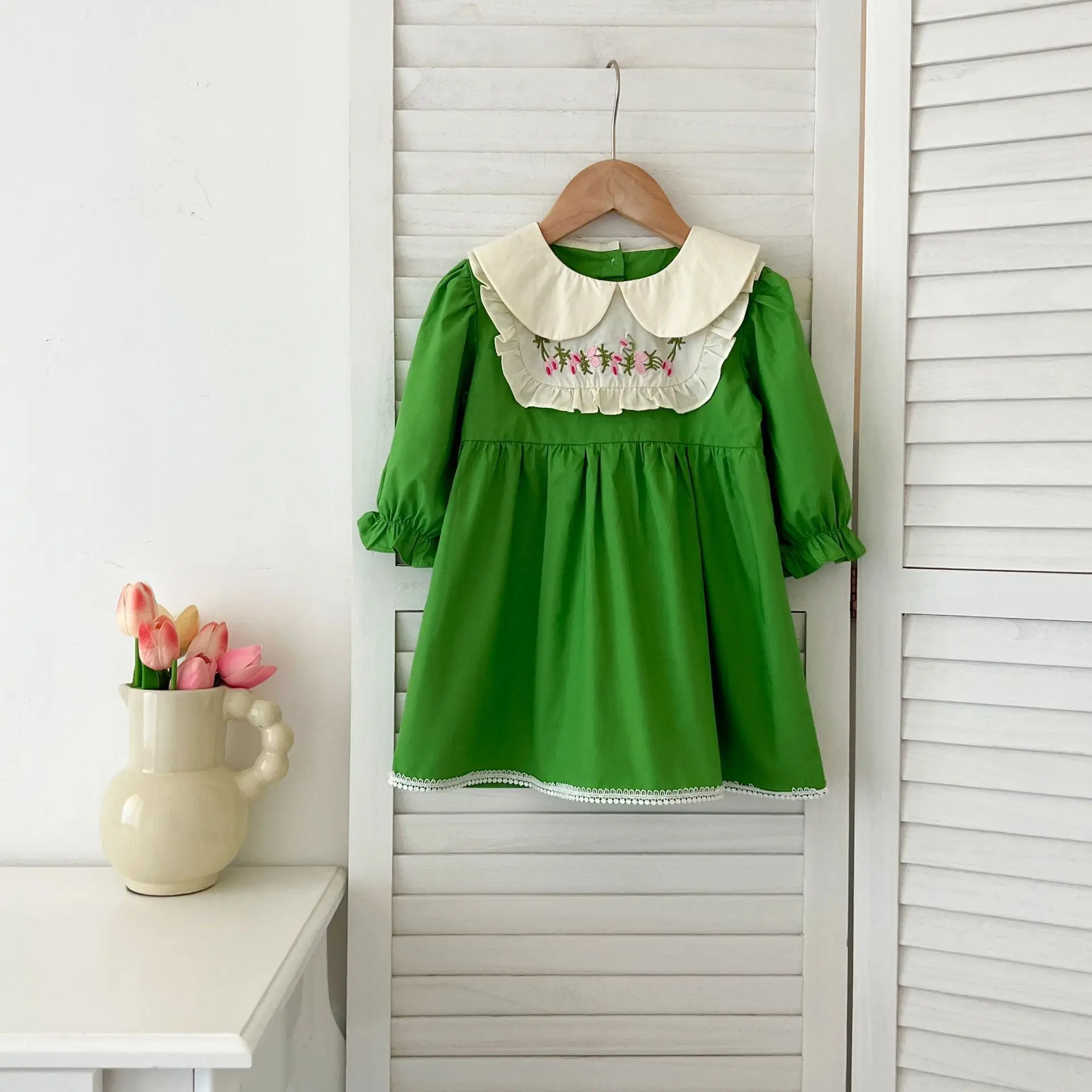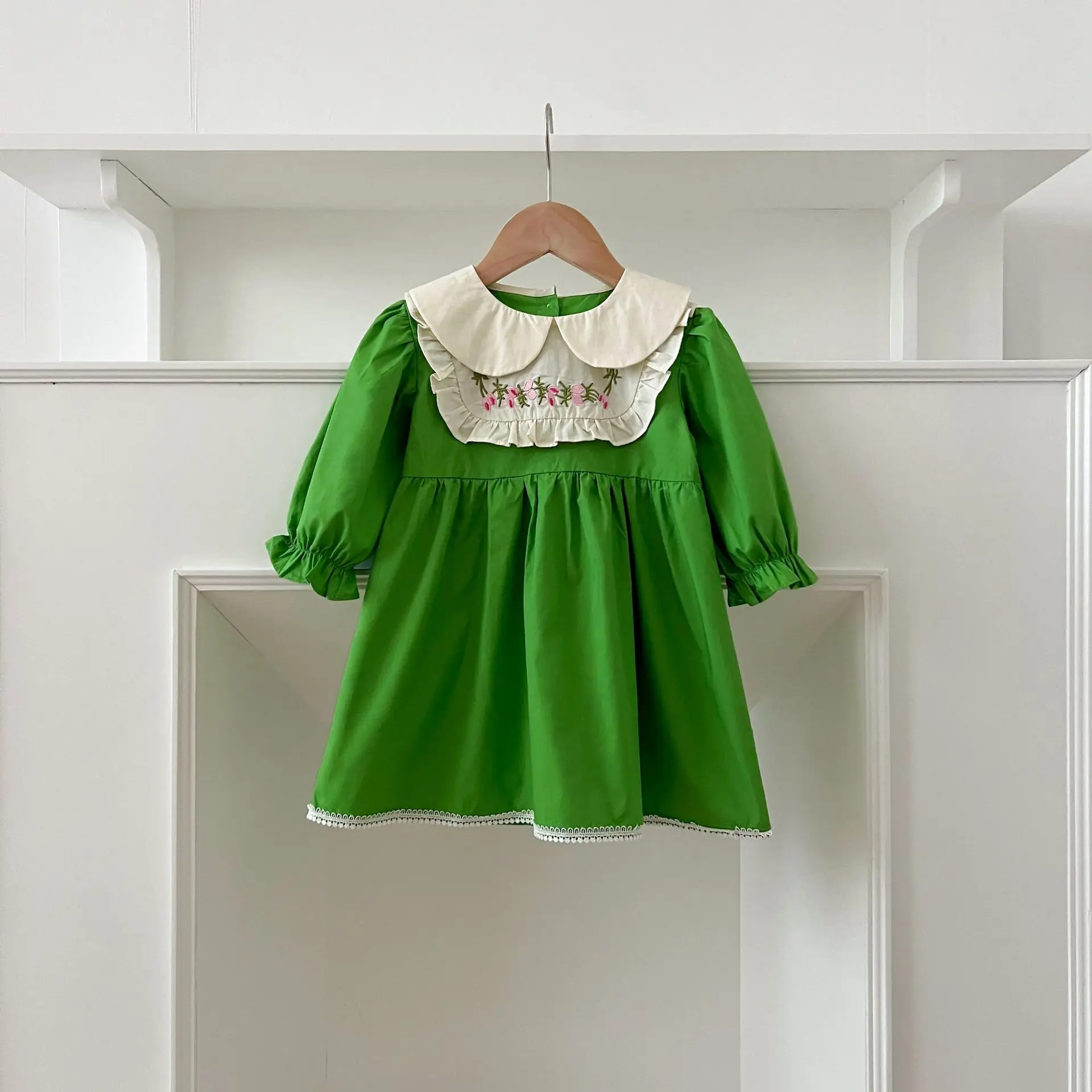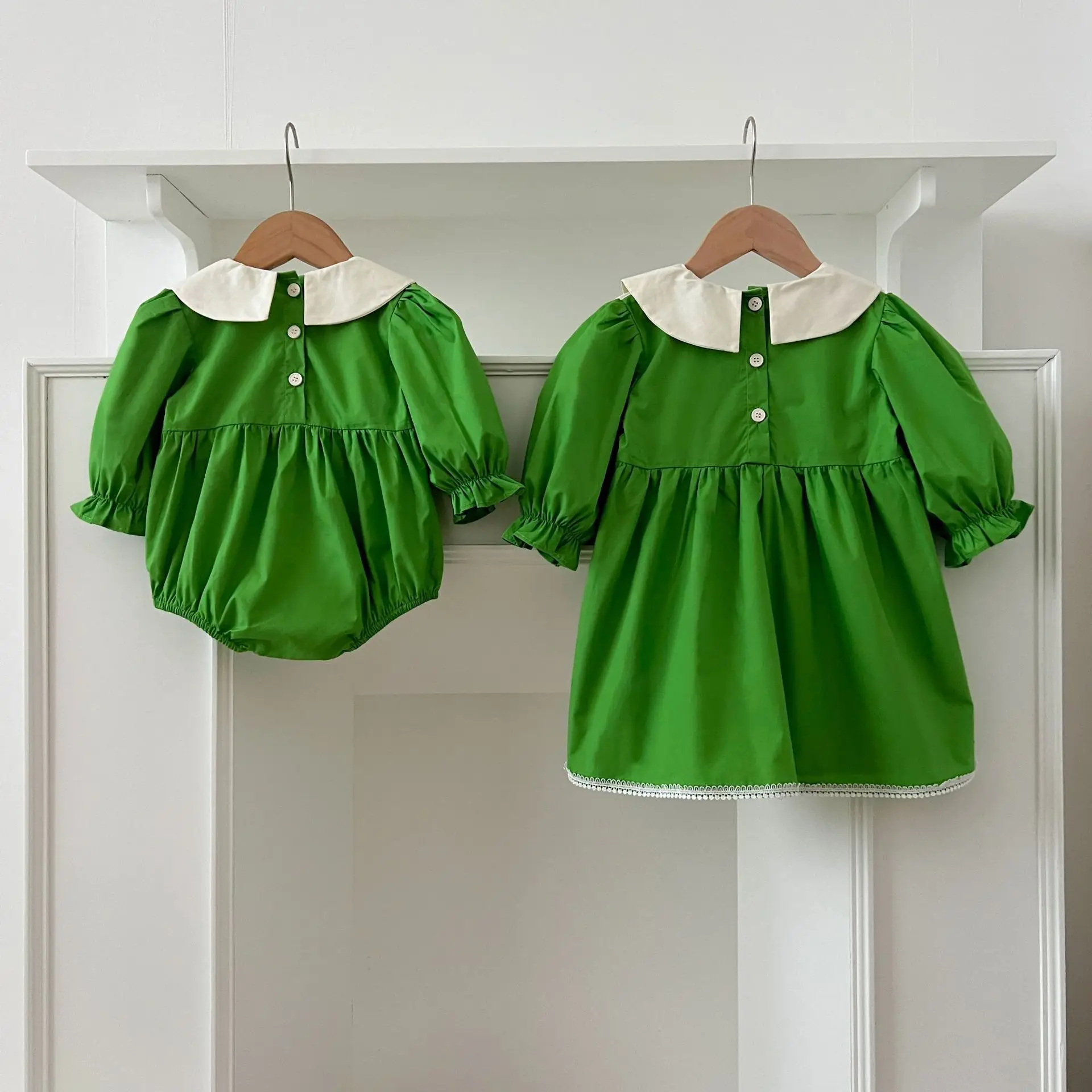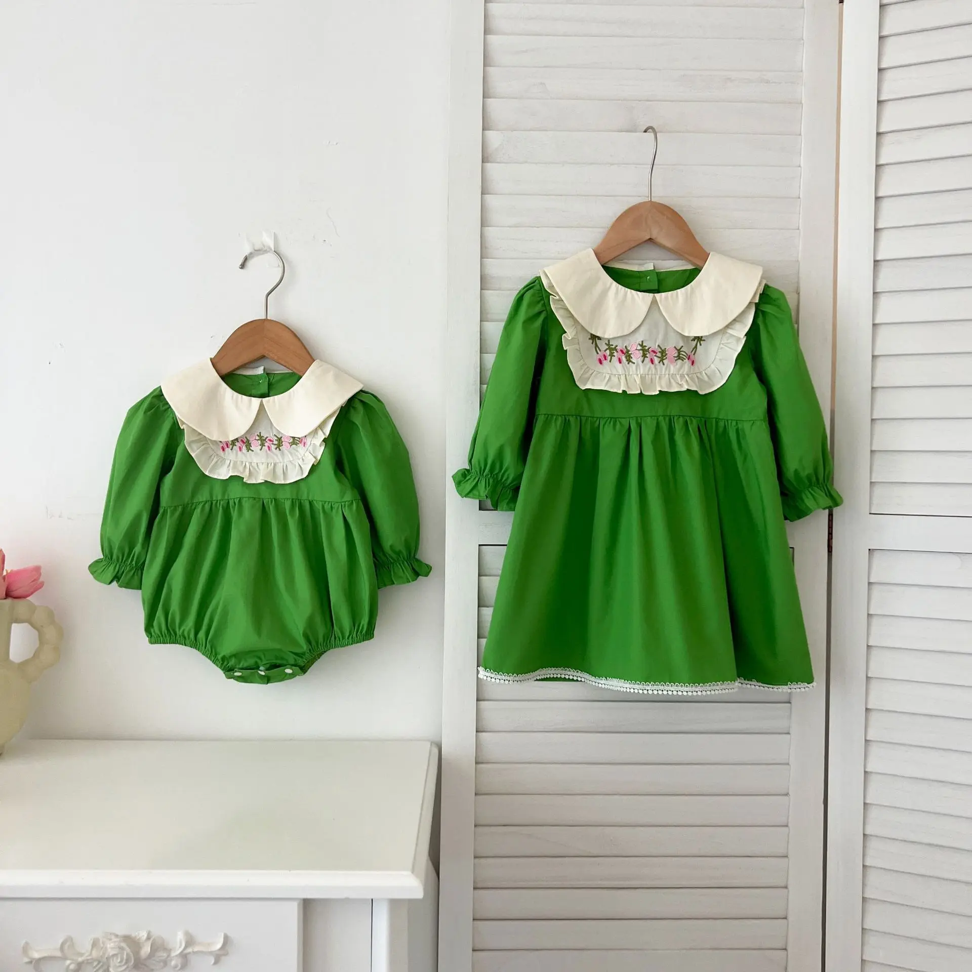 Peleles para bebé/vestidos para niños con bordado de flores, cuello redondo, manga larga y mangas abullonadas, conjunto de dos piezas para hermanas.