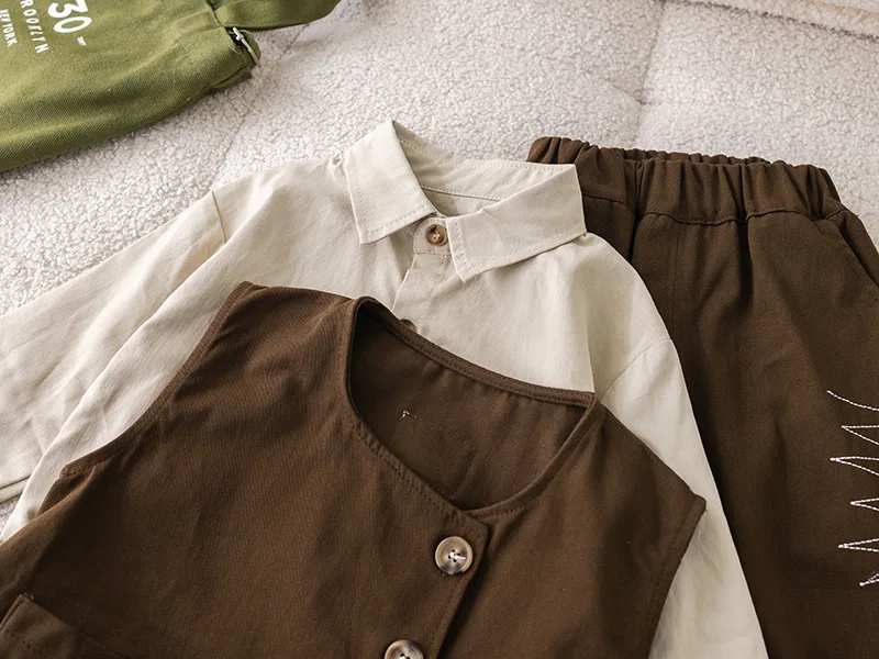 Conjunto infantil de 3 piezas: camisa de manga larga + chaleco con botones asimétricos + pantalón largo con detalles de costura, 2 colores