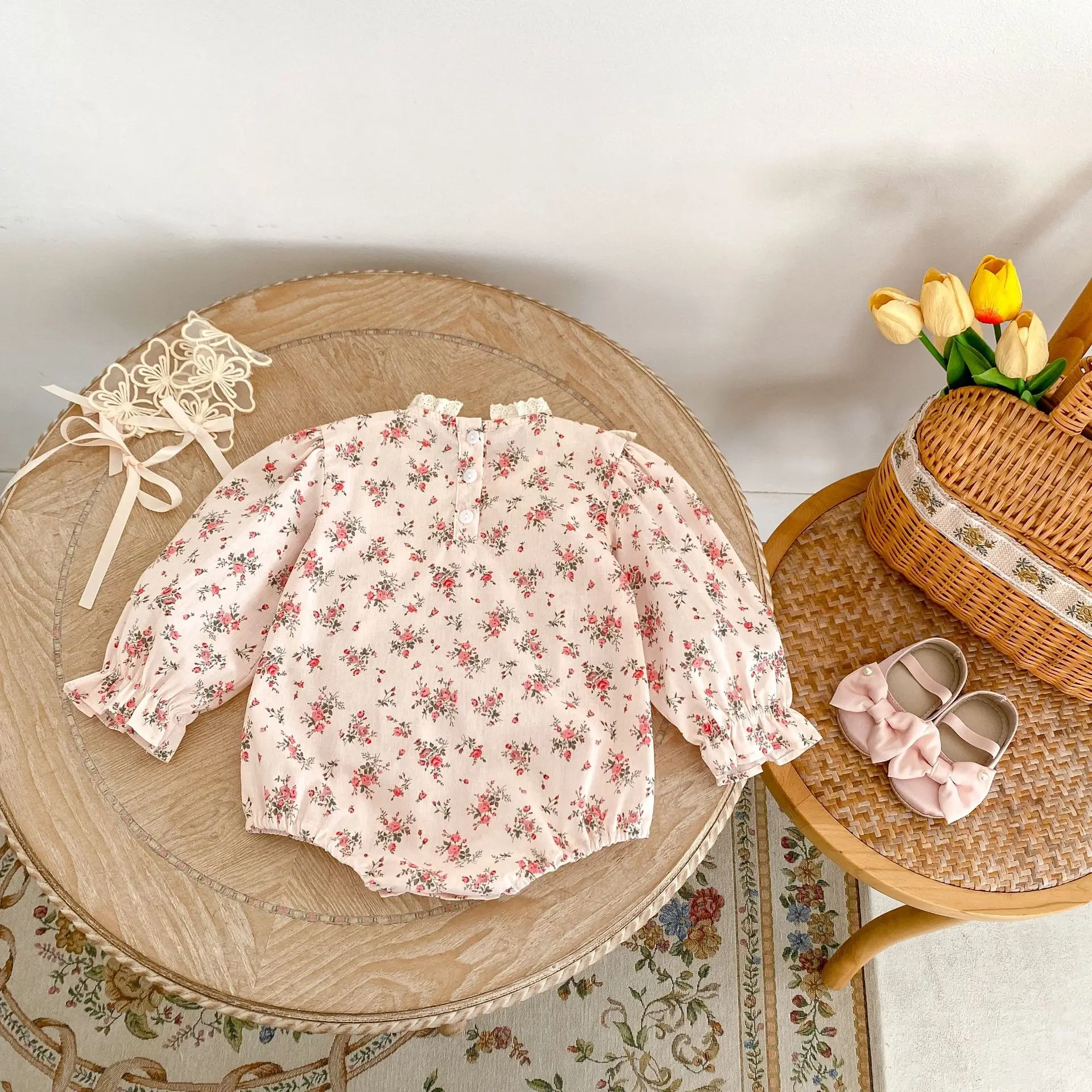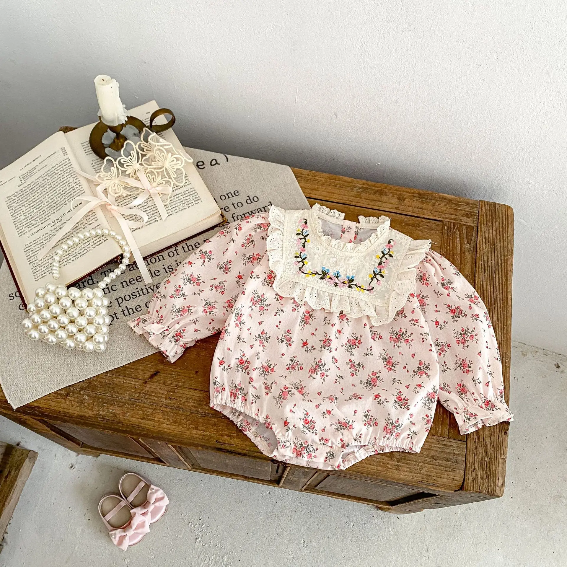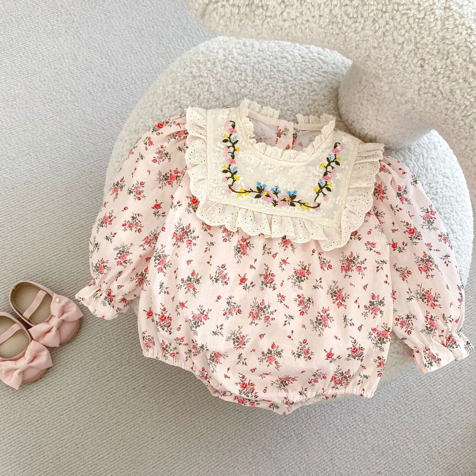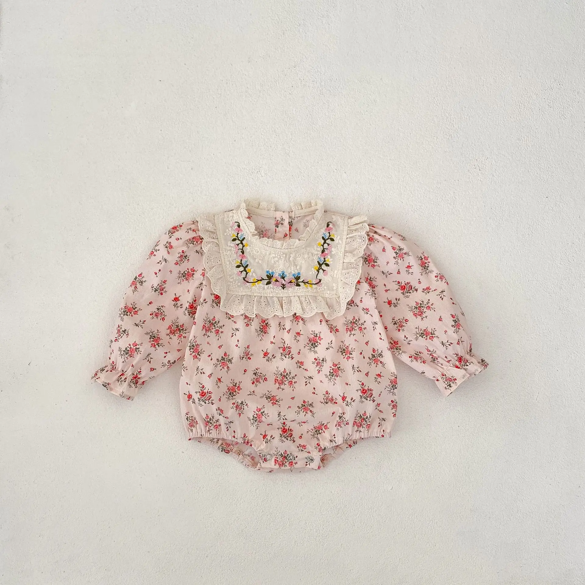 #pelele para bebé #estampado de flores #cuello bordado #body de manga larga #rosa #ropa de bebé #a la moda