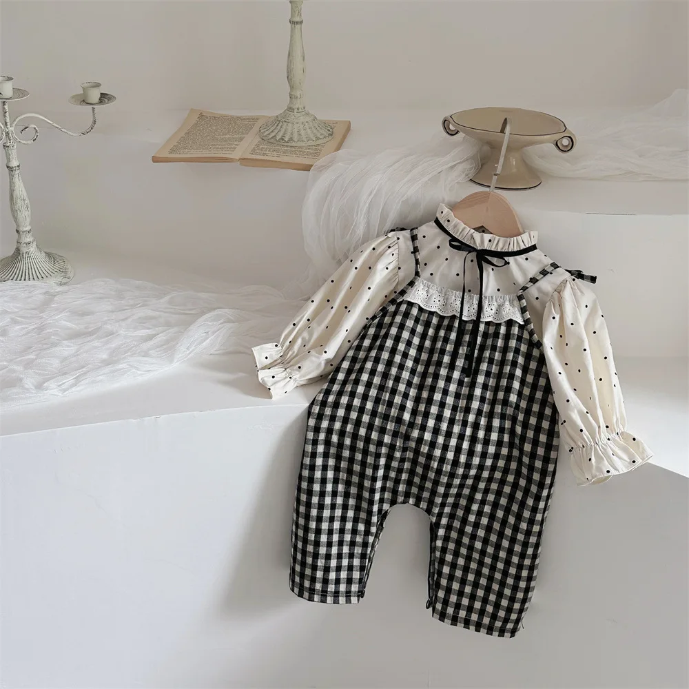Un conjunto de top y mono para bebé que consta de una blusa túnica de manga larga con un bonito cuello alto con volantes y estampado de lunares, y un pantalón de tirantes a cuadros. La blusa está hecha de un material suave y es cómoda, y su diseño es fácil de combinar con atuendos diarios y ocasiones especiales. El pantalón de tirantes facilita el movimiento, lo que lo hace perfecto para bebés juguetones. Este conjunto es elegante y funcional, y hará que tu bebé luzca aún más adorable.