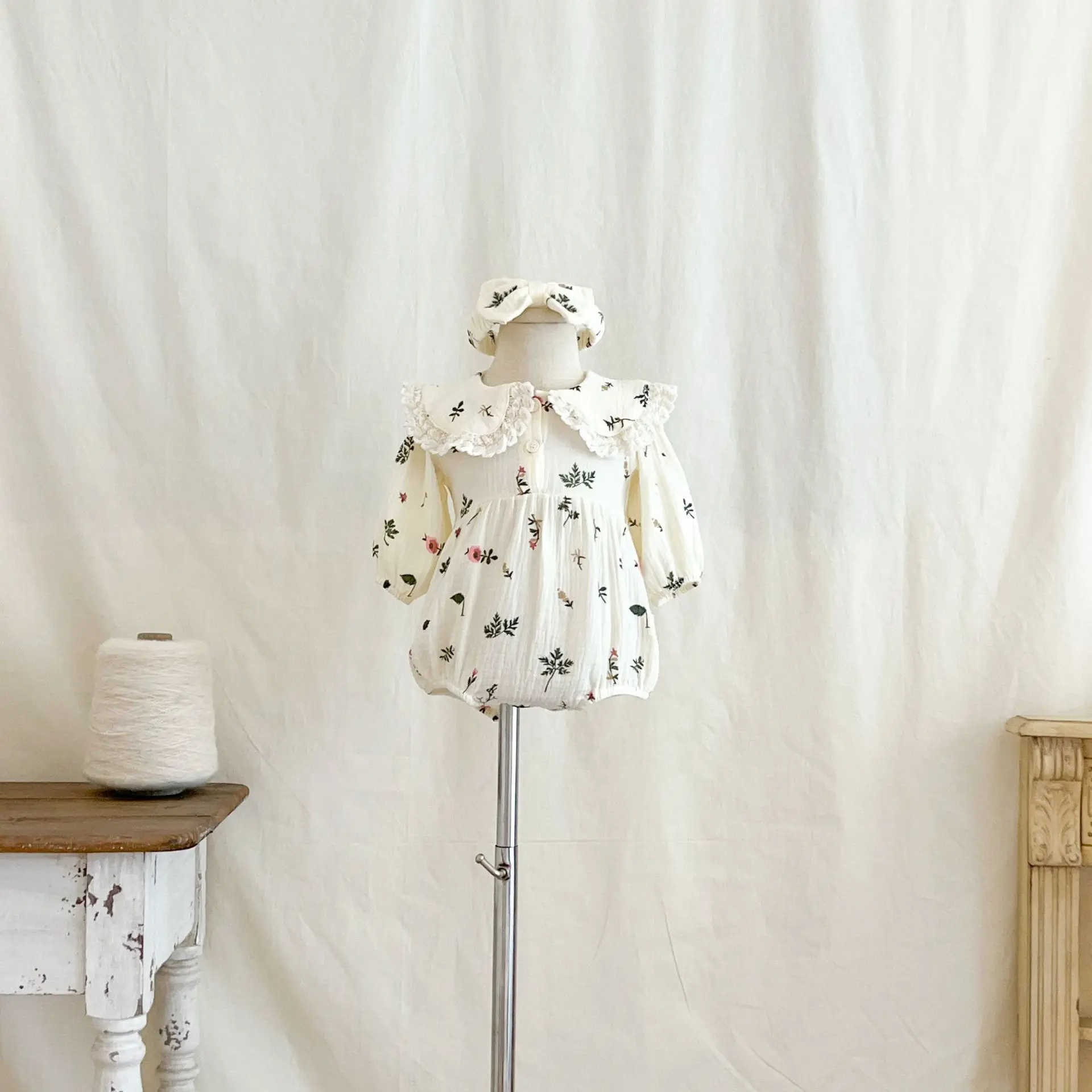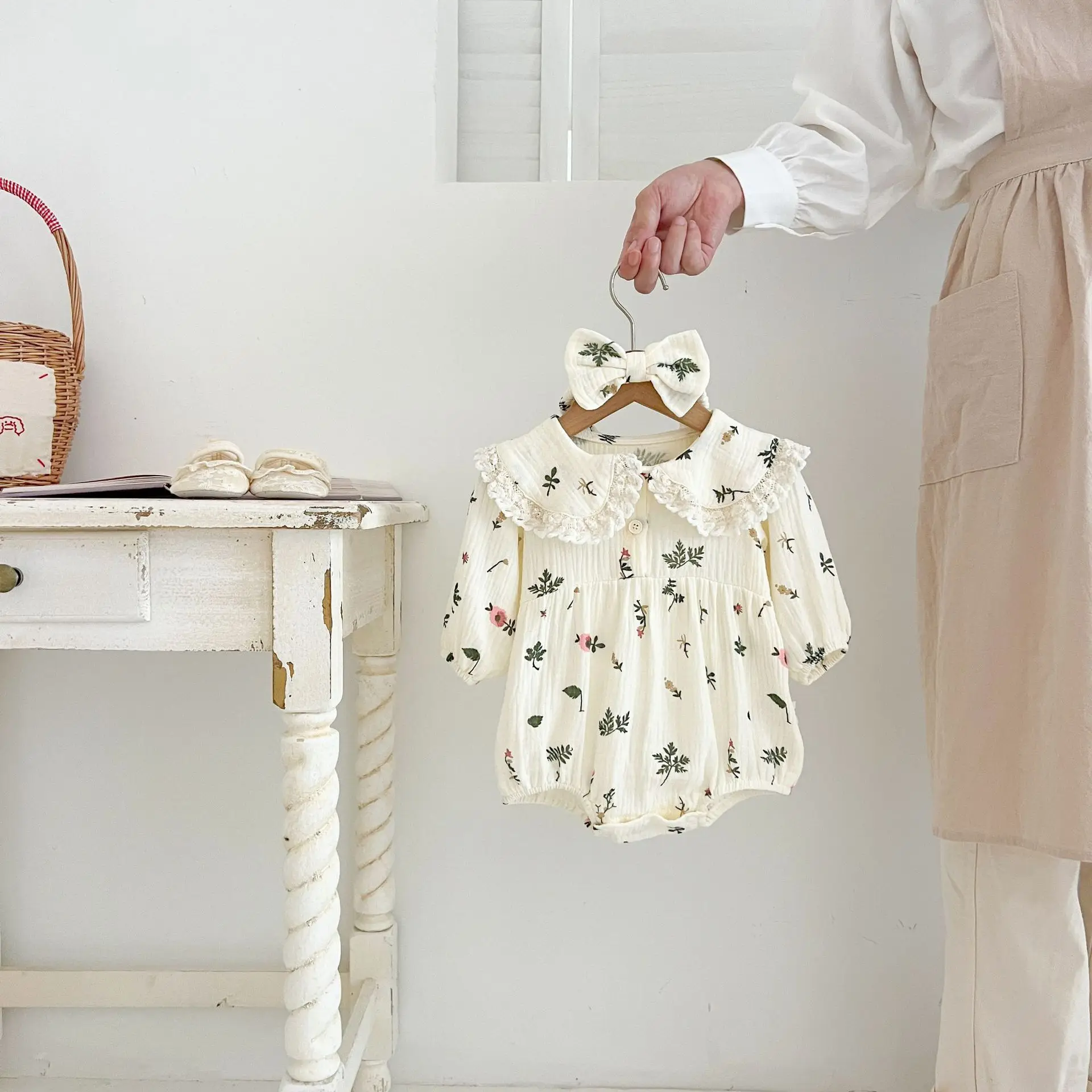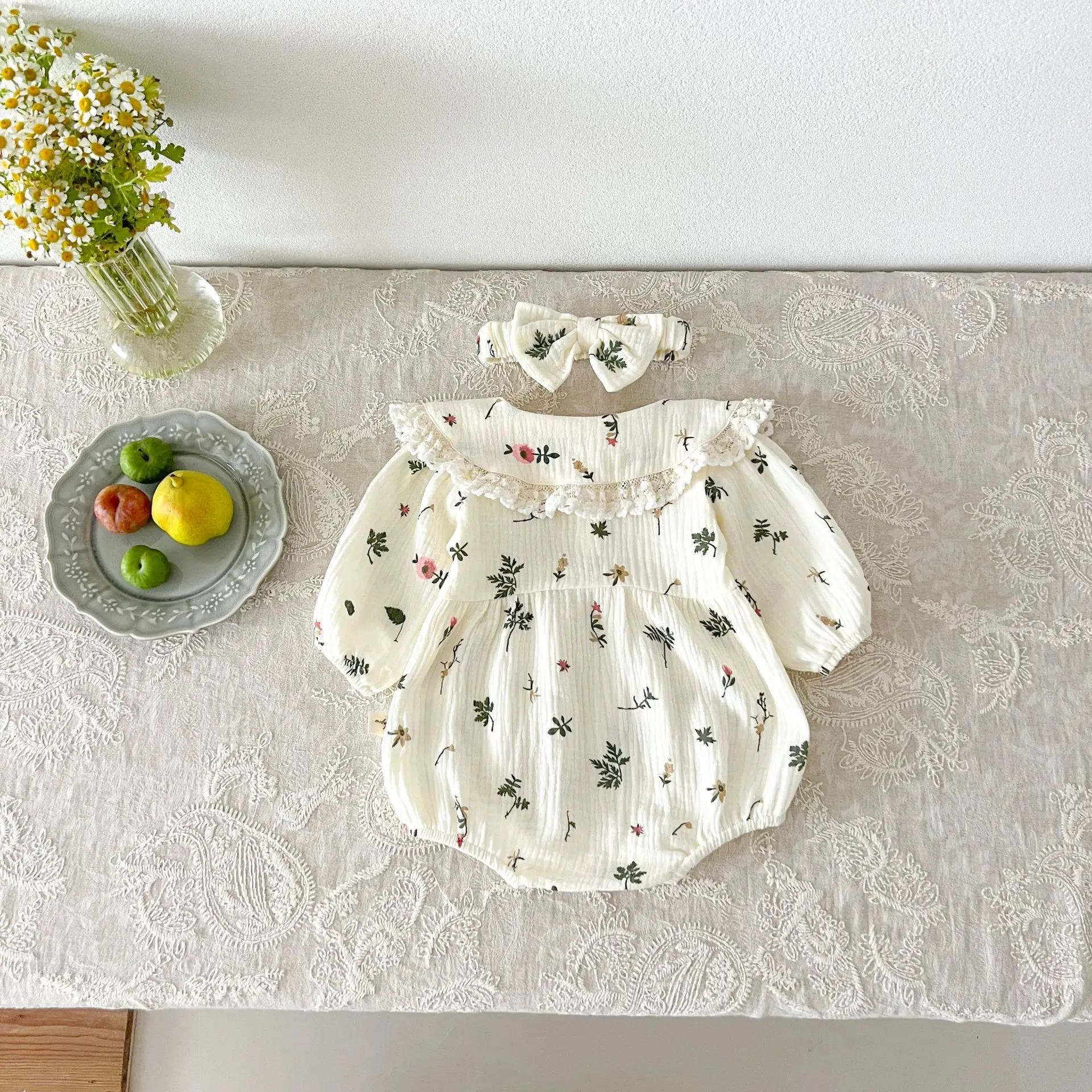 #Pelele para bebé #Estampado de hojas #Cuello de encaje #Cinta para el pelo #De moda #Ropa de bebé #Estilo princesa