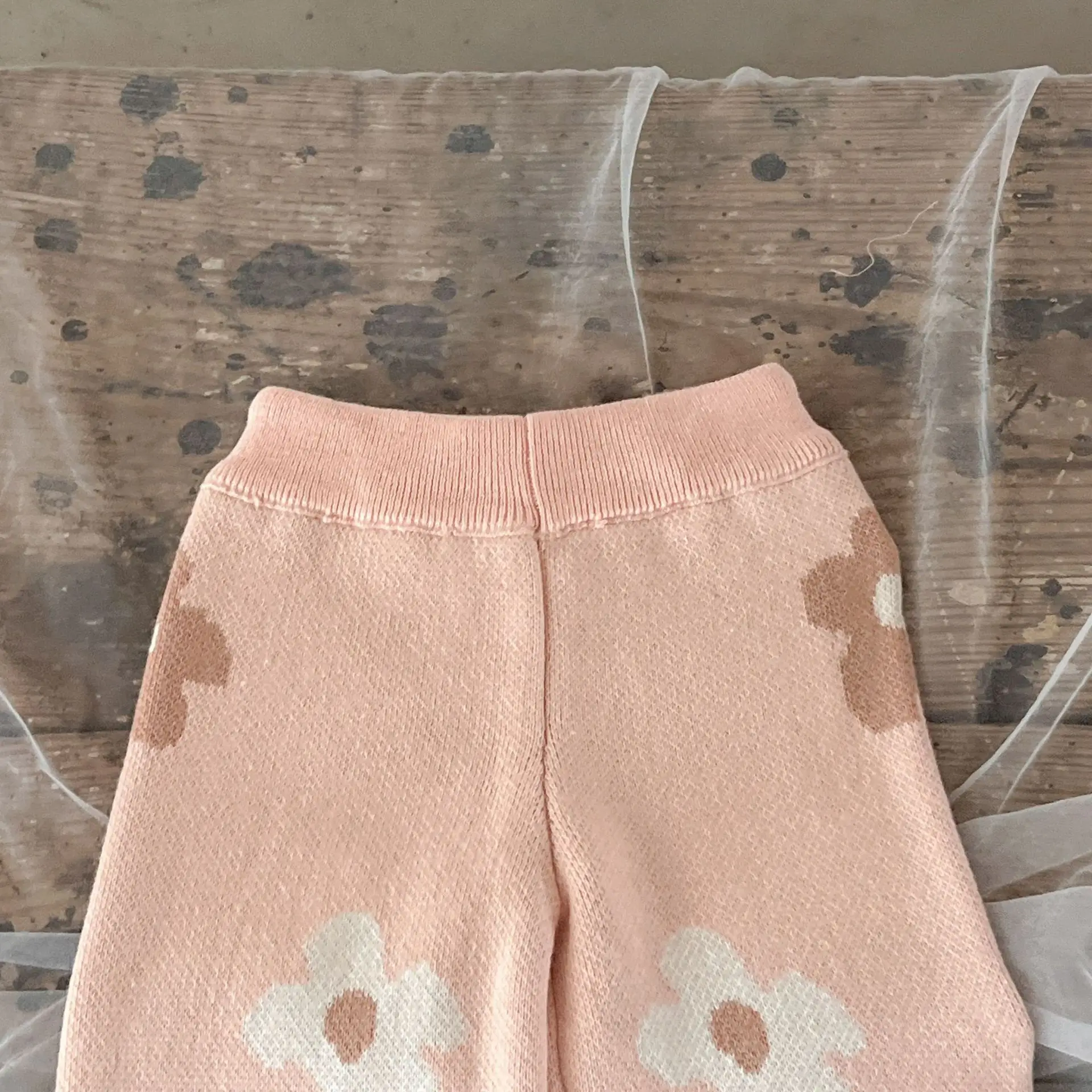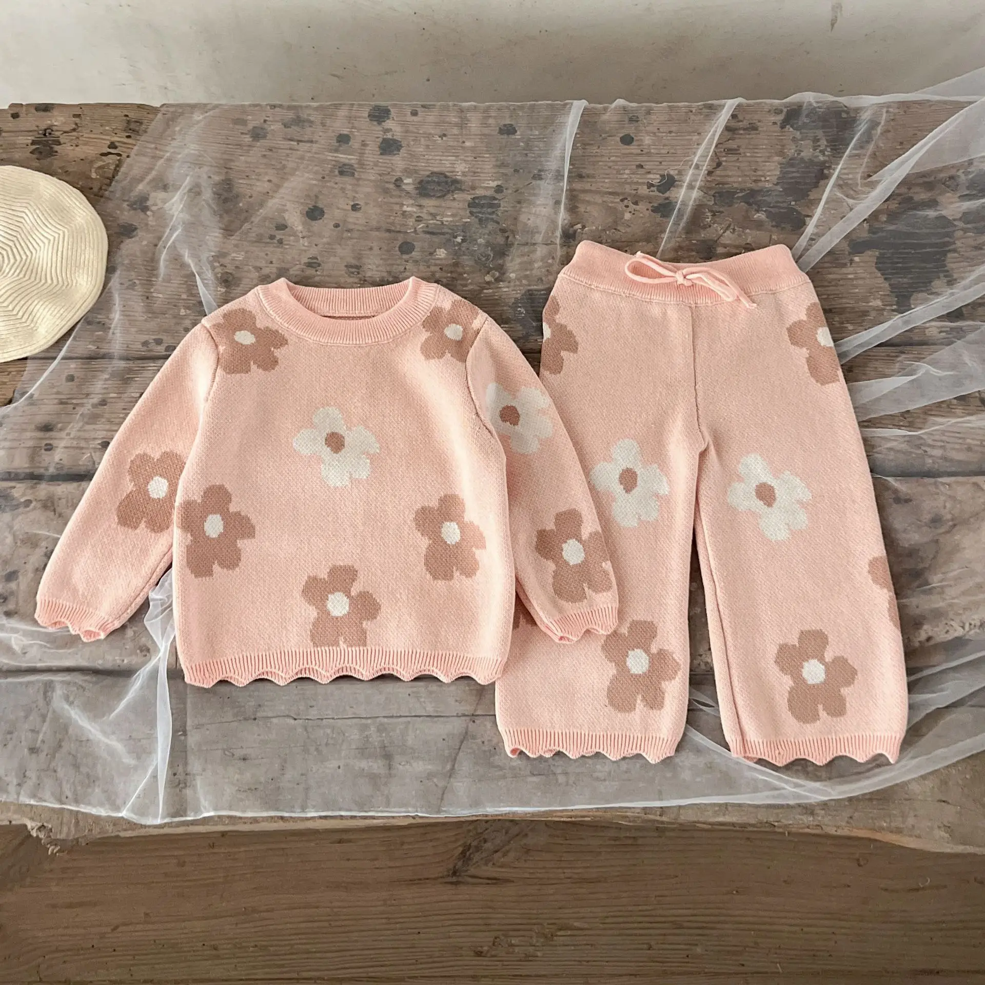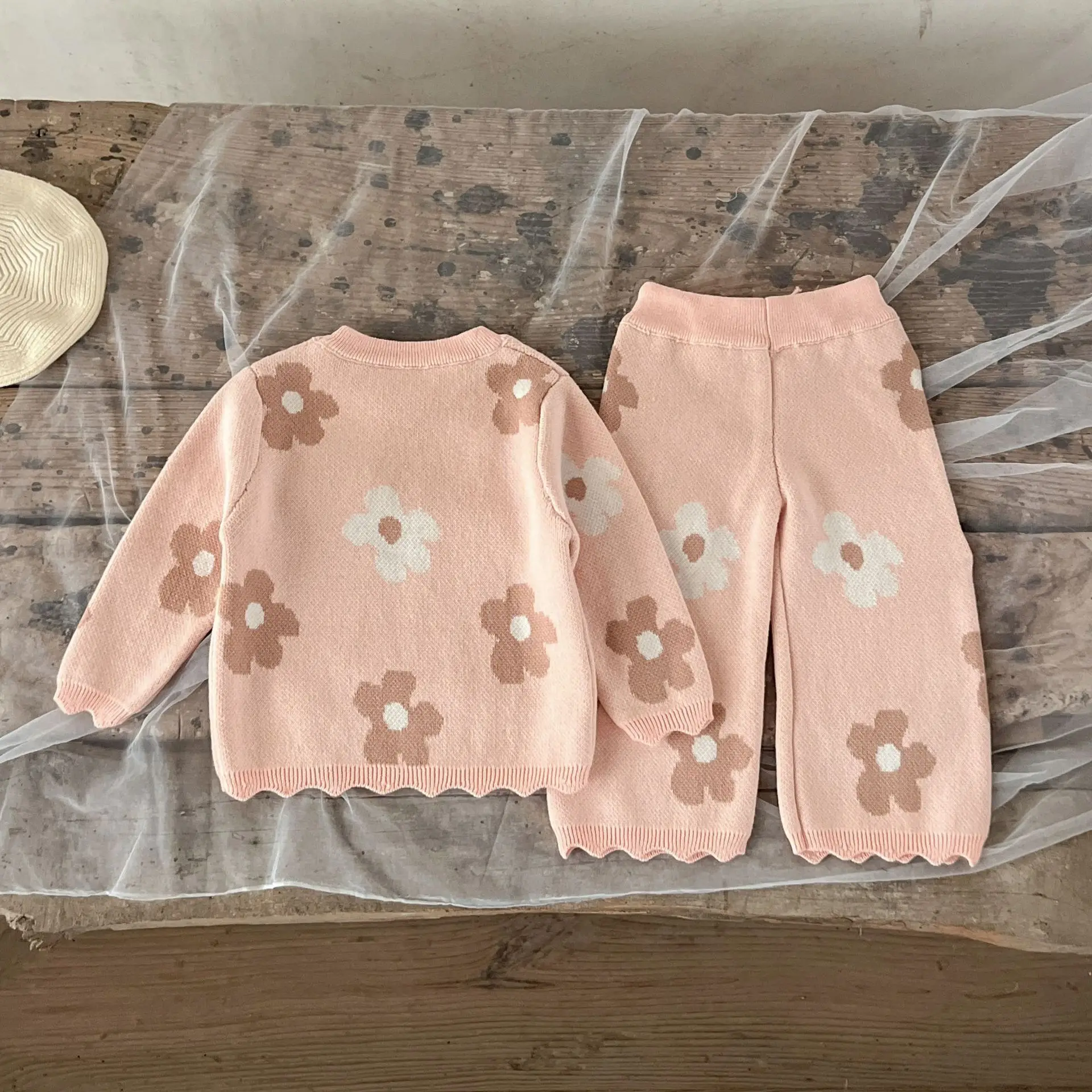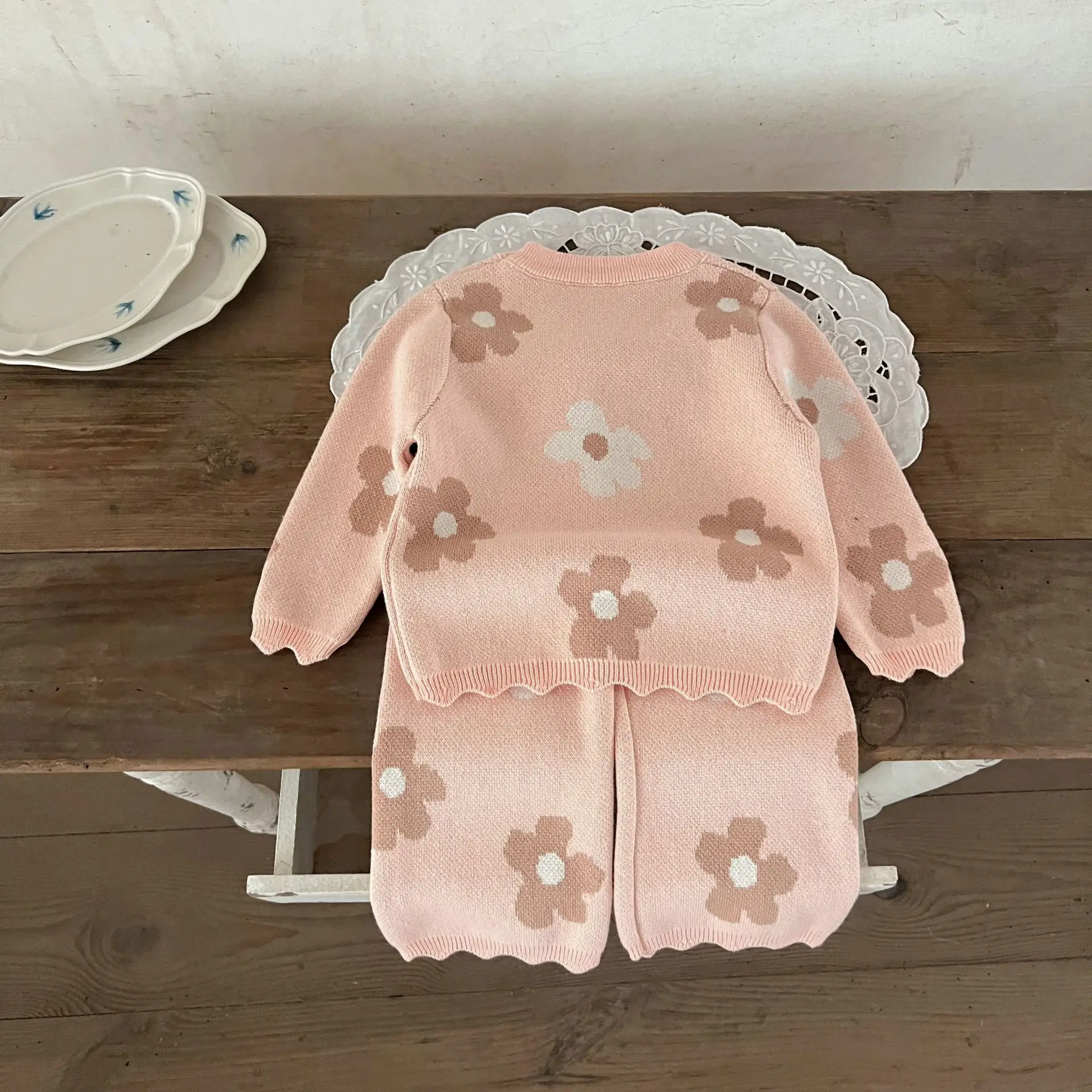 Conjunto de 2 piezas para bebé: Top de manga larga de punto con flores retro y pantalón largo de punto rosa [mh0007431]