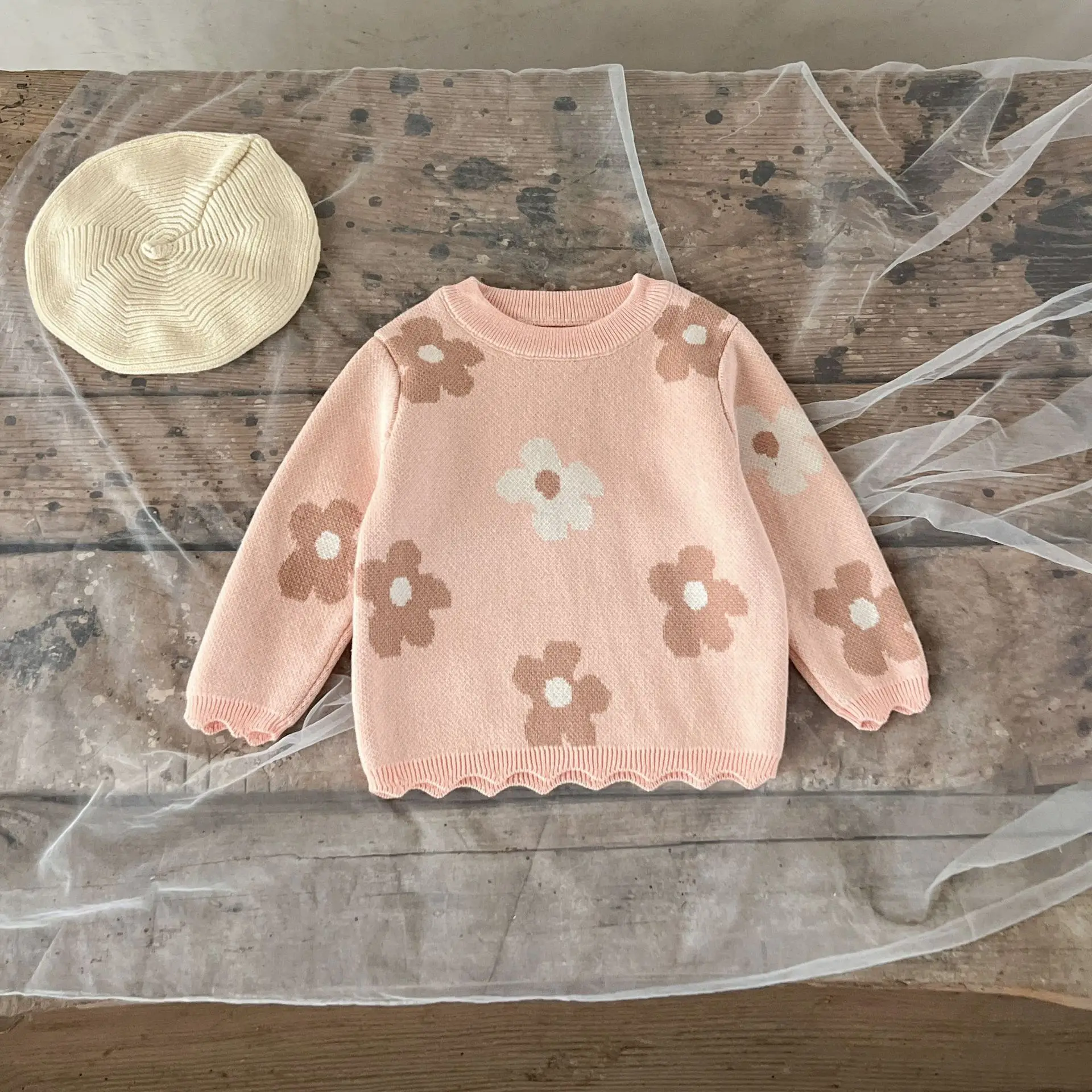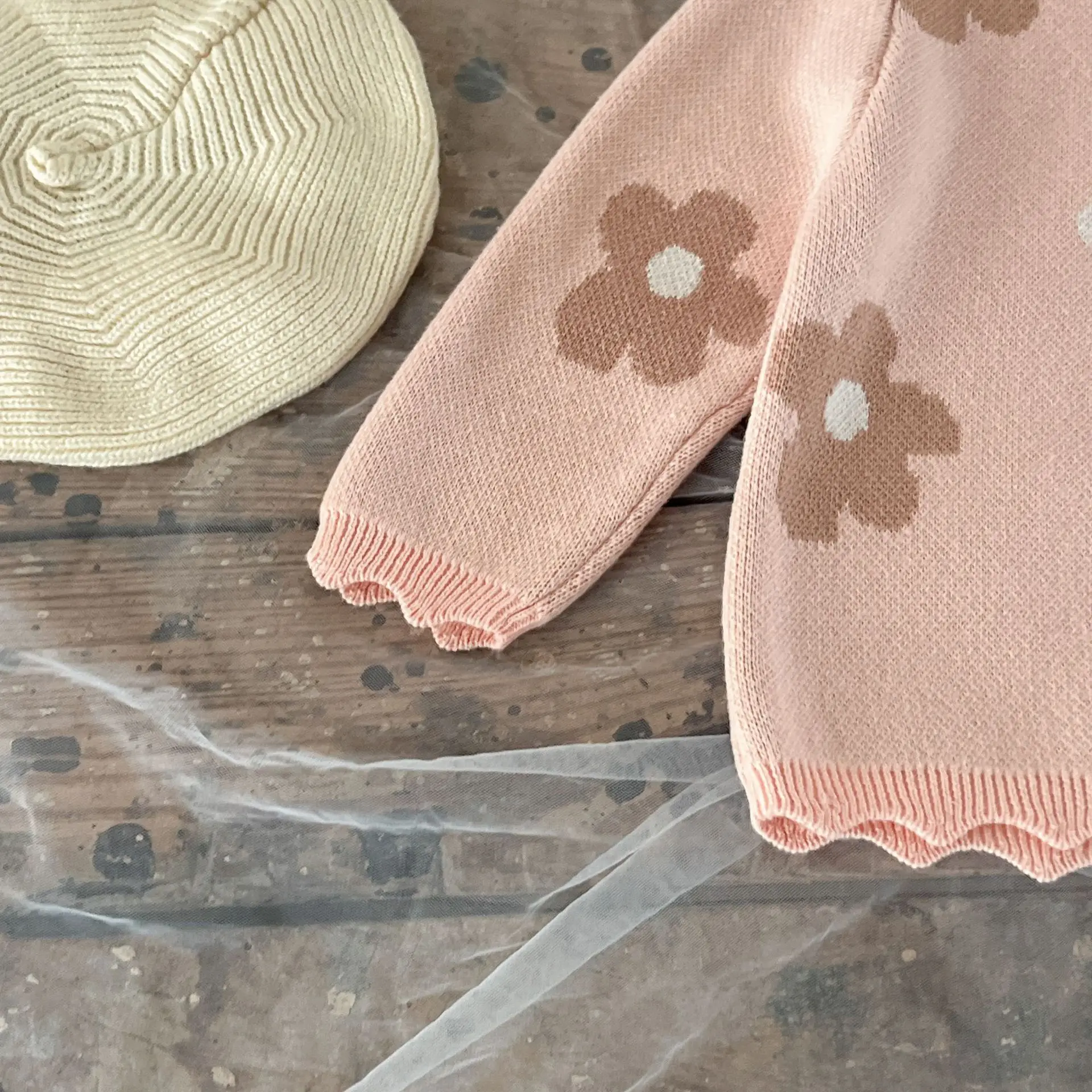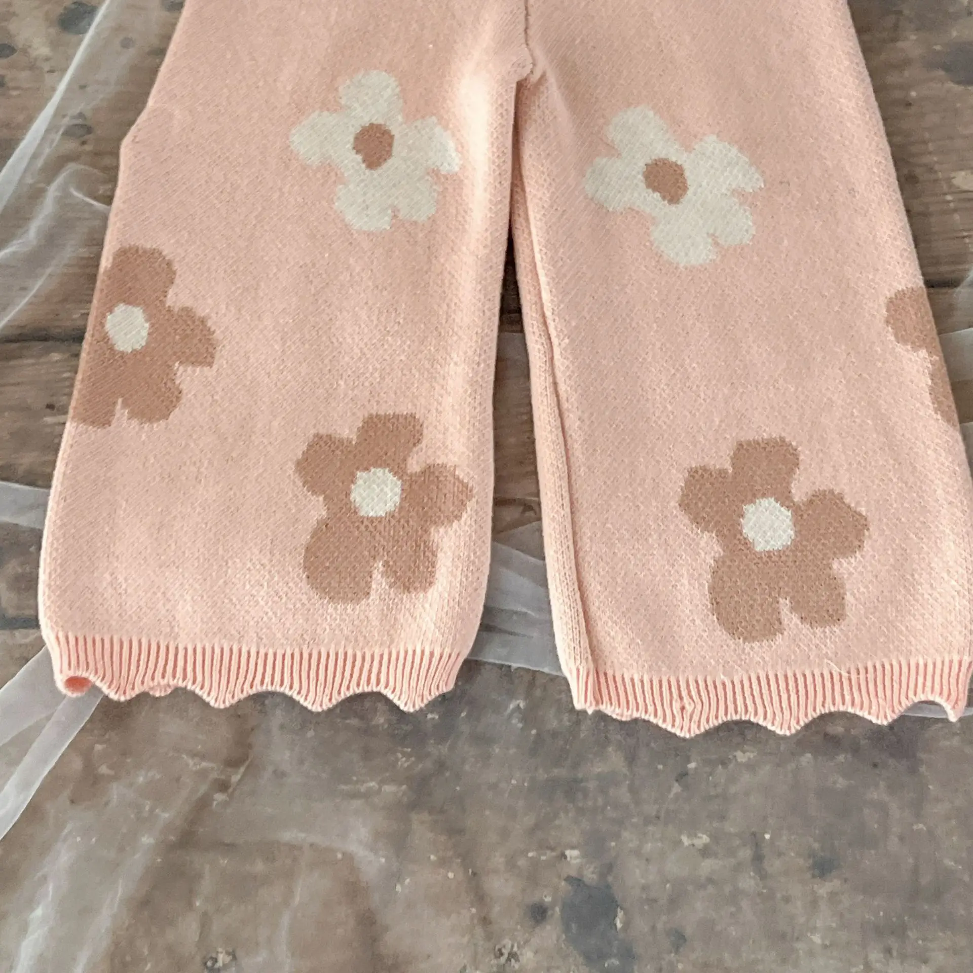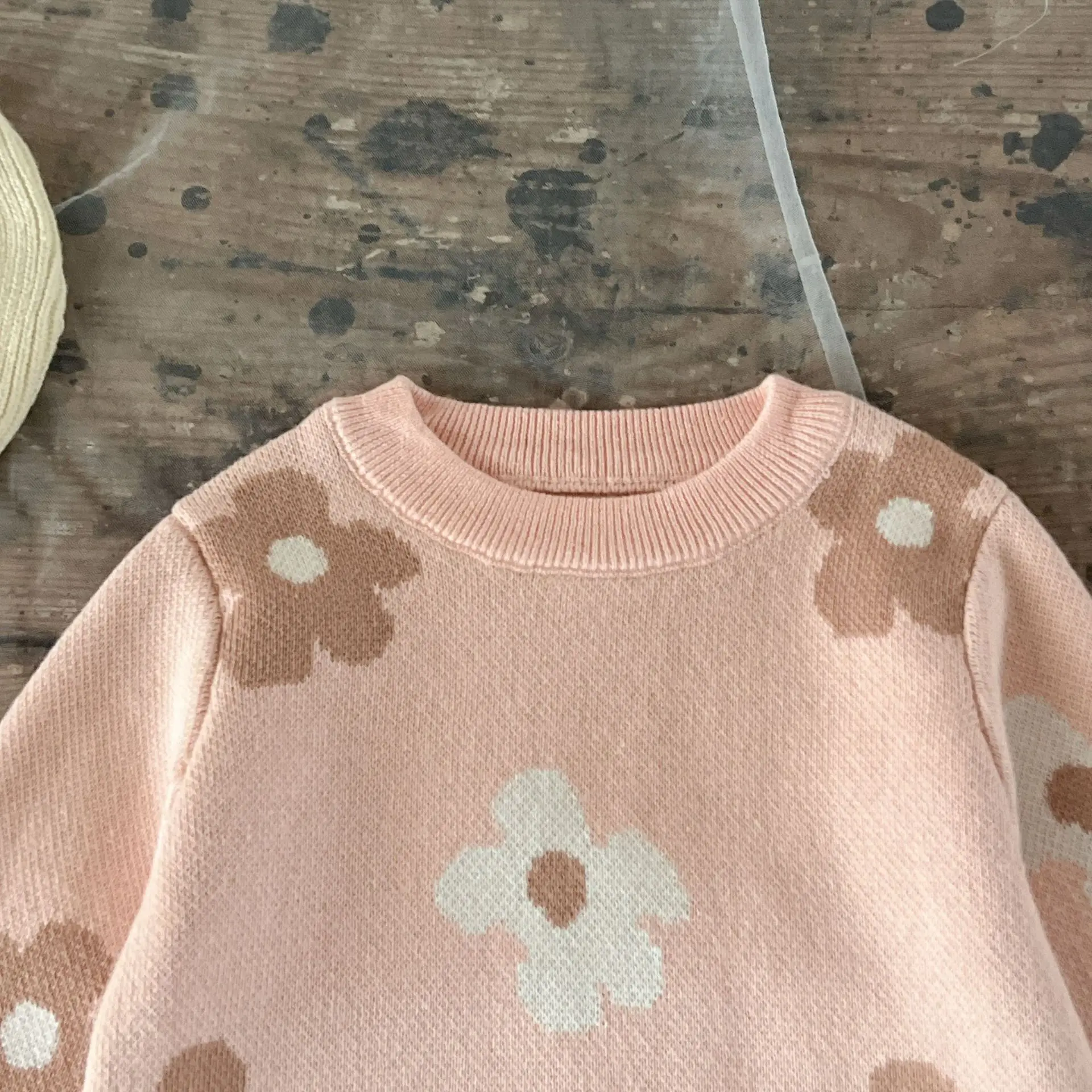 Conjunto de 2 piezas para bebé: Top de manga larga de punto con flores retro y pantalón largo de punto rosa [mh0007431]