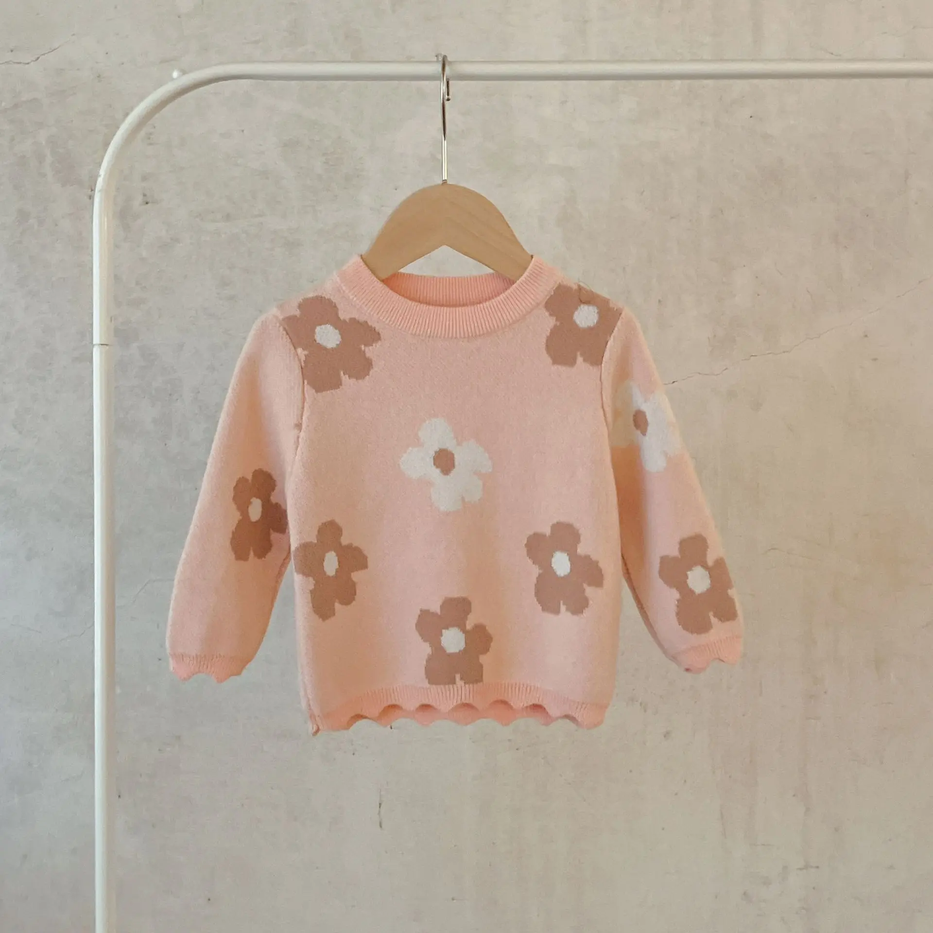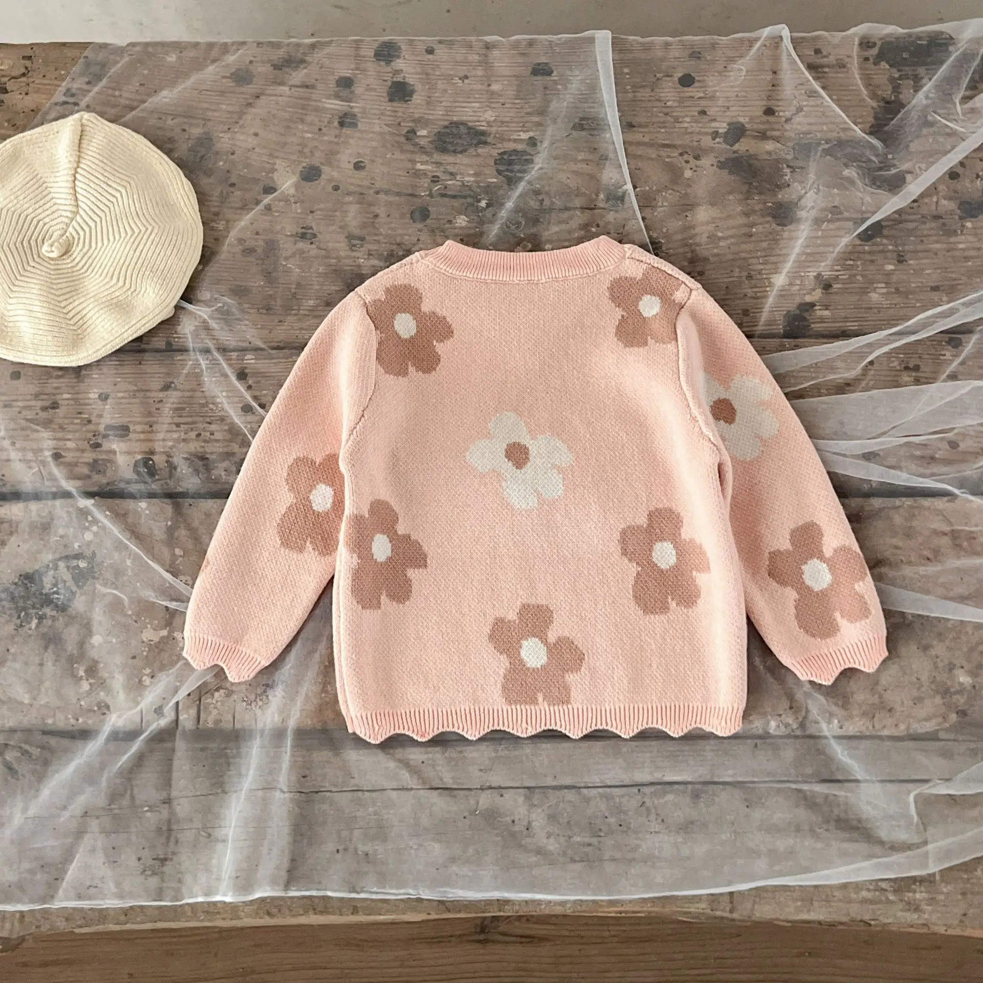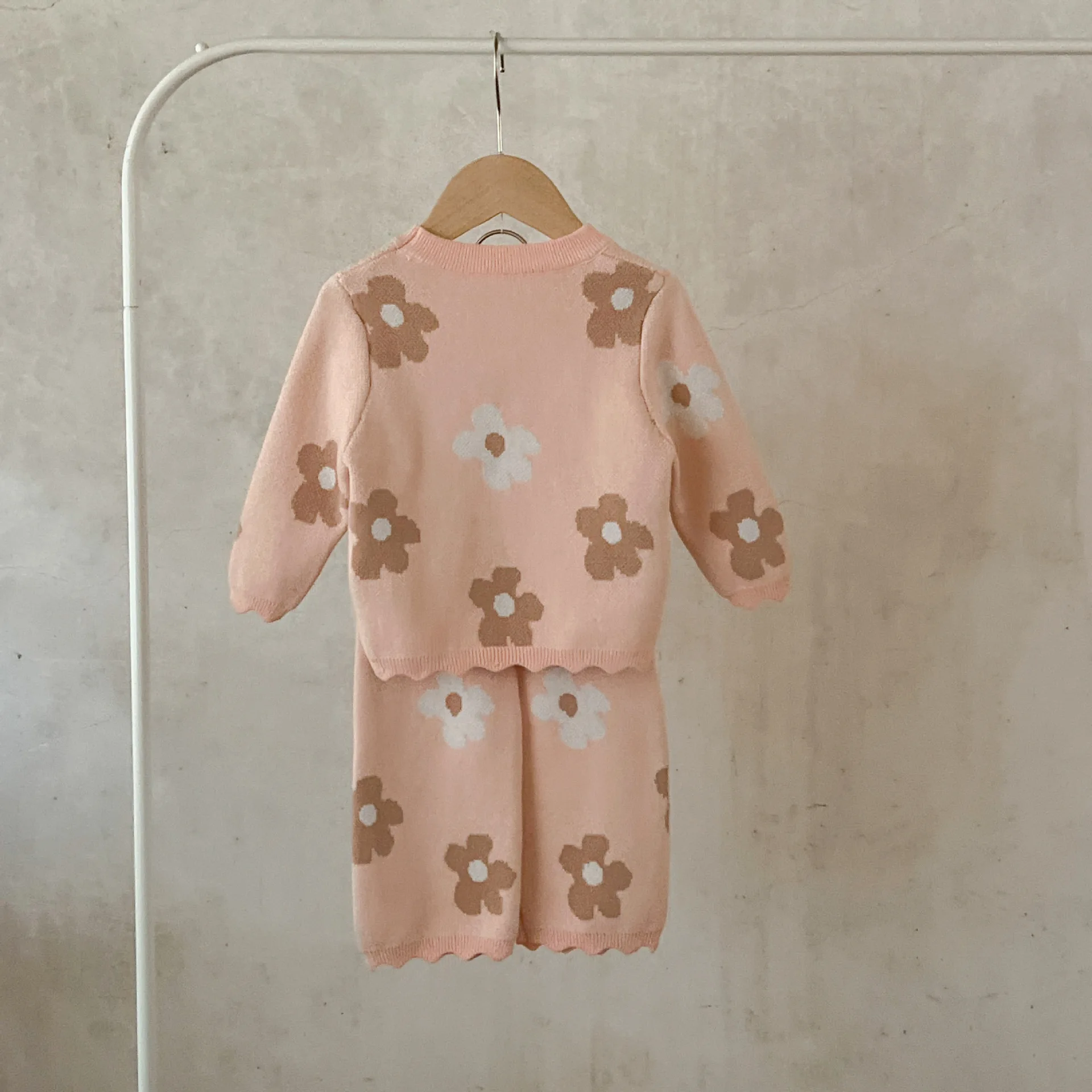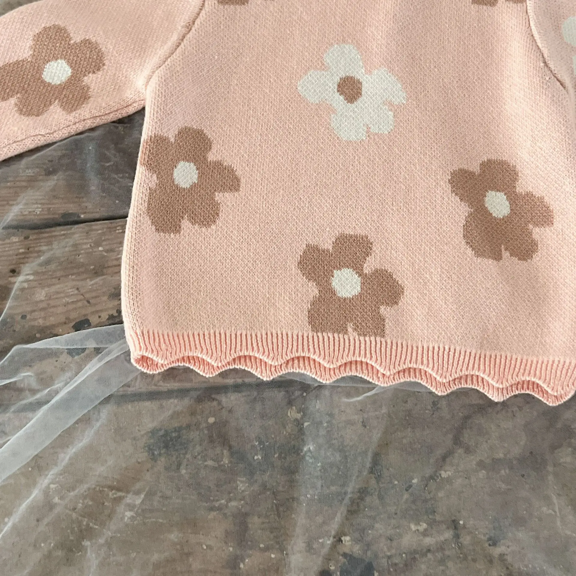 Conjunto de 2 piezas para bebé: Top de manga larga de punto con flores retro y pantalón largo de punto rosa [mh0007431]
