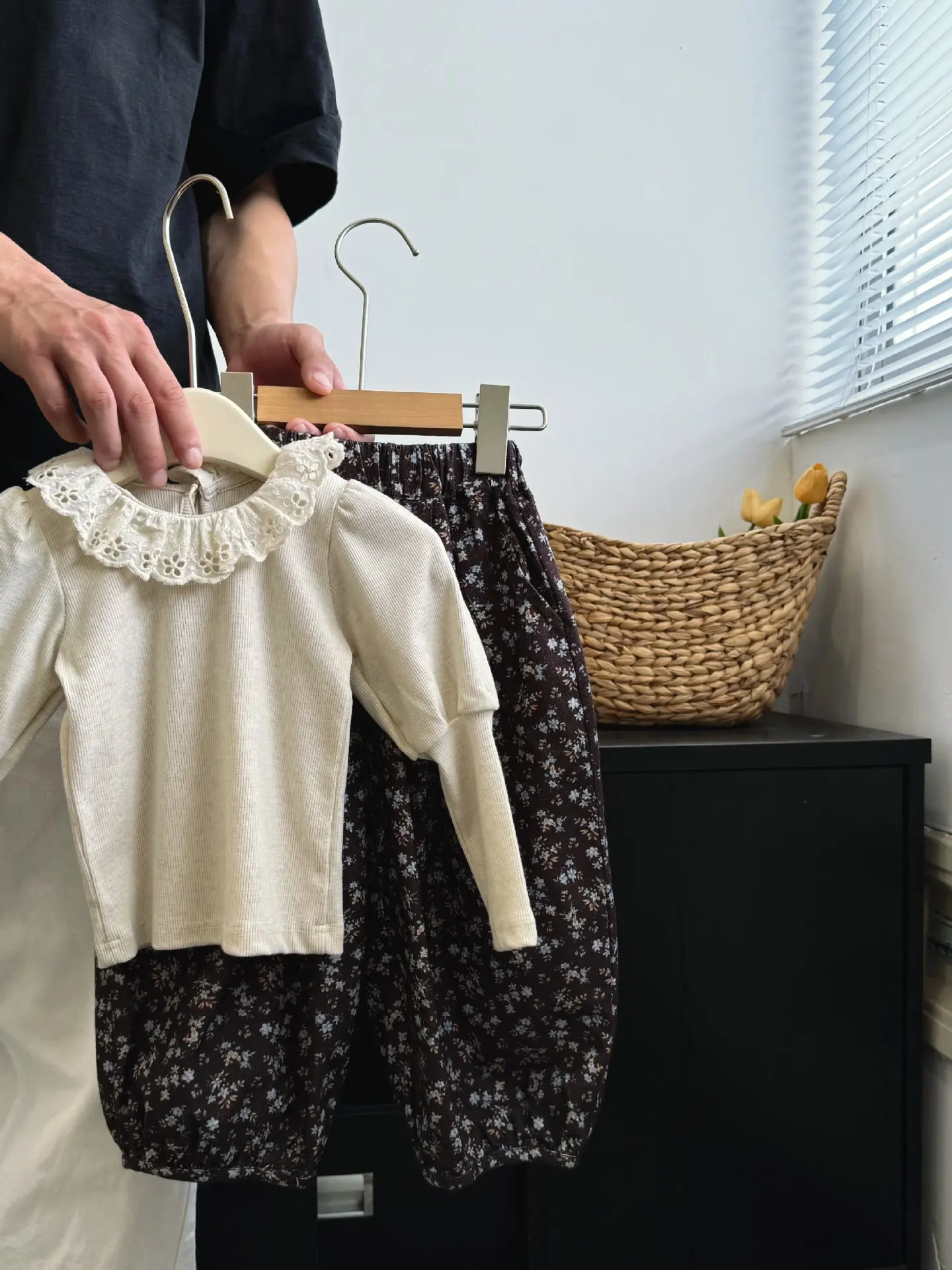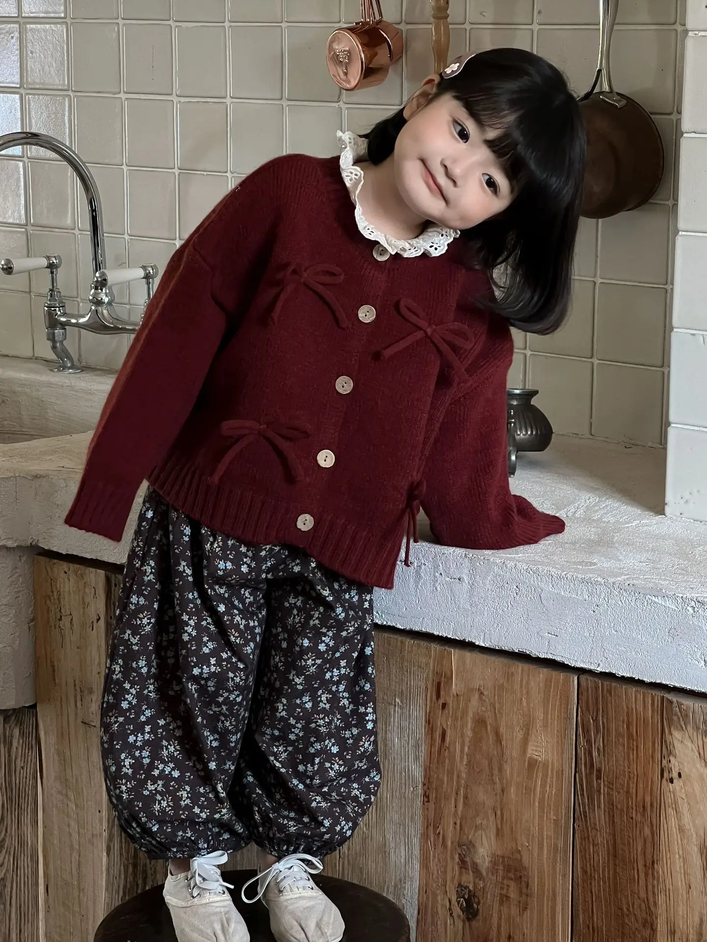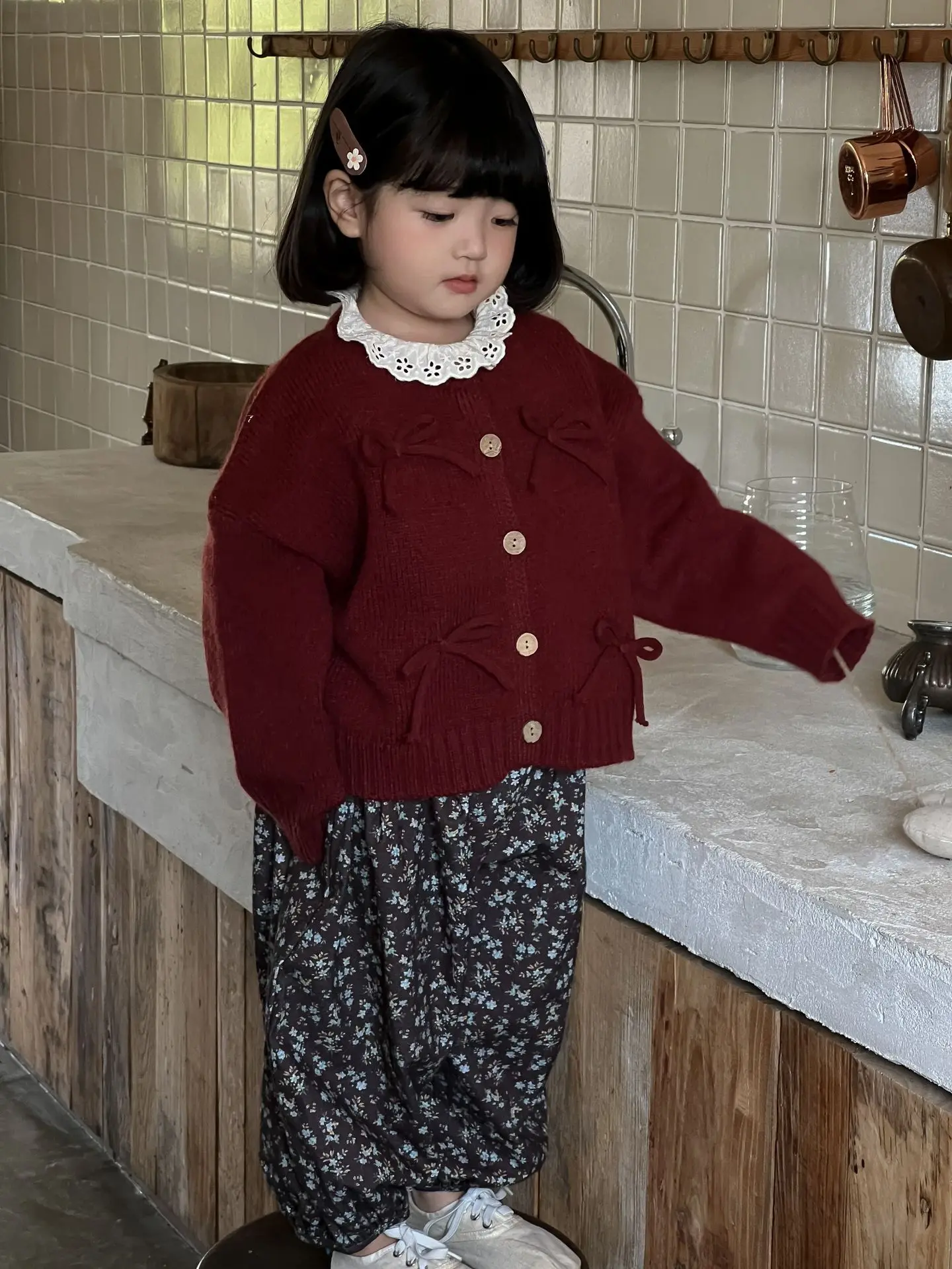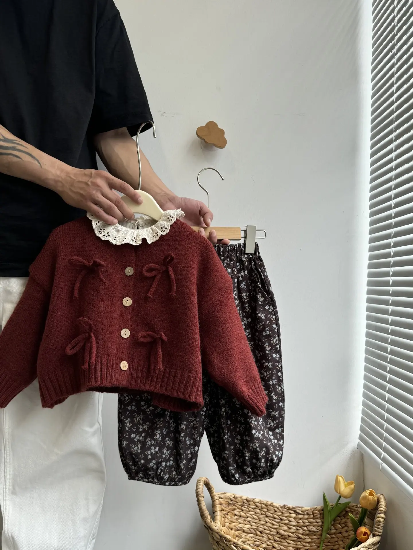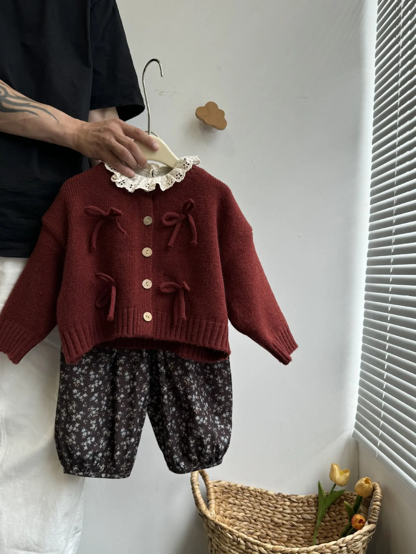 Cárdigan/top/pantalón para bebé Chaqueta de punto de manga larga con cinta/cuello con volantes Camiseta de manga larga abullonada/pantalón largo con estampado de flores