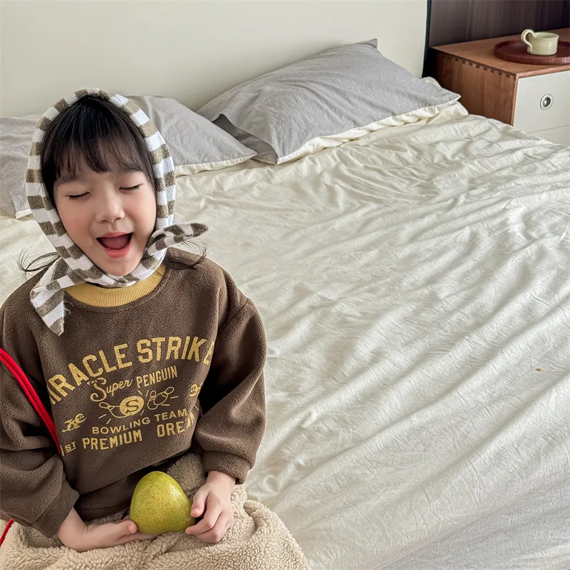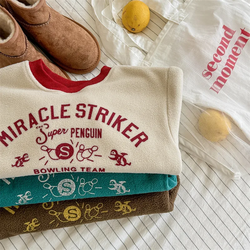 Camiseta infantil de manga larga polar con estampado de letras y logotipo de pingüino, 3 colores