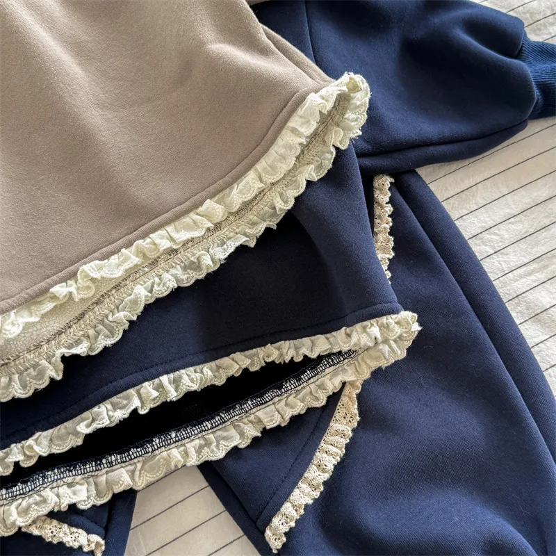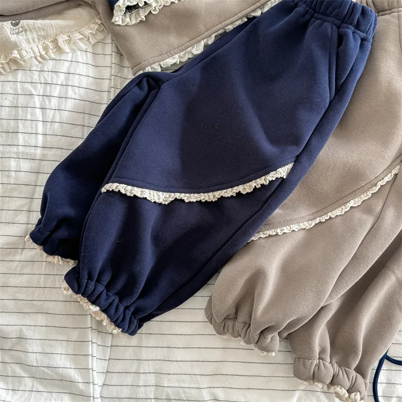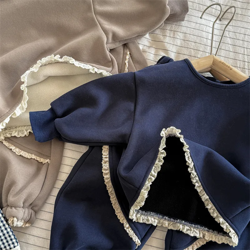 Conjunto de 2 piezas para niños: sudadera de manga larga con forro polar y volantes + pantalones deportivos largos
