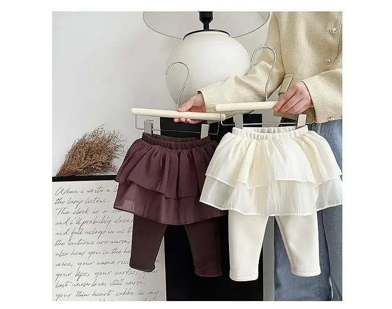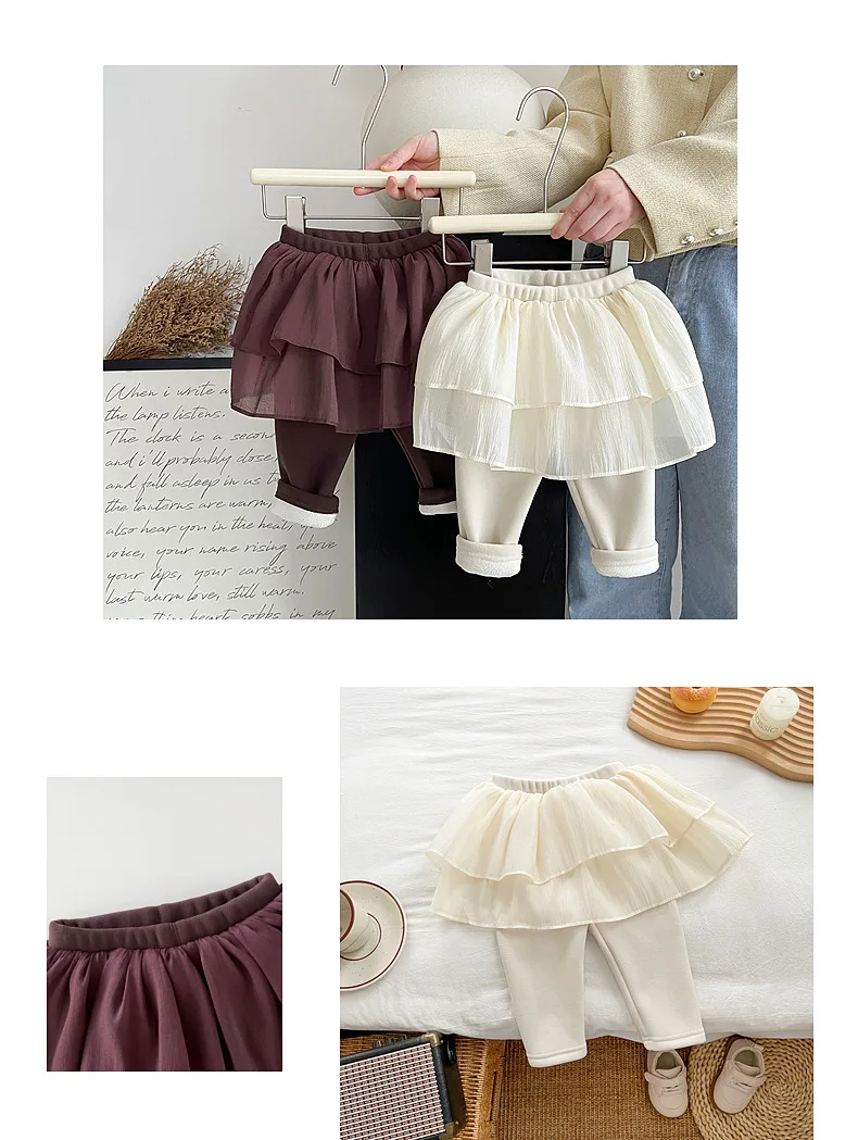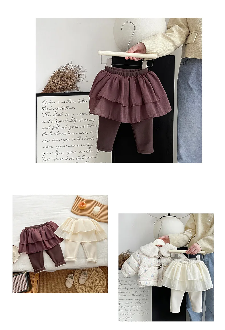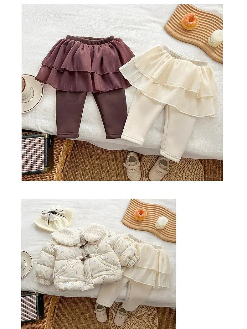 Este pantalón de bebé combina una falda pastel con capas y leggings, lo que lo hace bonito y práctico. El suave tejido polar te mantiene abrigada y cómoda incluso en climas fríos. La falda tiene un diseño escalonado que le da un toque femenino, mientras que los leggings te permiten moverte con libertad. Este estilo es perfecto para el día a día y para salidas especiales, y puedes disfrutar de la ternura de llevar dos prendas en capas. Combina con cualquier top, ampliando las opciones de combinación.