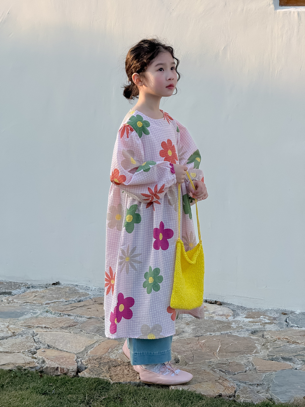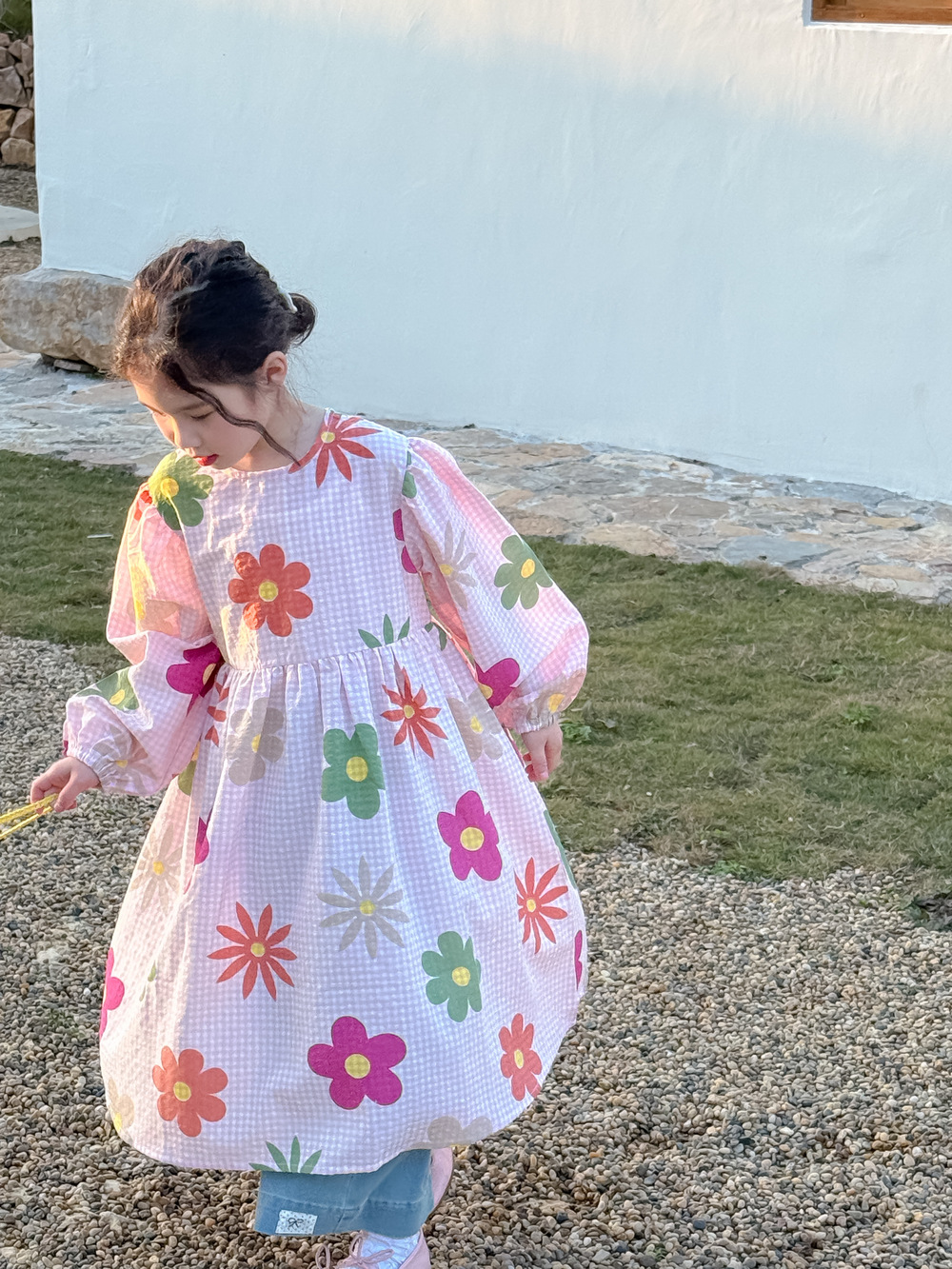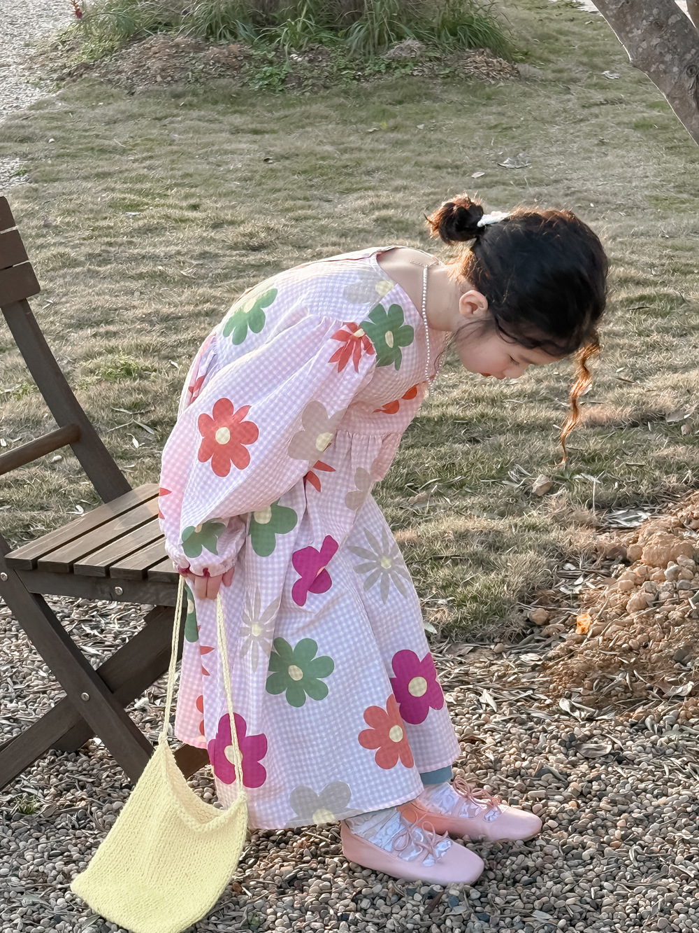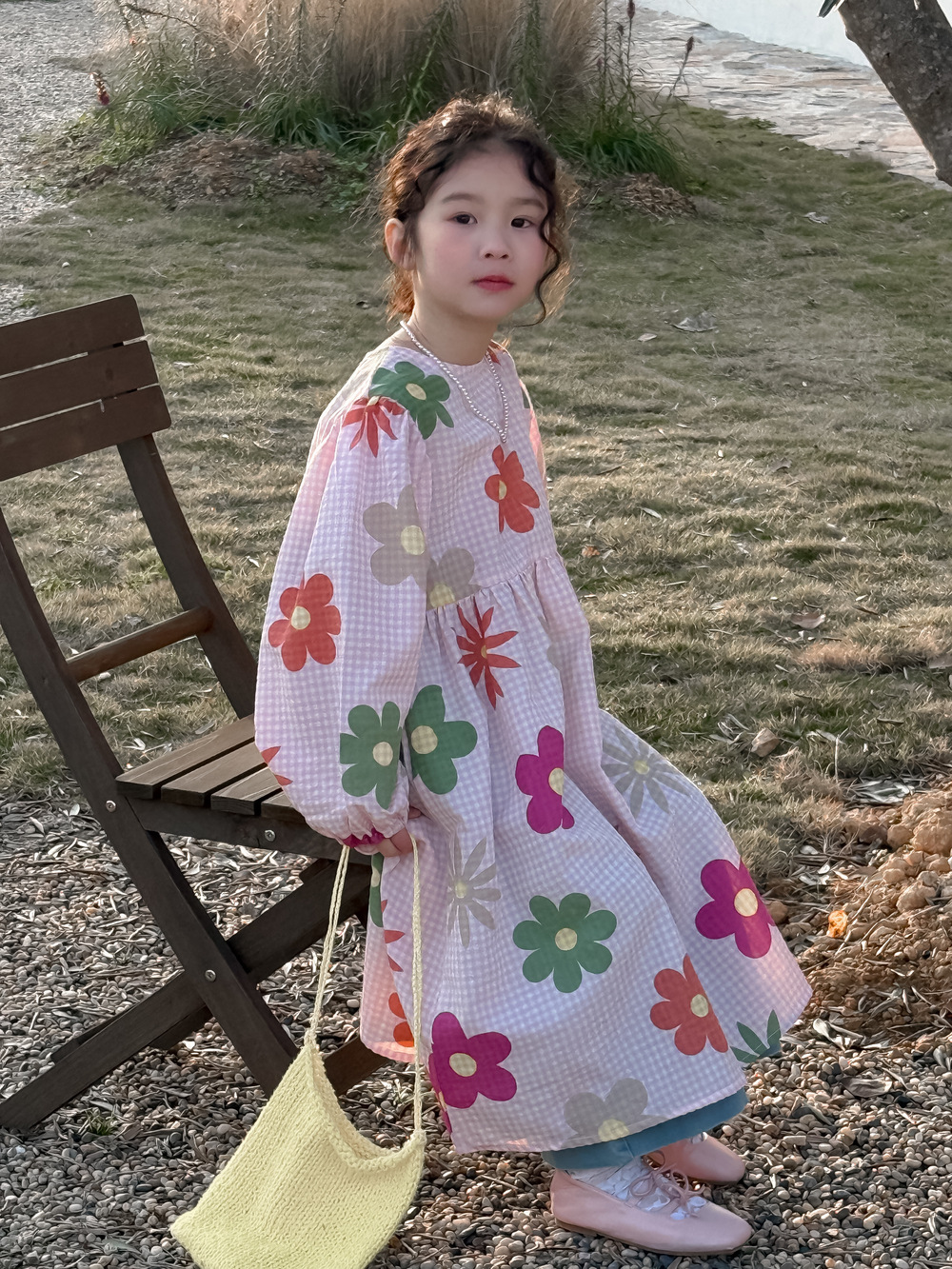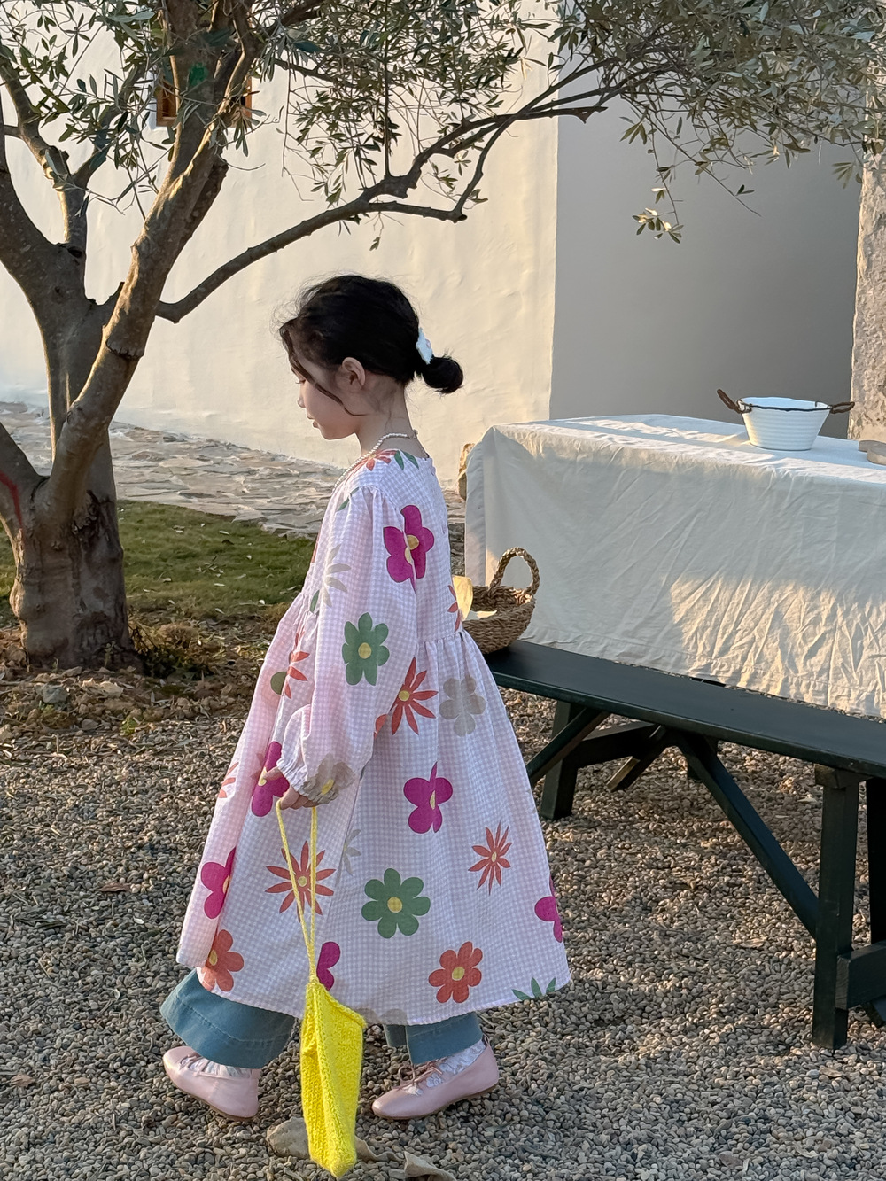 Vestido infantil holgado de manga larga con estampado floral retro colorido [mh0009191]
