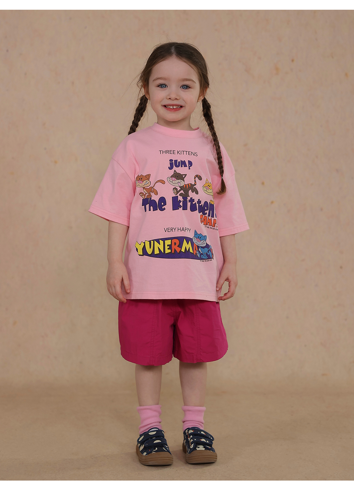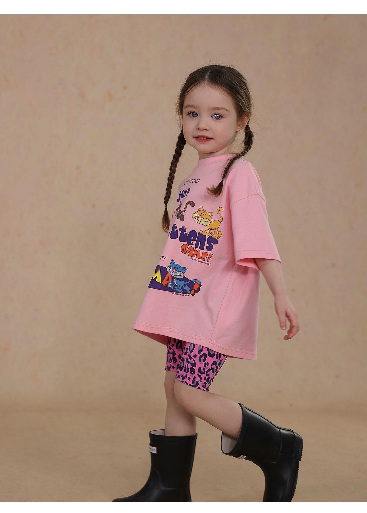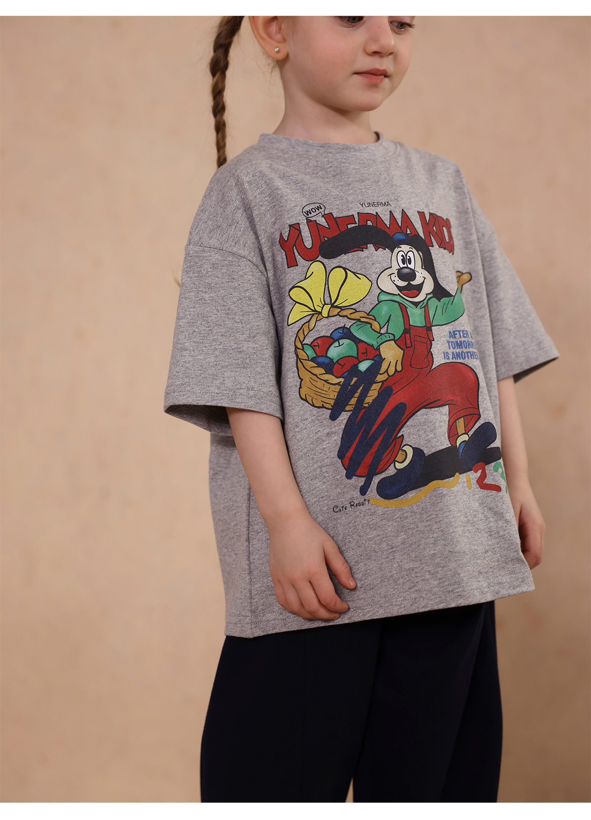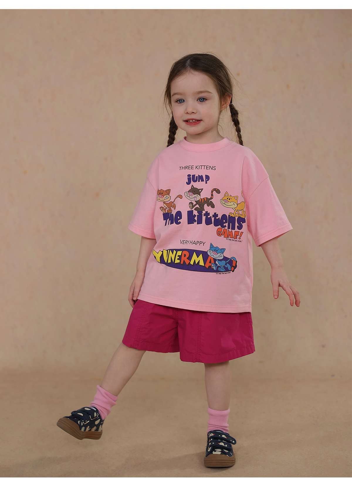 Una camiseta de verano de manga corta para niña con un adorable estampado de personajes que llama la atención. Hecha de algodón suave y transpirable, te mantendrá cómoda incluso en temporadas de mucho sudor. Su corte es ligeramente holgado, lo que permite libertad de movimiento y un toque encantador. Su diseño de estilo internacional la convierte en una prenda ideal para looks casuales de diario.