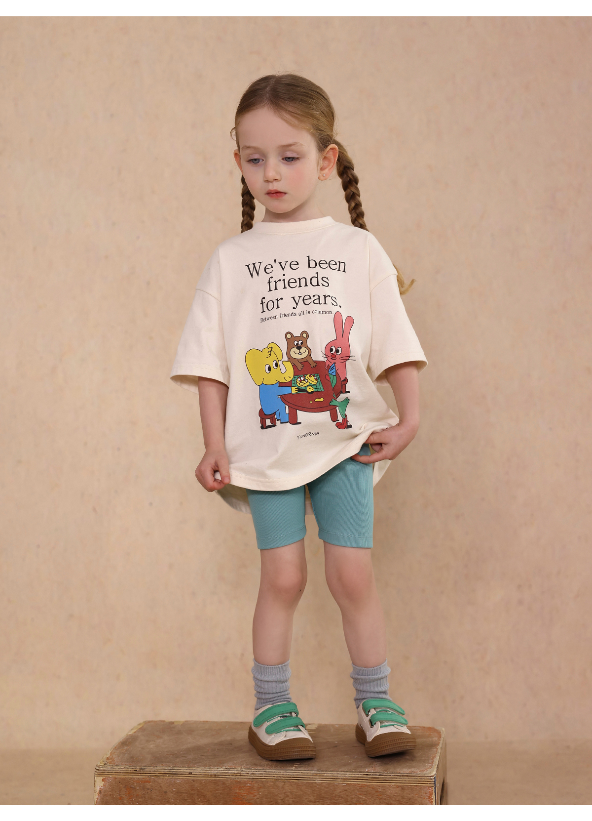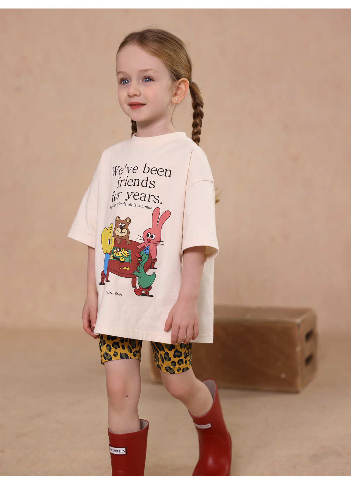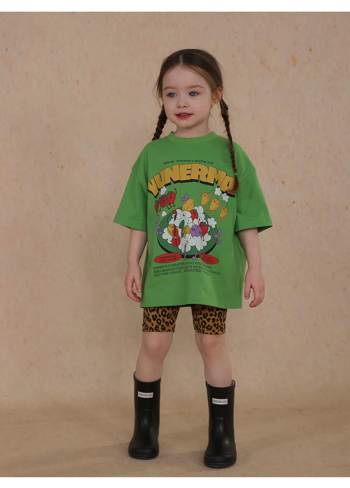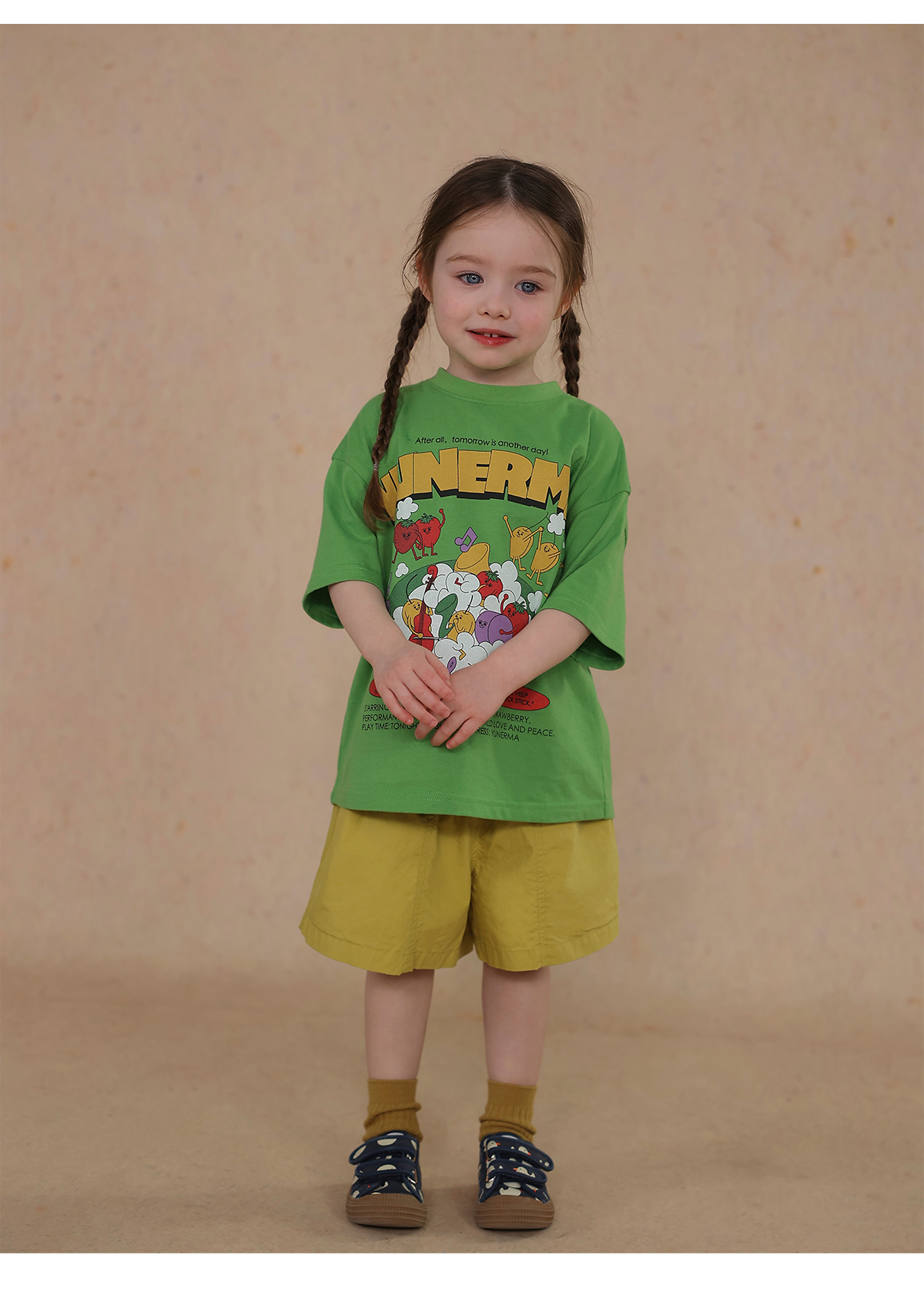 Una camiseta de verano de manga corta para niña con un adorable estampado de personajes que llama la atención. Hecha de algodón suave y transpirable, te mantendrá cómoda incluso en temporadas de mucho sudor. Su corte es ligeramente holgado, lo que permite libertad de movimiento y un toque encantador. Su diseño de estilo internacional la convierte en una prenda ideal para looks casuales de diario.