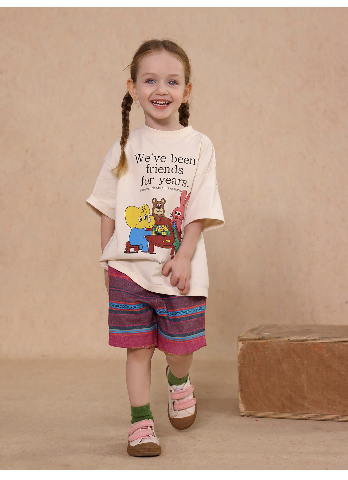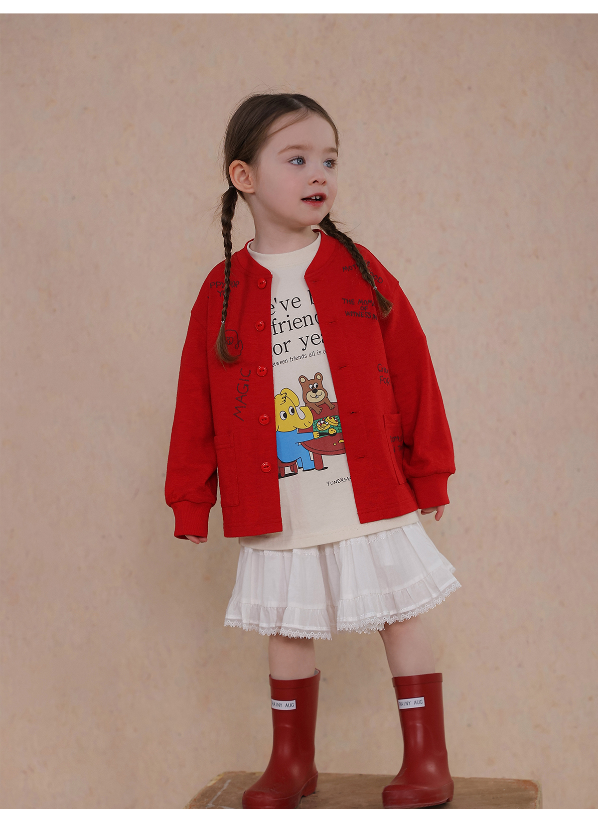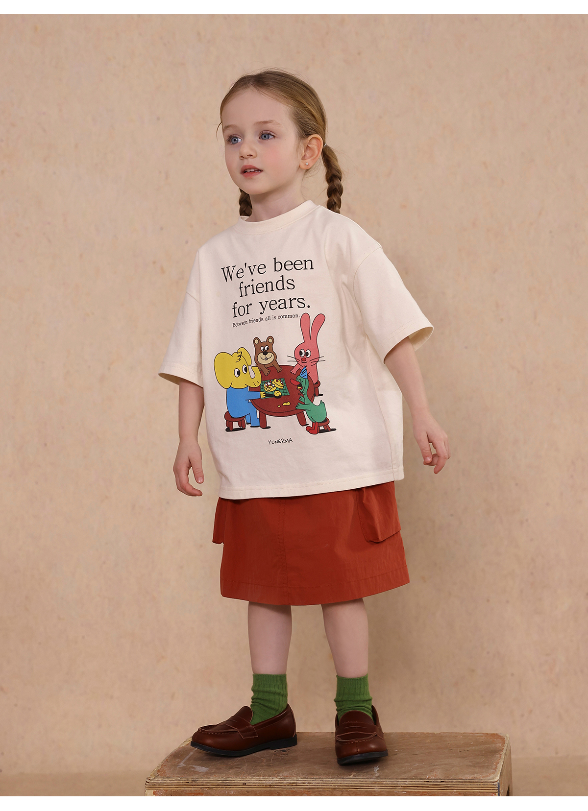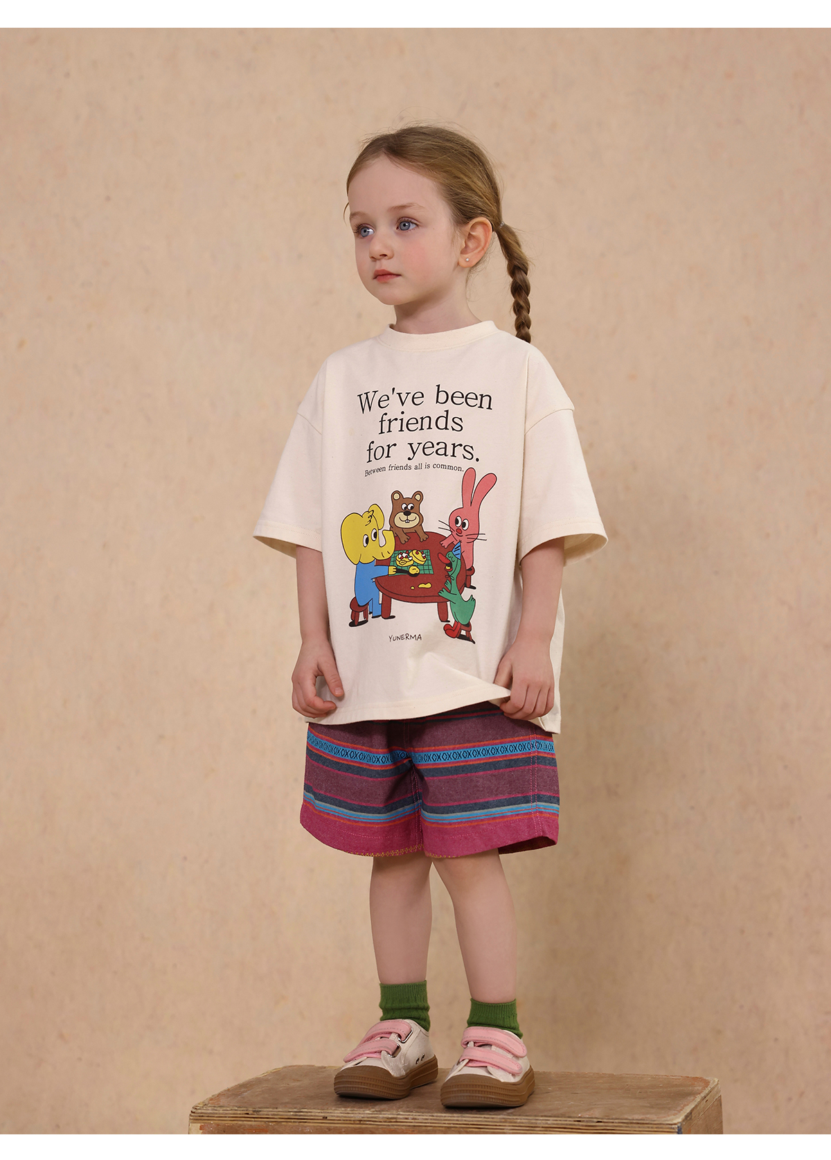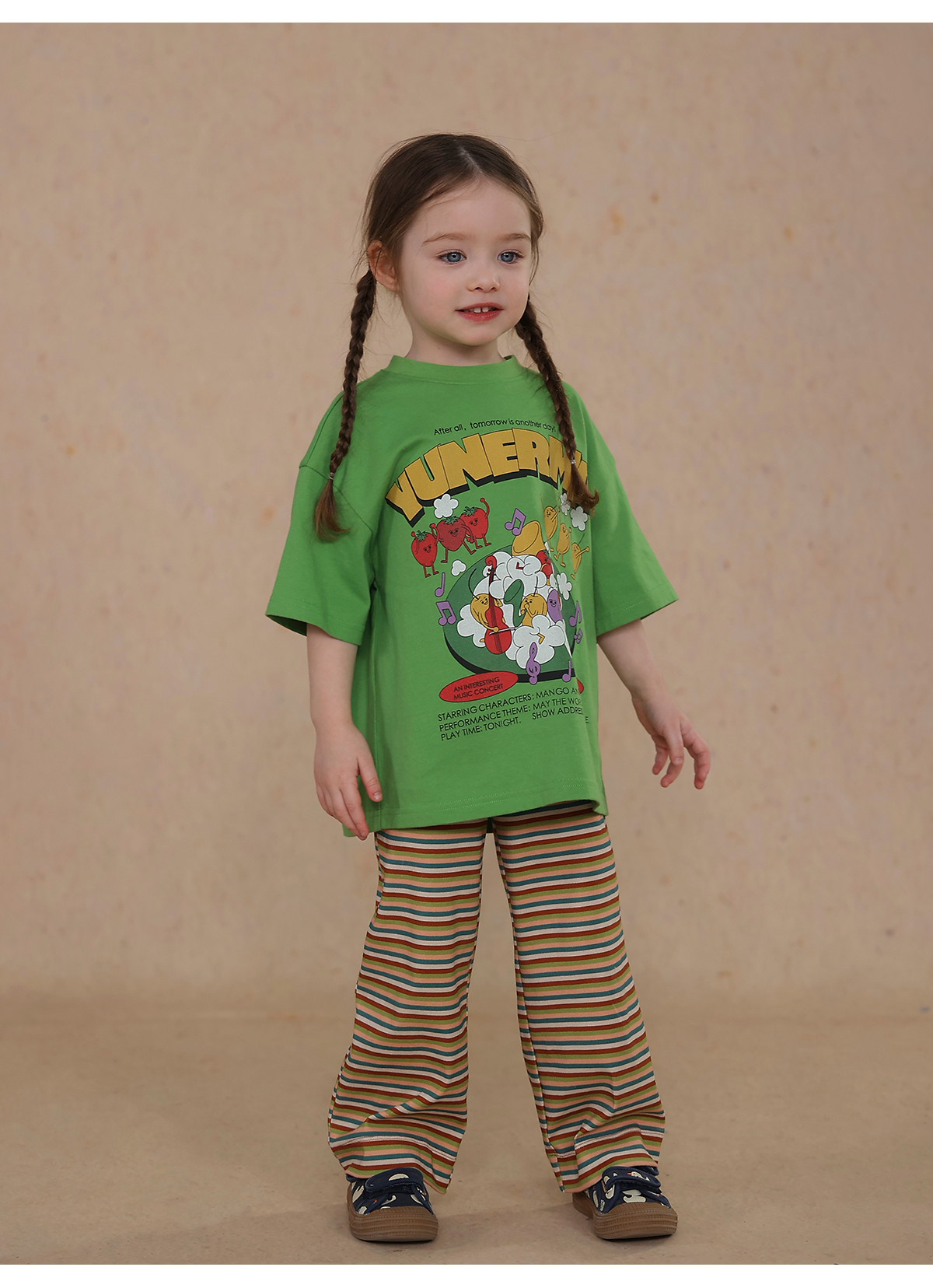 Una camiseta de verano de manga corta para niña con un adorable estampado de personajes que llama la atención. Hecha de algodón suave y transpirable, te mantendrá cómoda incluso en temporadas de mucho sudor. Su corte es ligeramente holgado, lo que permite libertad de movimiento y un toque encantador. Su diseño de estilo internacional la convierte en una prenda ideal para looks casuales de diario.