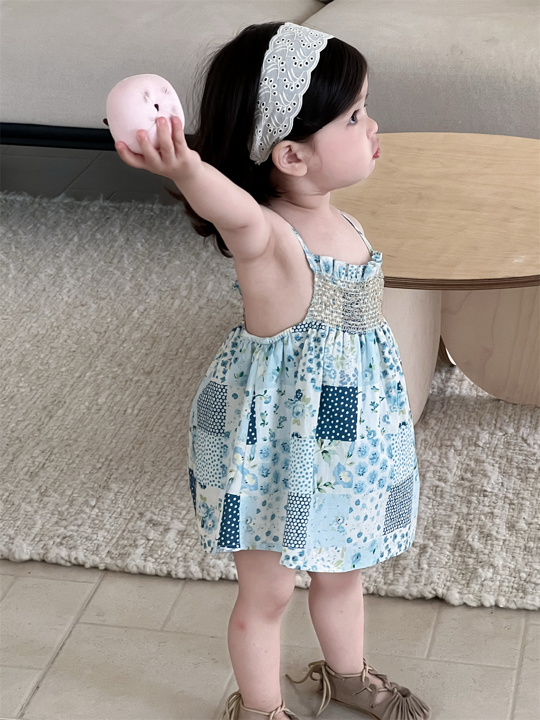 Este vestido camisola presenta un precioso estampado de cuadros y un patchwork de adorables motivos florales. Su diseño de bloques de color, con múltiples colores combinados, le da un toque elegante. El diseño de tirantes realza la ternura de tu bebé.