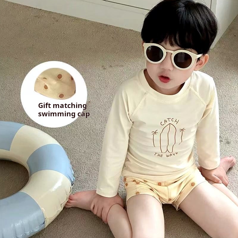 夏の水辺のレジャーにぴったりの、ボーイズ水着 プリント長袖トップスとショートパンツのスイムウェアセットです。シンプルでおしゃれなプリントデザインは、男の子も女の子も着こなせるユニセックス仕様。