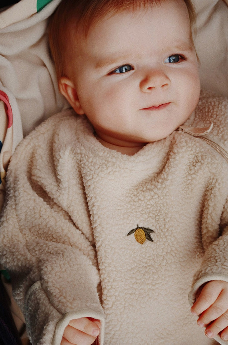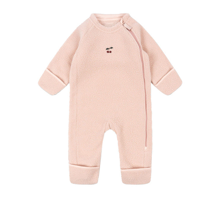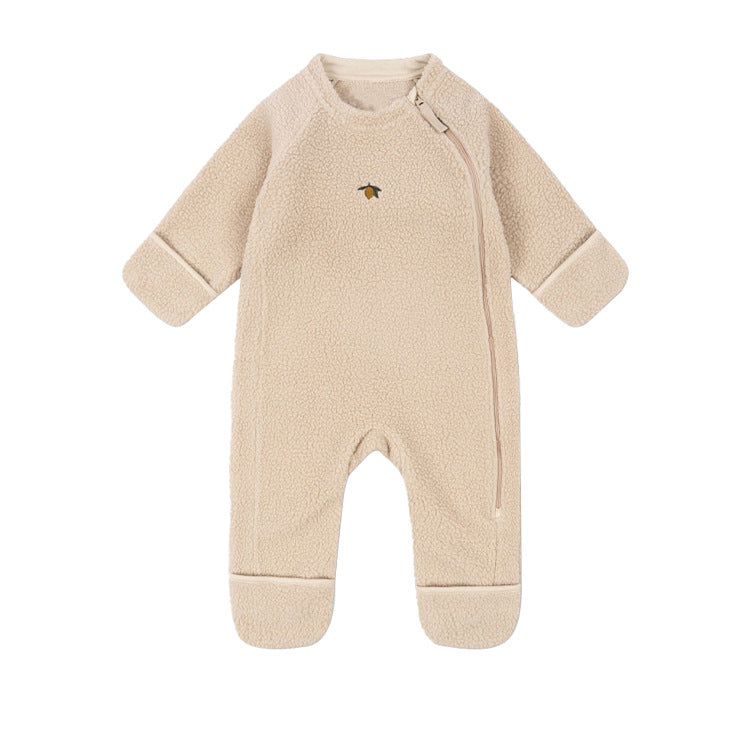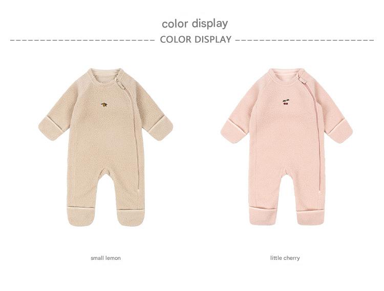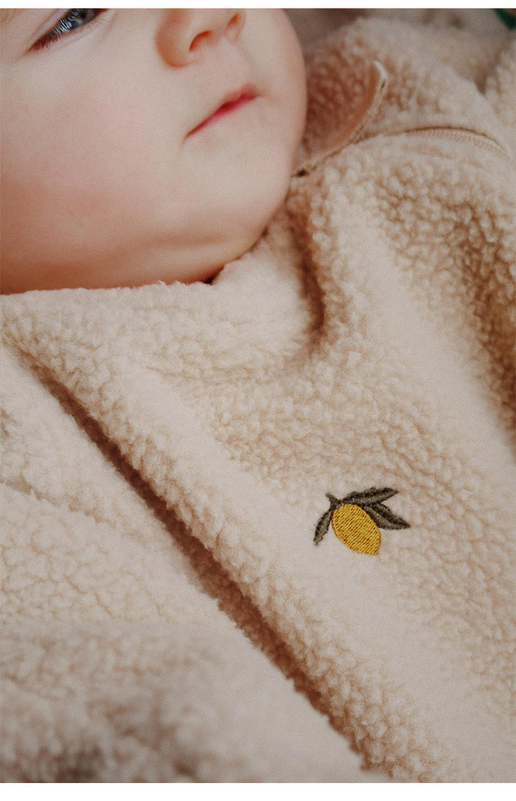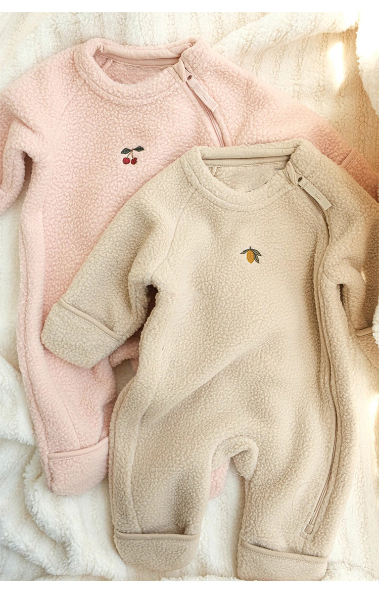 ふんわりとしたボアフリース素材に繊細な刺繍を施した、おしゃれなアウタージャンプスーツ。ジップアップデザインで着脱もスムーズなこのベビー服は、ベビーを寒さから守る全身の防寒着として活躍します。足先まで包み込むフリースラップは、暖かさを逃さず、寒い季節のお出かけに最適。温もりとデザイン性を兼ね備えたベビー用のクロールウェアとして、デイリーの装いに上質な心地よさと愛らしさをプラスするロンパースです。