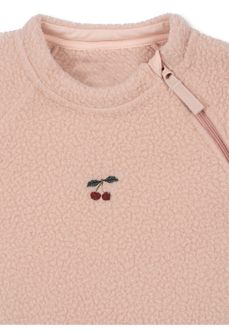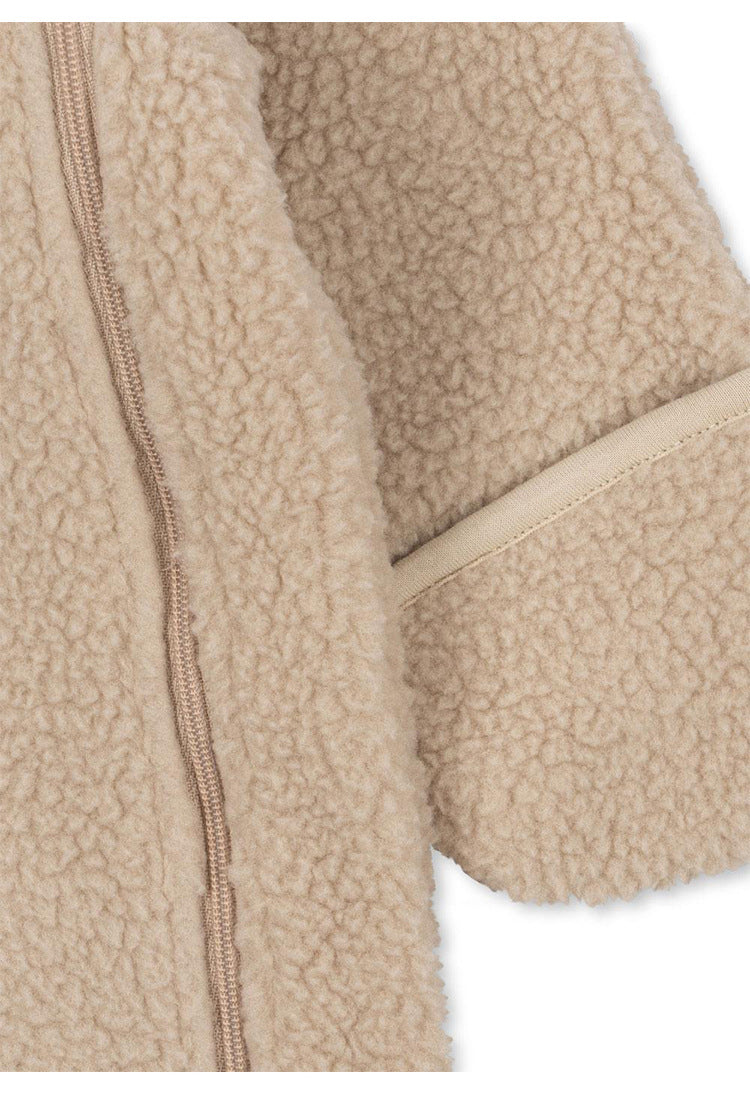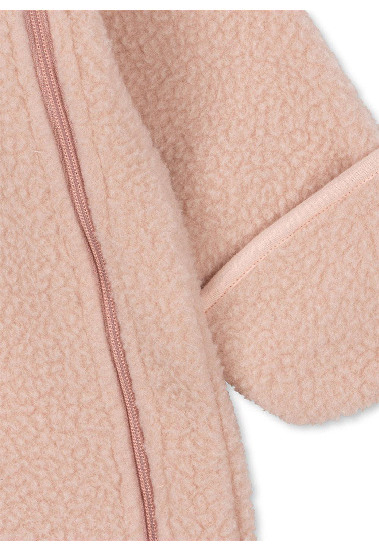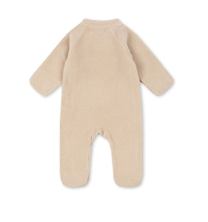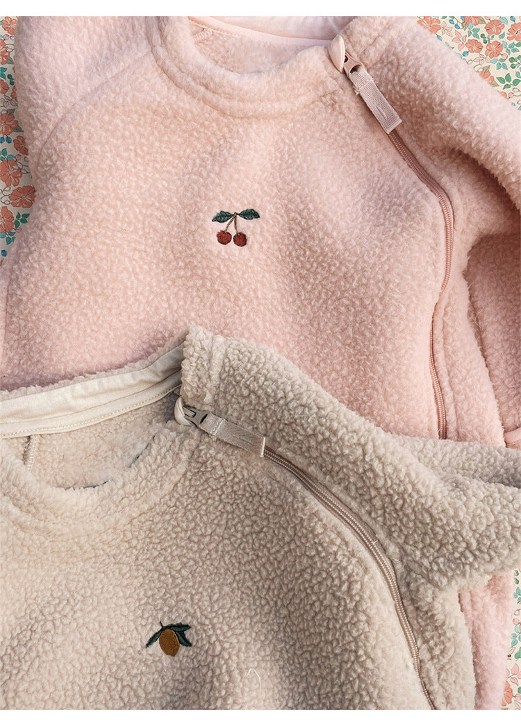 ふんわりとしたボアフリース素材に繊細な刺繍を施した、おしゃれなアウタージャンプスーツ。ジップアップデザインで着脱もスムーズなこのベビー服は、ベビーを寒さから守る全身の防寒着として活躍します。足先まで包み込むフリースラップは、暖かさを逃さず、寒い季節のお出かけに最適。温もりとデザイン性を兼ね備えたベビー用のクロールウェアとして、デイリーの装いに上質な心地よさと愛らしさをプラスするロンパースです。