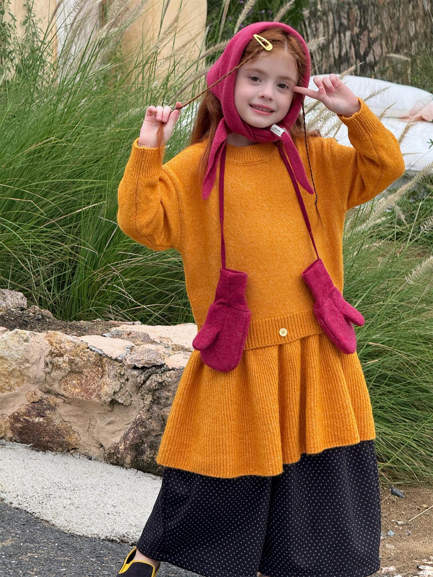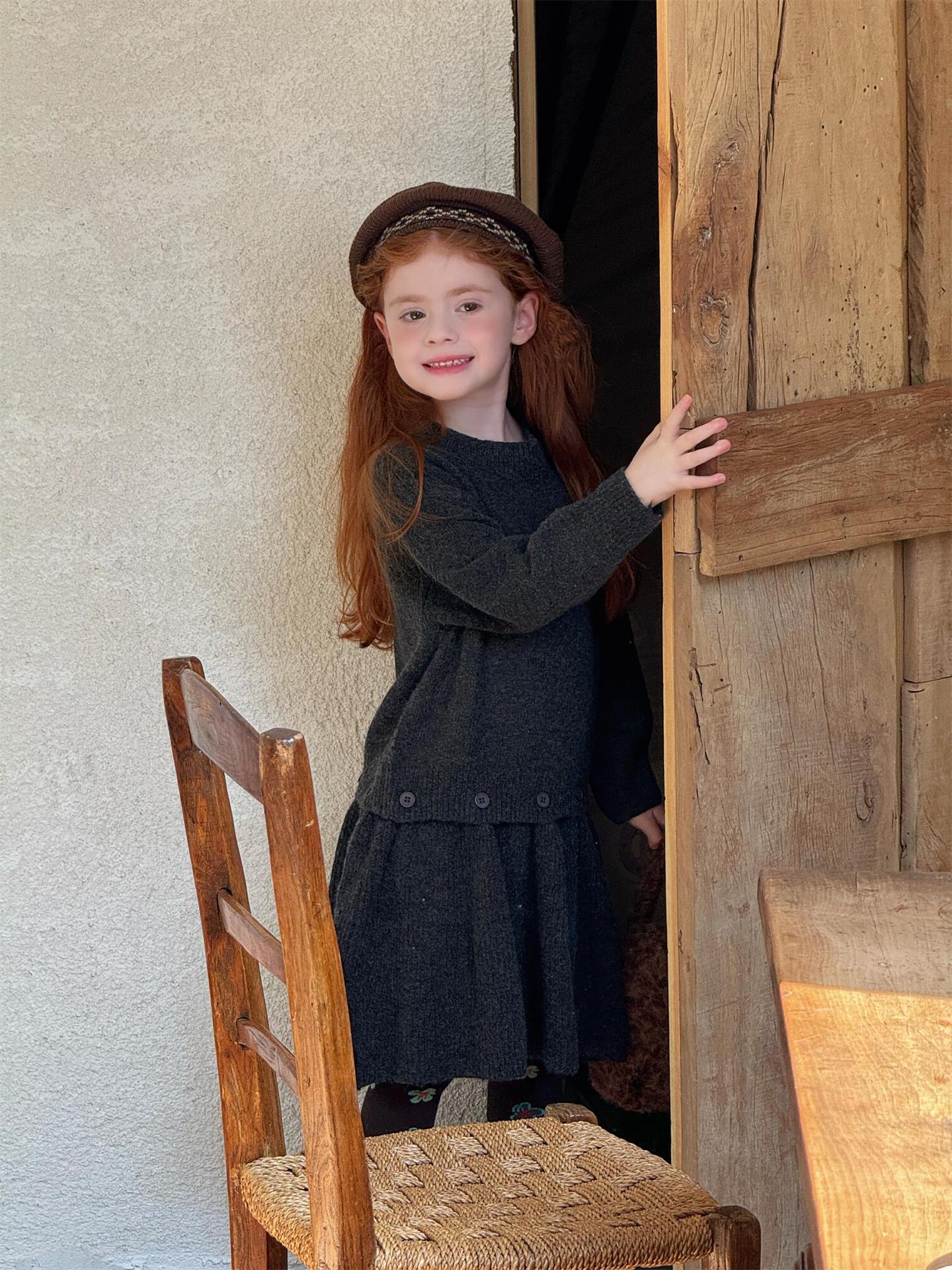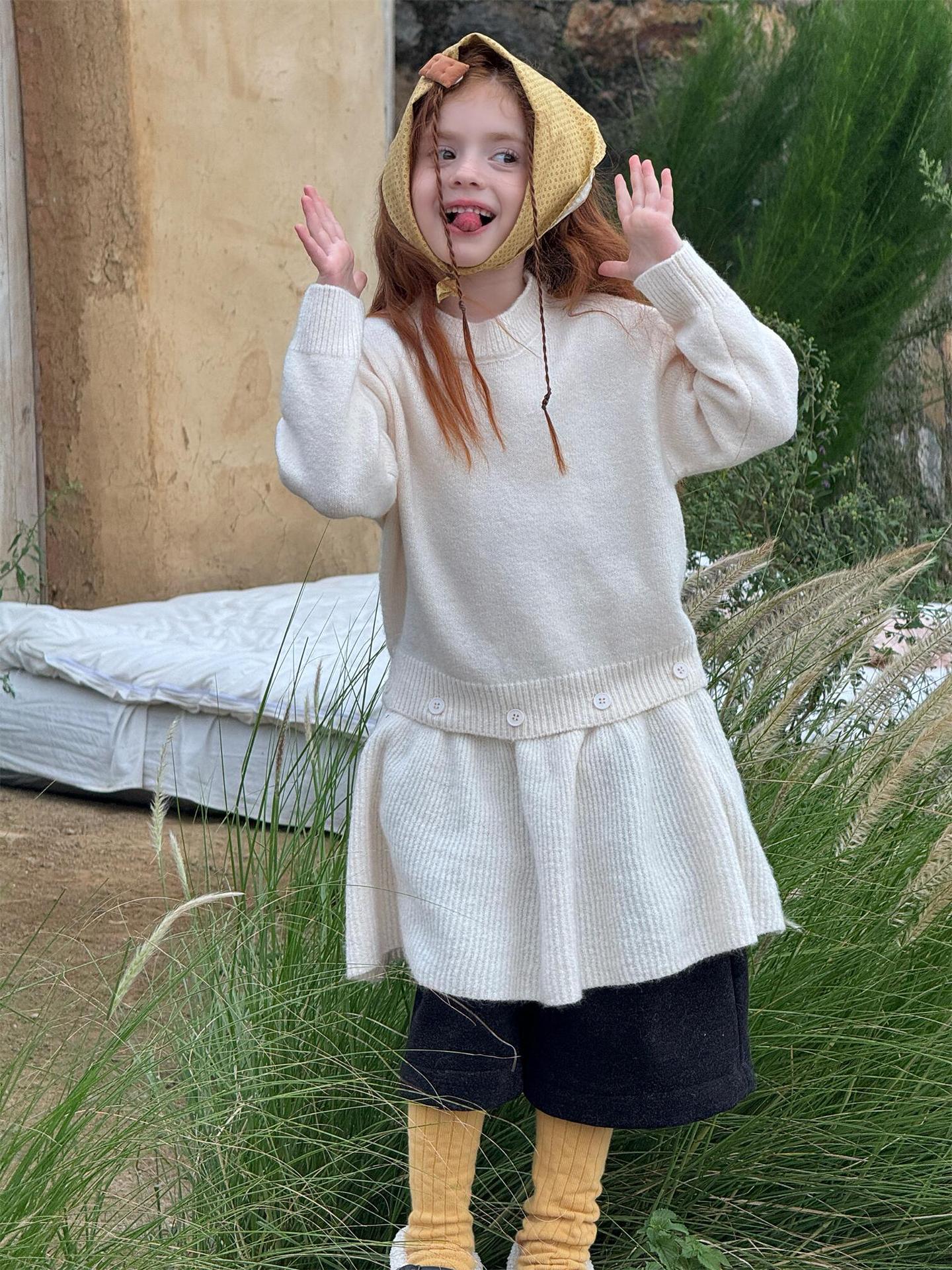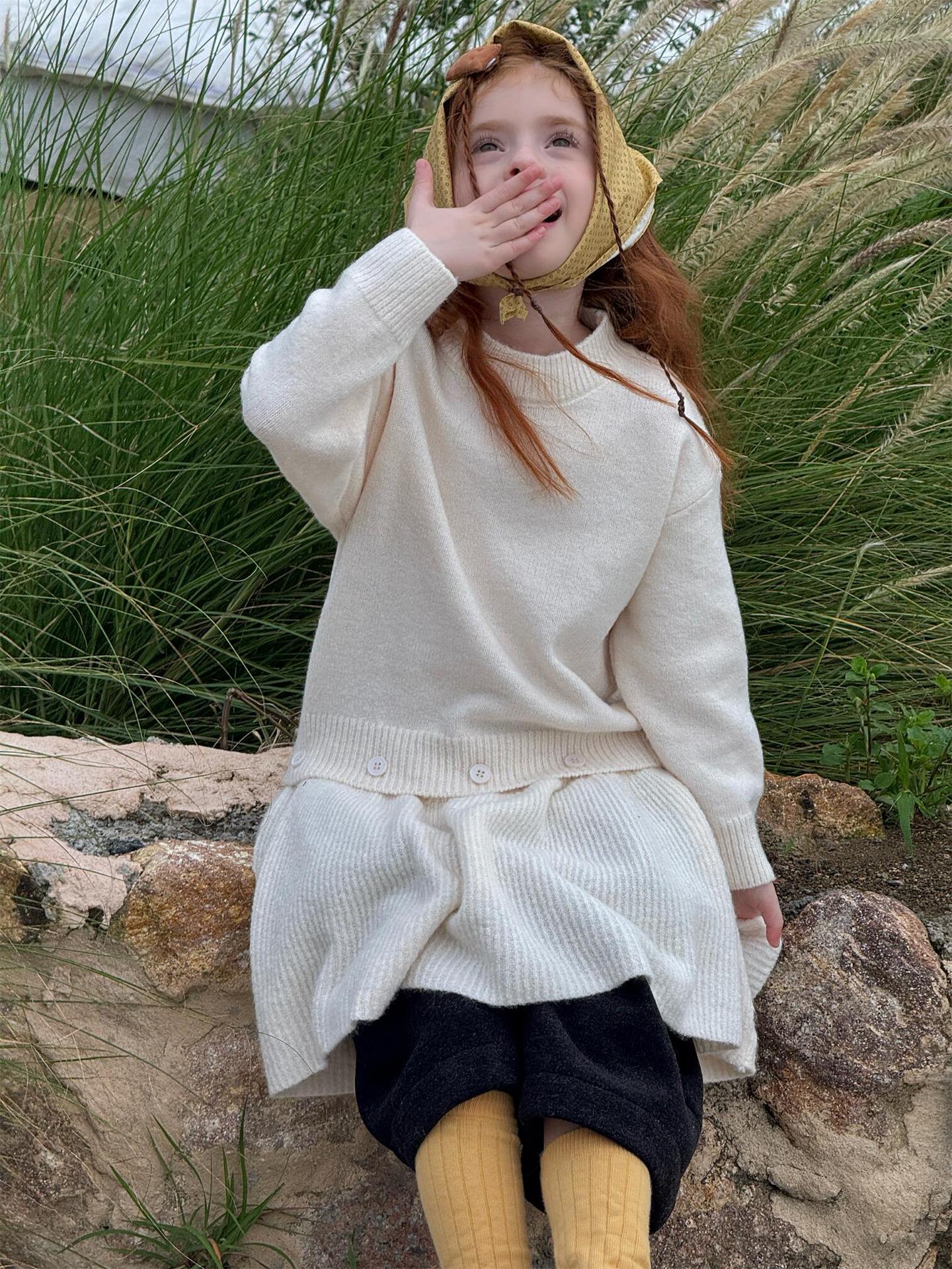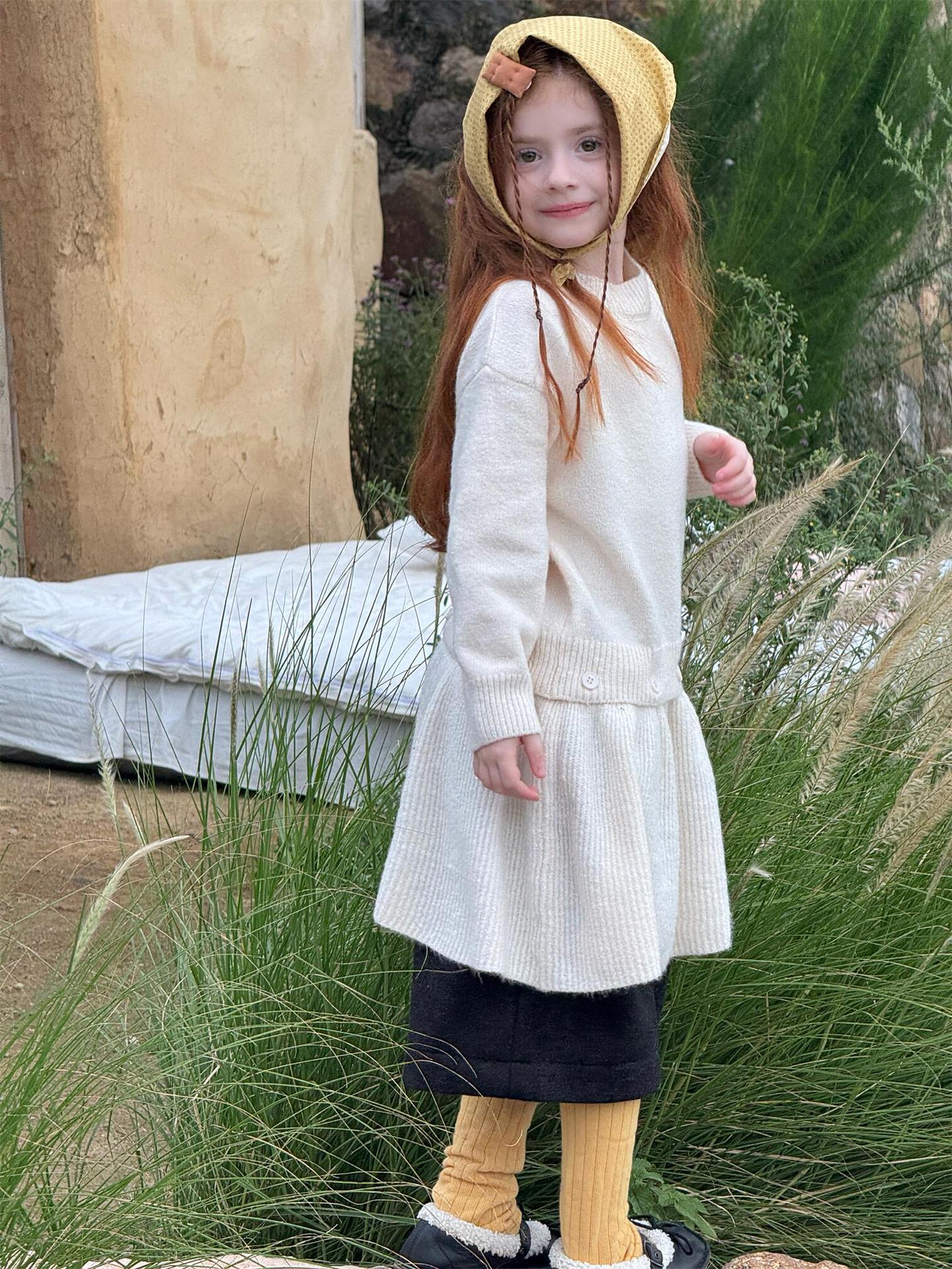 一枚でシックに決まる長袖セーターワンピースは、ニットのプルオーバーとフリル裾のドッキングデザインが目を引く一着です。洗練されたバイカラーのコントラストが全体のトーンに深みを加え、女の子のエレガントなスタイルを演出します。ゆったりとしたシルエットで着心地も良く、この上質なドレスは普段使いから特別な日まで活躍する子ども服として、ワードローブに彩りをもたらします。