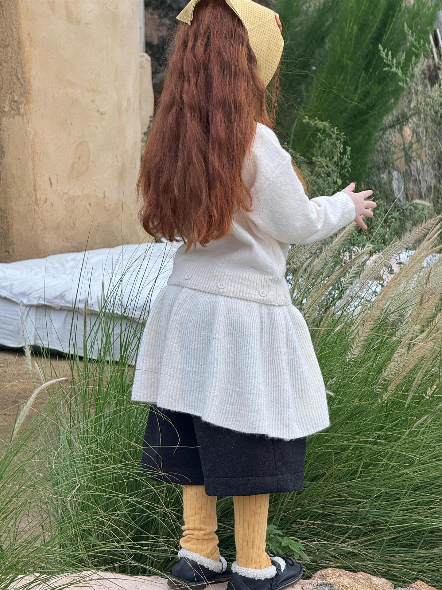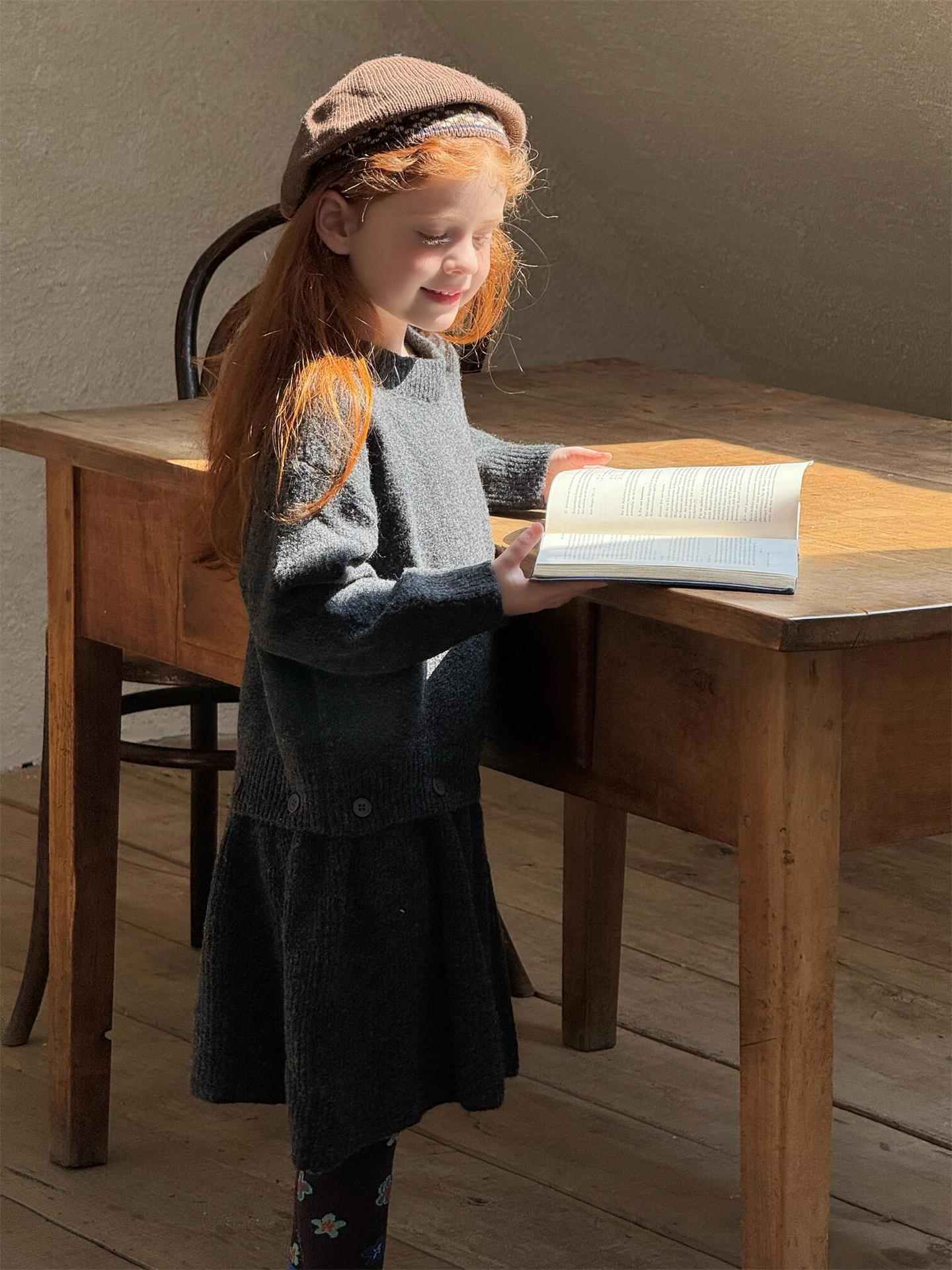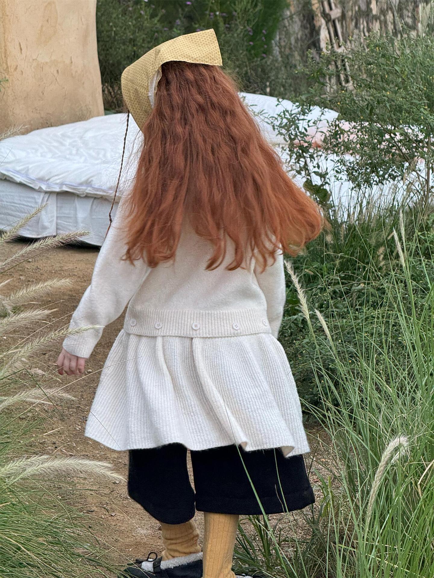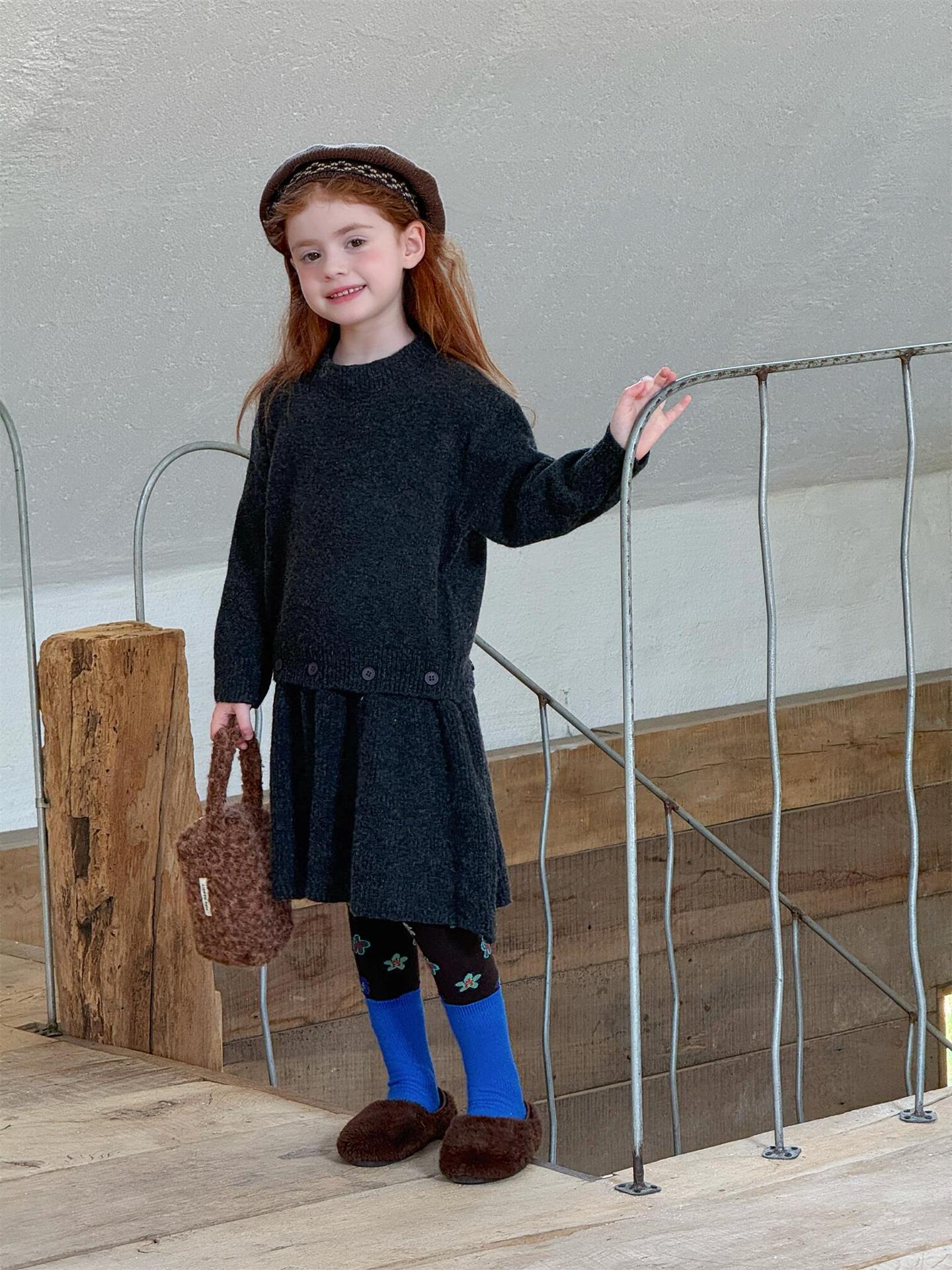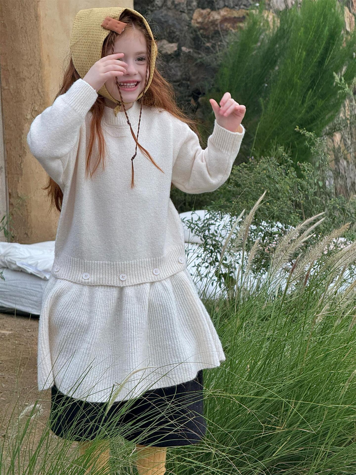 一枚でシックに決まる長袖セーターワンピースは、ニットのプルオーバーとフリル裾のドッキングデザインが目を引く一着です。洗練されたバイカラーのコントラストが全体のトーンに深みを加え、女の子のエレガントなスタイルを演出します。ゆったりとしたシルエットで着心地も良く、この上質なドレスは普段使いから特別な日まで活躍する子ども服として、ワードローブに彩りをもたらします。