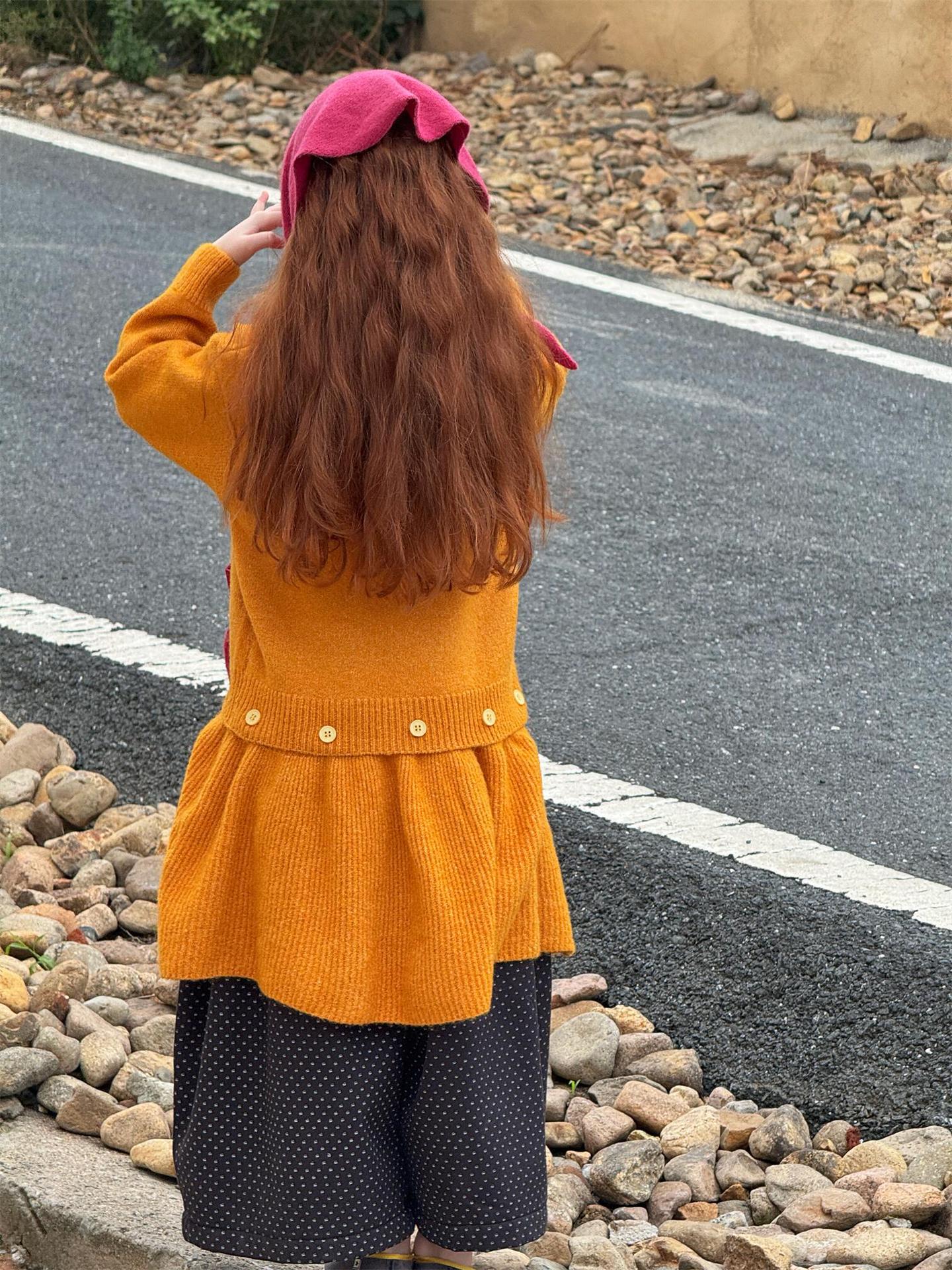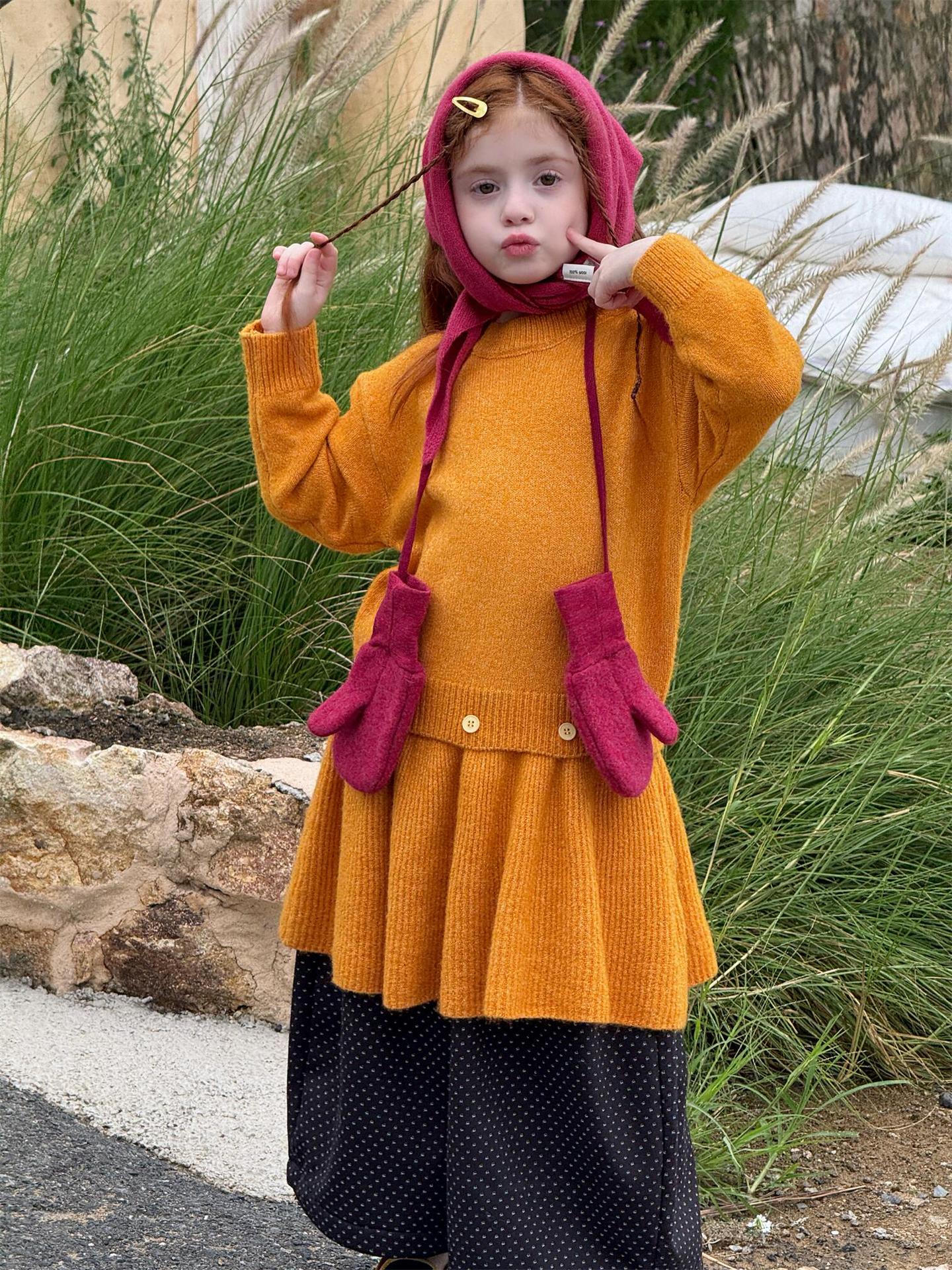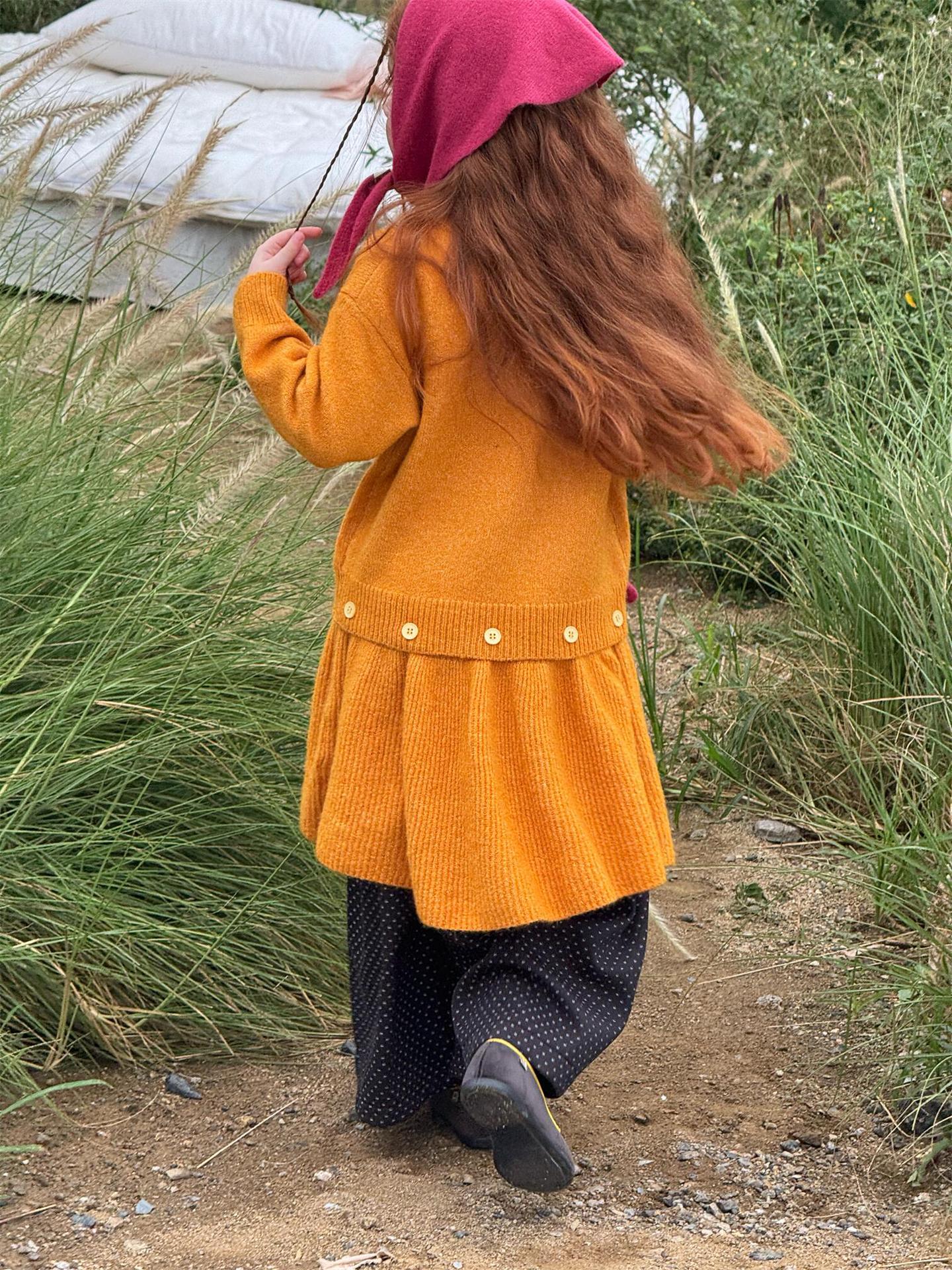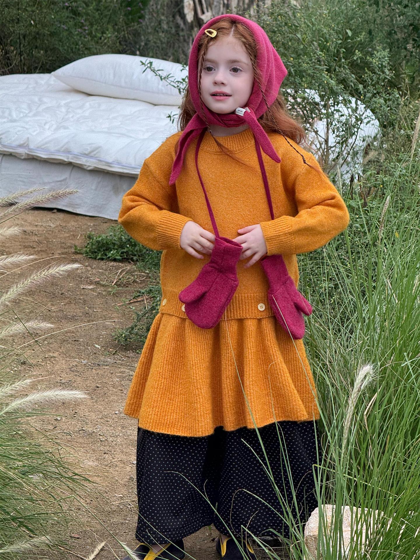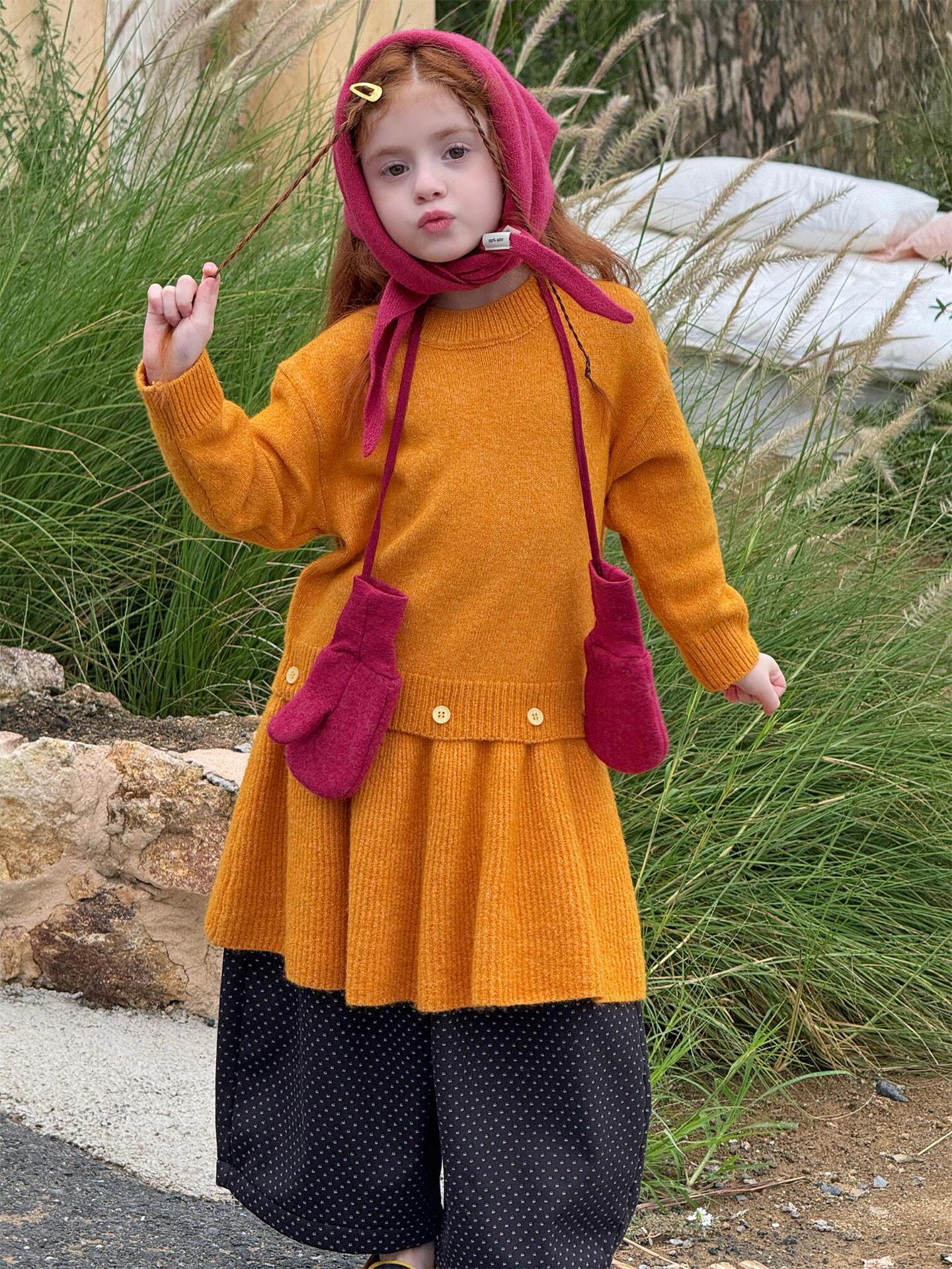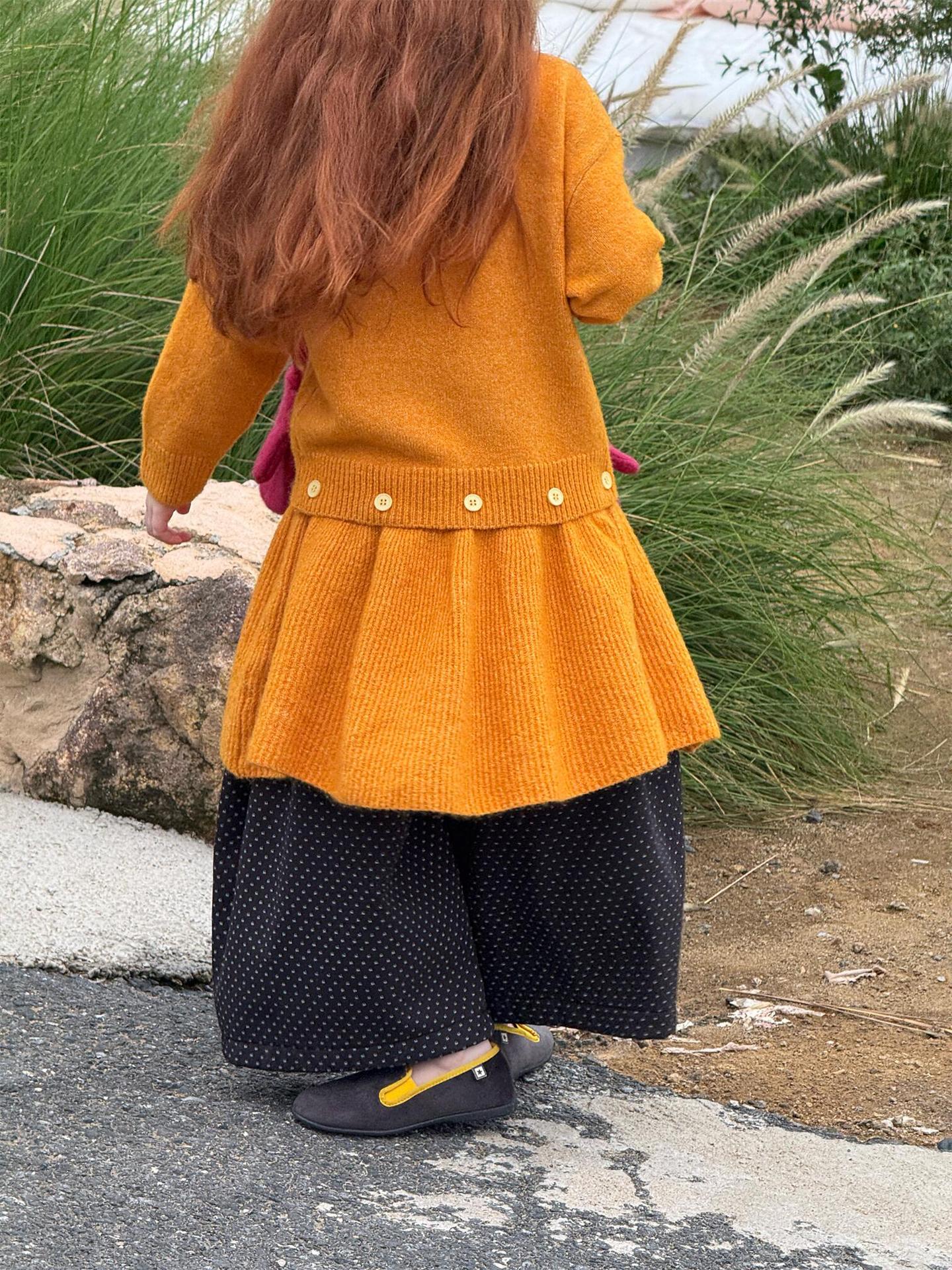 一枚でシックに決まる長袖セーターワンピースは、ニットのプルオーバーとフリル裾のドッキングデザインが目を引く一着です。洗練されたバイカラーのコントラストが全体のトーンに深みを加え、女の子のエレガントなスタイルを演出します。ゆったりとしたシルエットで着心地も良く、この上質なドレスは普段使いから特別な日まで活躍する子ども服として、ワードローブに彩りをもたらします。