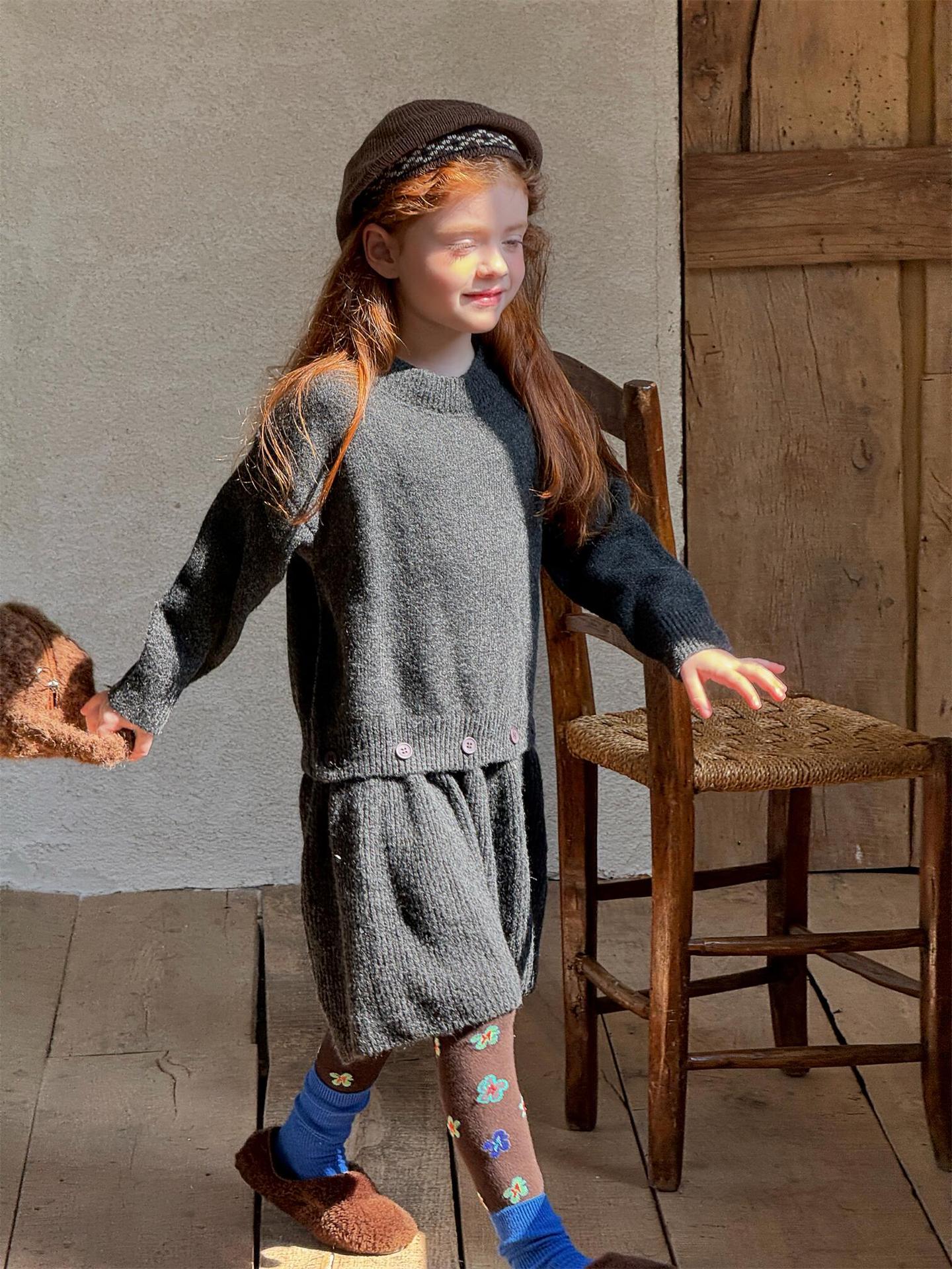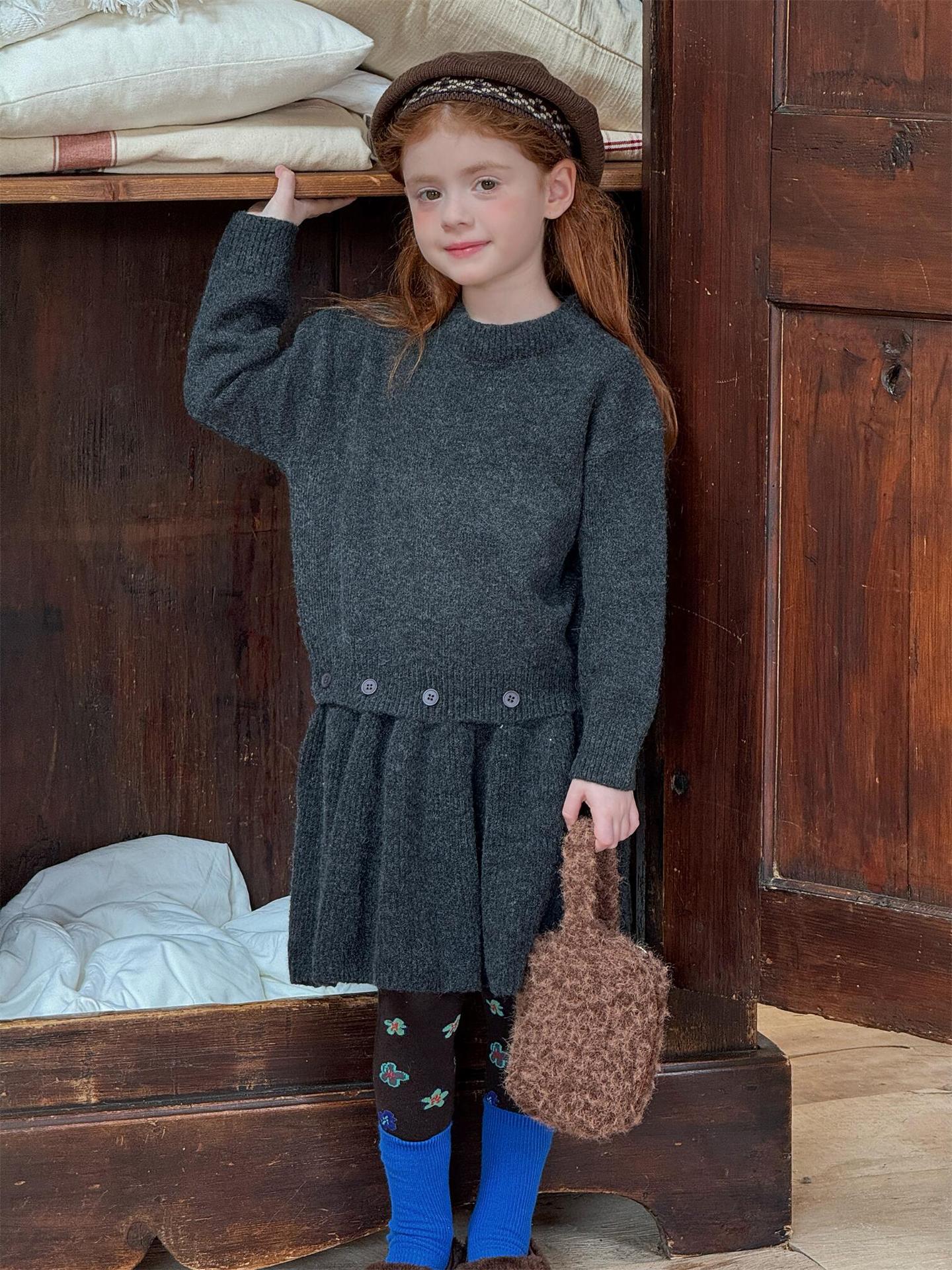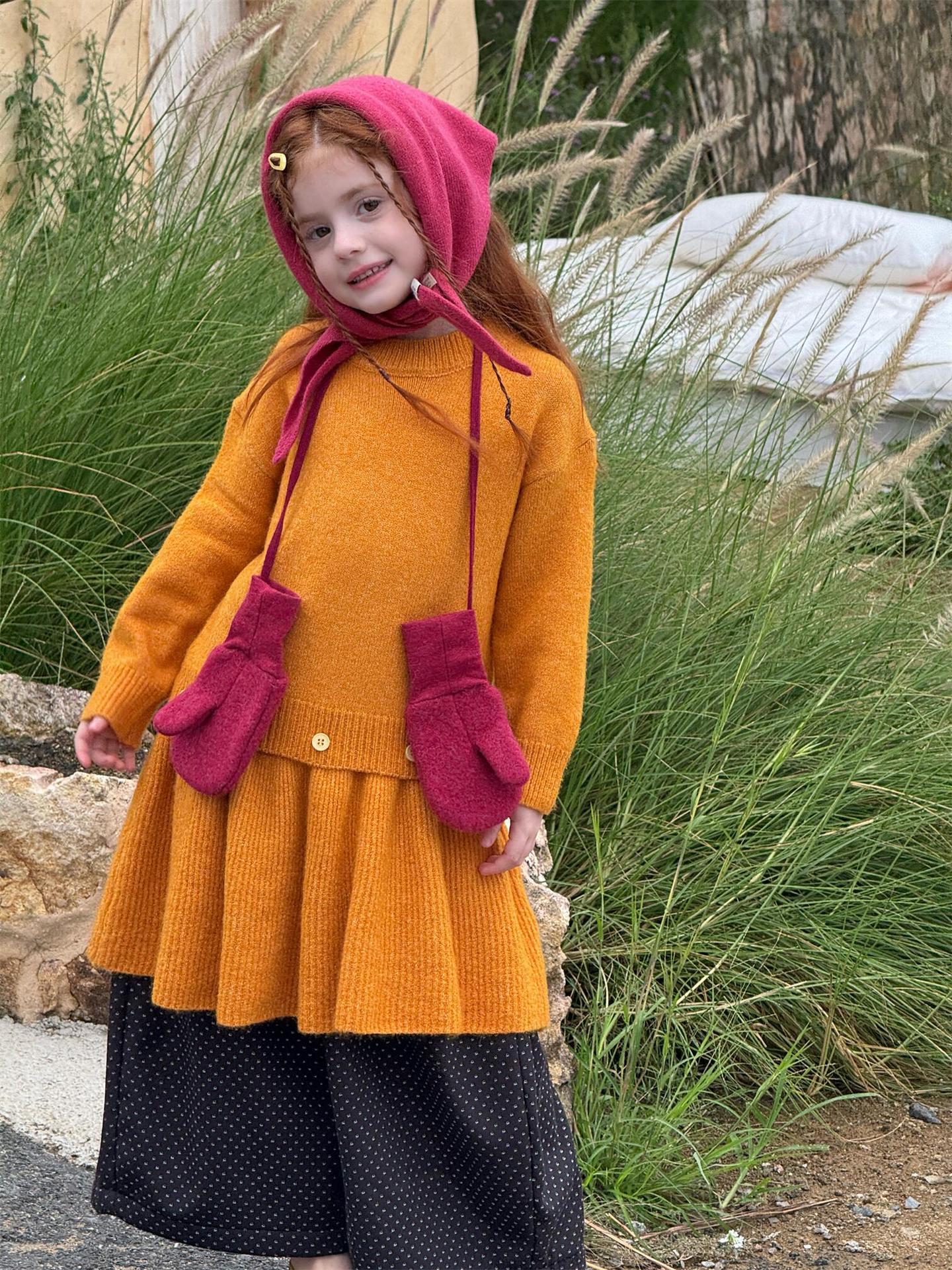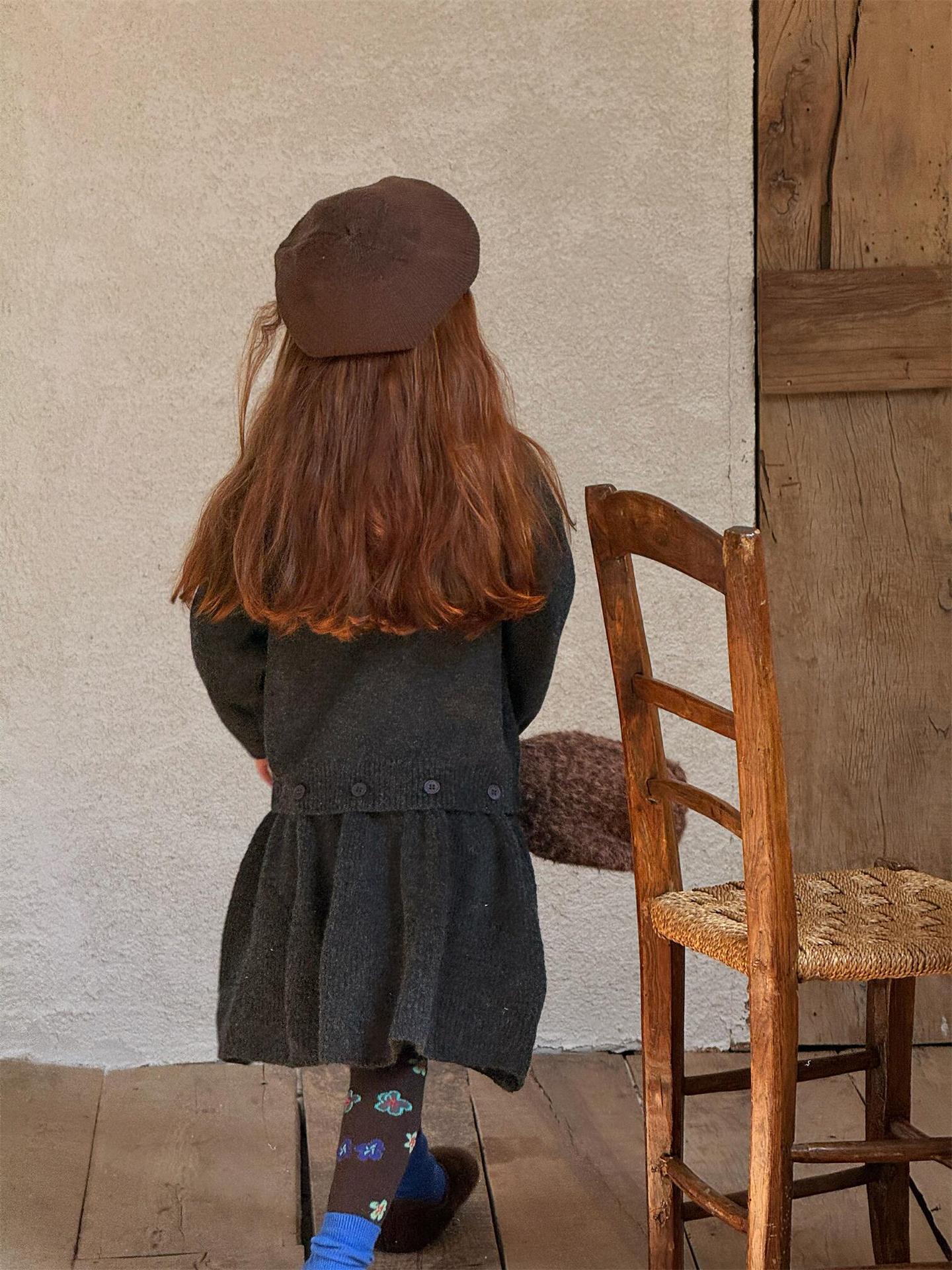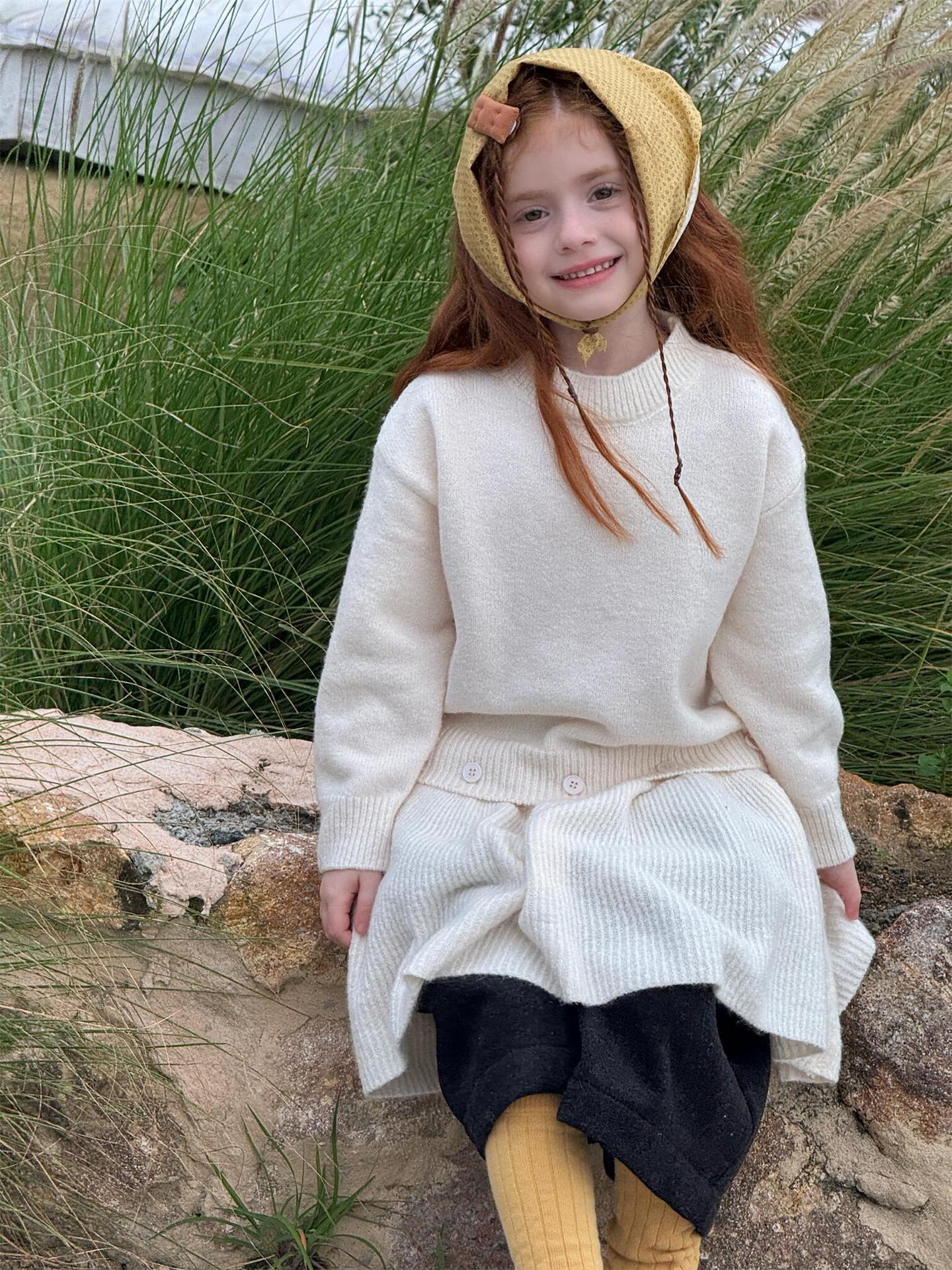 一枚でシックに決まる長袖セーターワンピースは、ニットのプルオーバーとフリル裾のドッキングデザインが目を引く一着です。洗練されたバイカラーのコントラストが全体のトーンに深みを加え、女の子のエレガントなスタイルを演出します。ゆったりとしたシルエットで着心地も良く、この上質なドレスは普段使いから特別な日まで活躍する子ども服として、ワードローブに彩りをもたらします。
