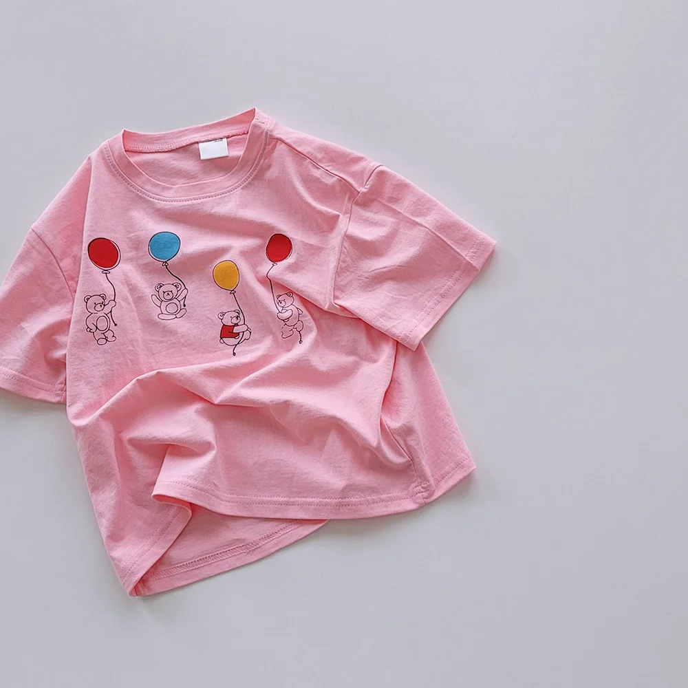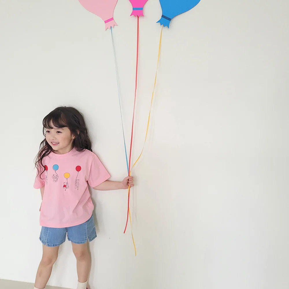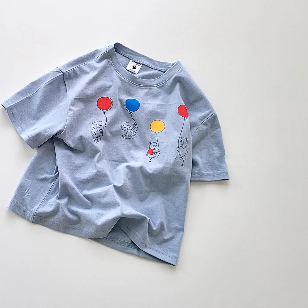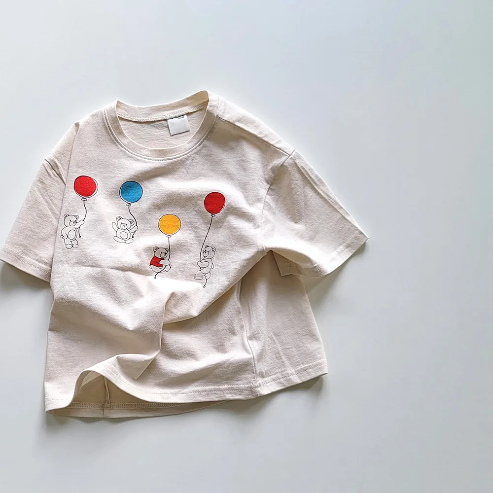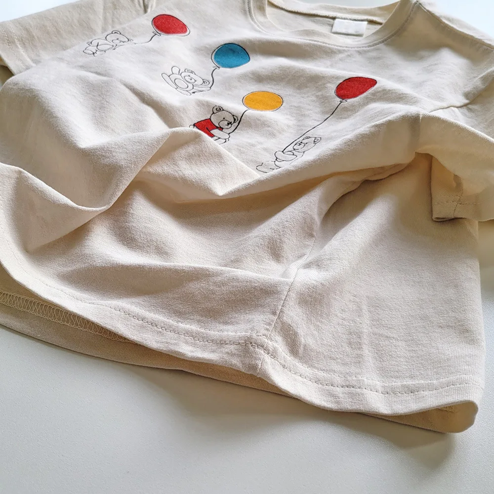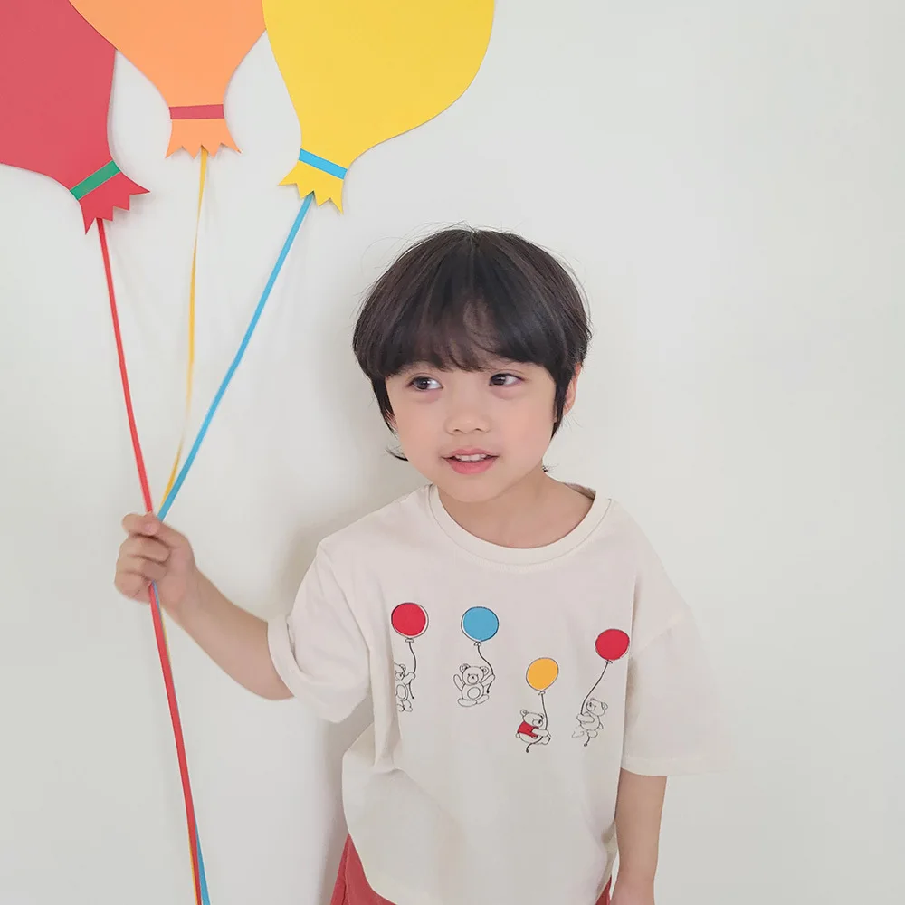 子供用のかわいいティーシャツです。夏の季節にぴったりの軽い生地で、ベアくまの風船がプリントされています。子供たちのカートゥーン風のスタイルにぴったり。柔らかくて快適なコットン素材で、動きやすさも抜群です。3つのカラーから選べます。