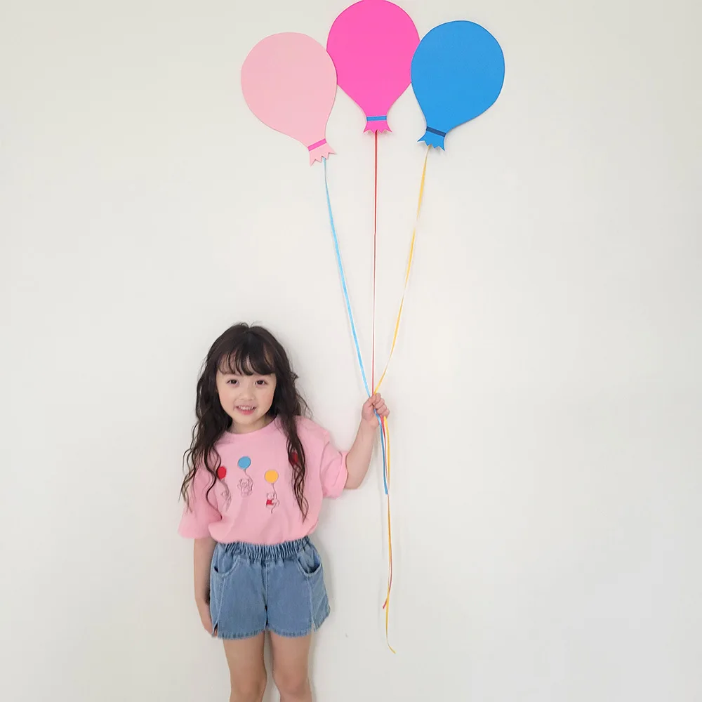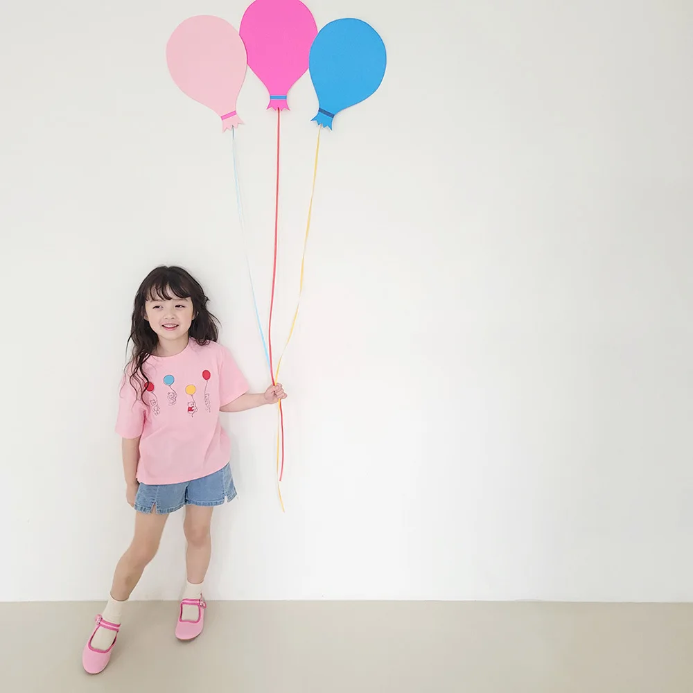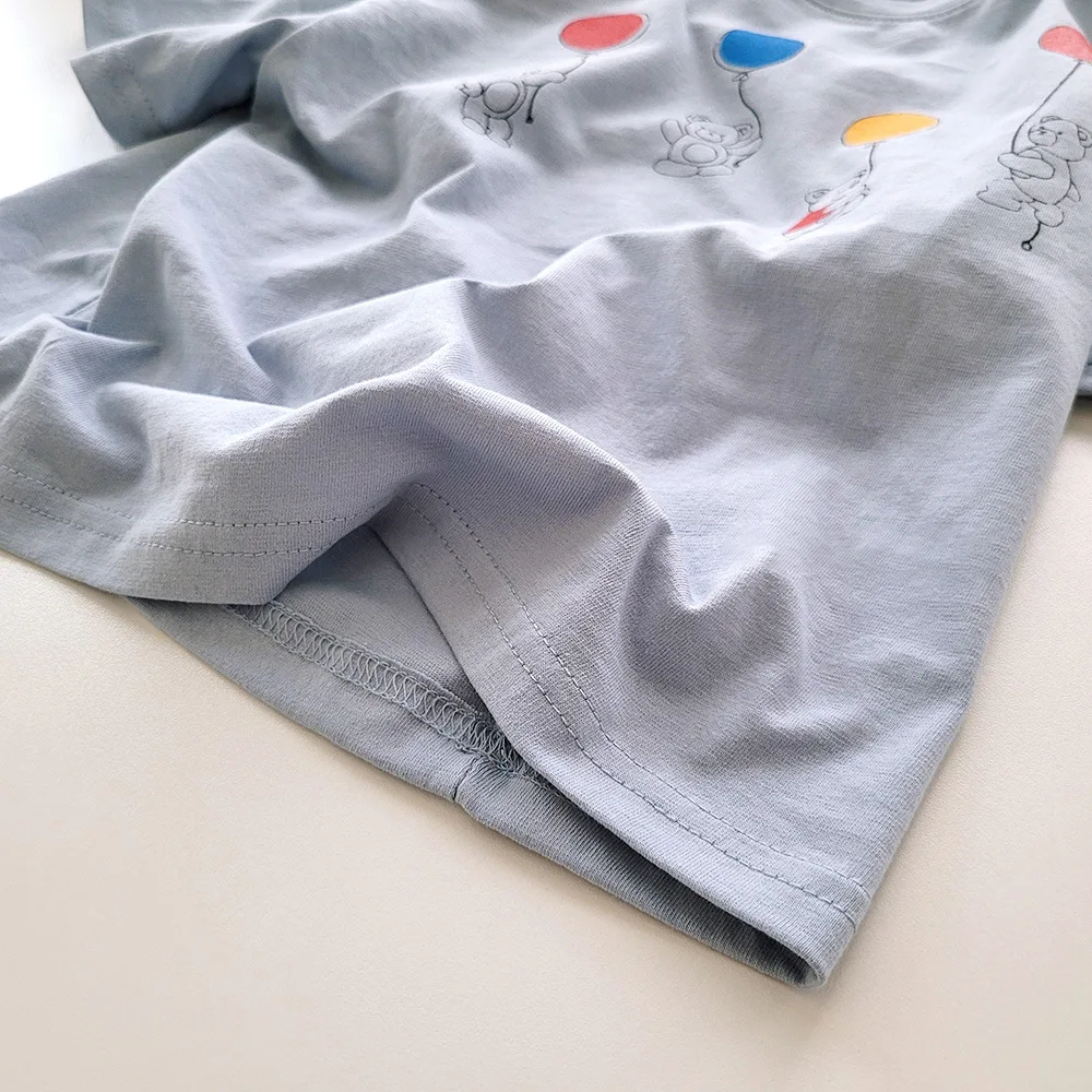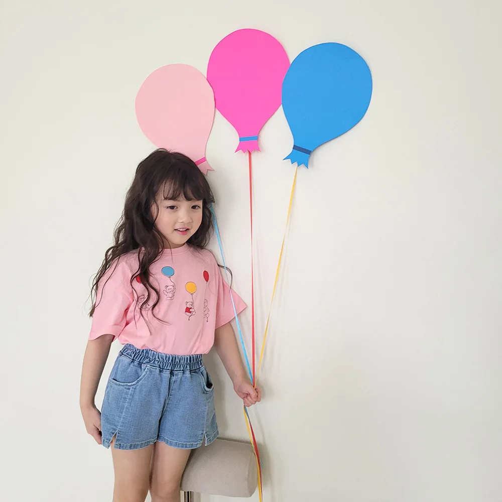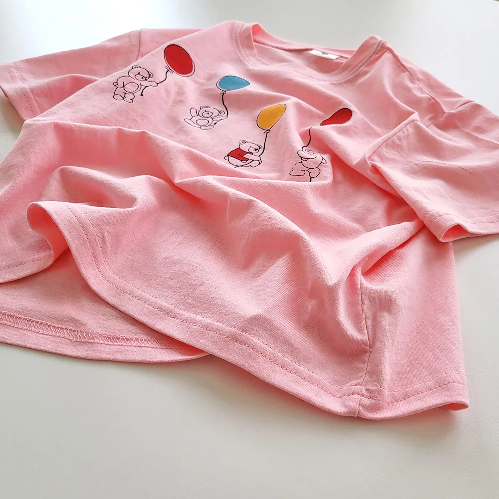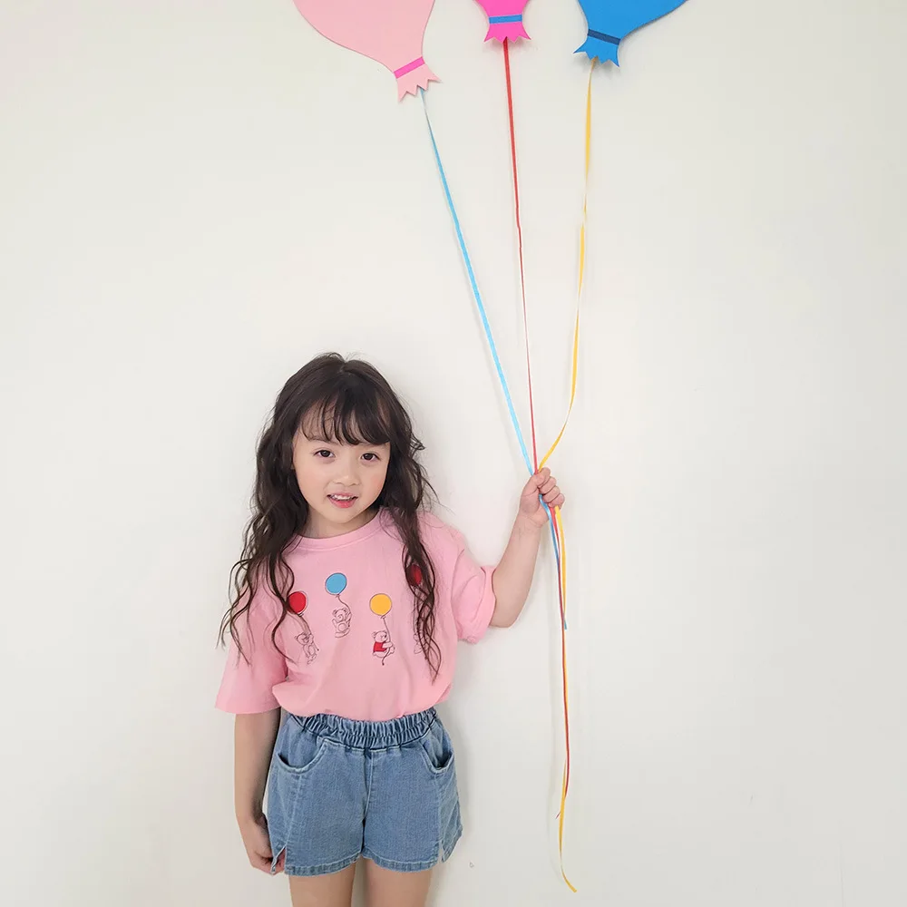 子供用のかわいいティーシャツです。夏の季節にぴったりの軽い生地で、ベアくまの風船がプリントされています。子供たちのカートゥーン風のスタイルにぴったり。柔らかくて快適なコットン素材で、動きやすさも抜群です。3つのカラーから選べます。