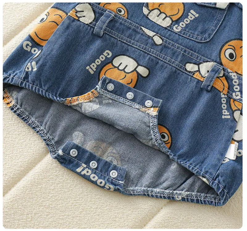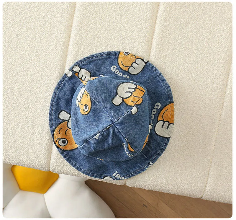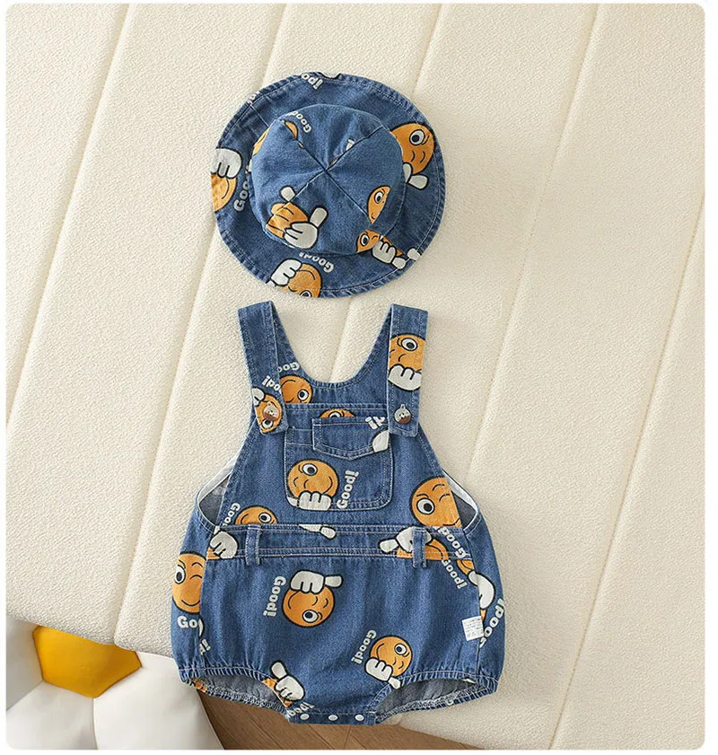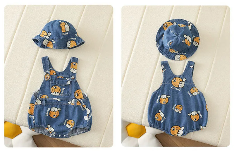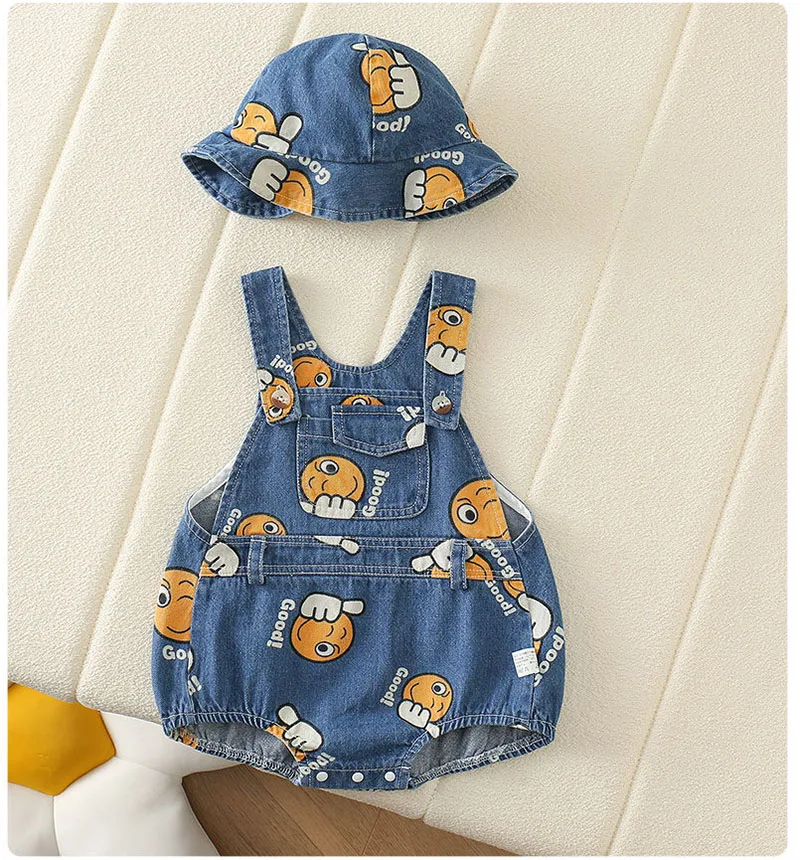 ベビーオーバーオール 帽子セット デニムサスペンダーボディスーツ バケットハット スマイルプリント【mh0005768】