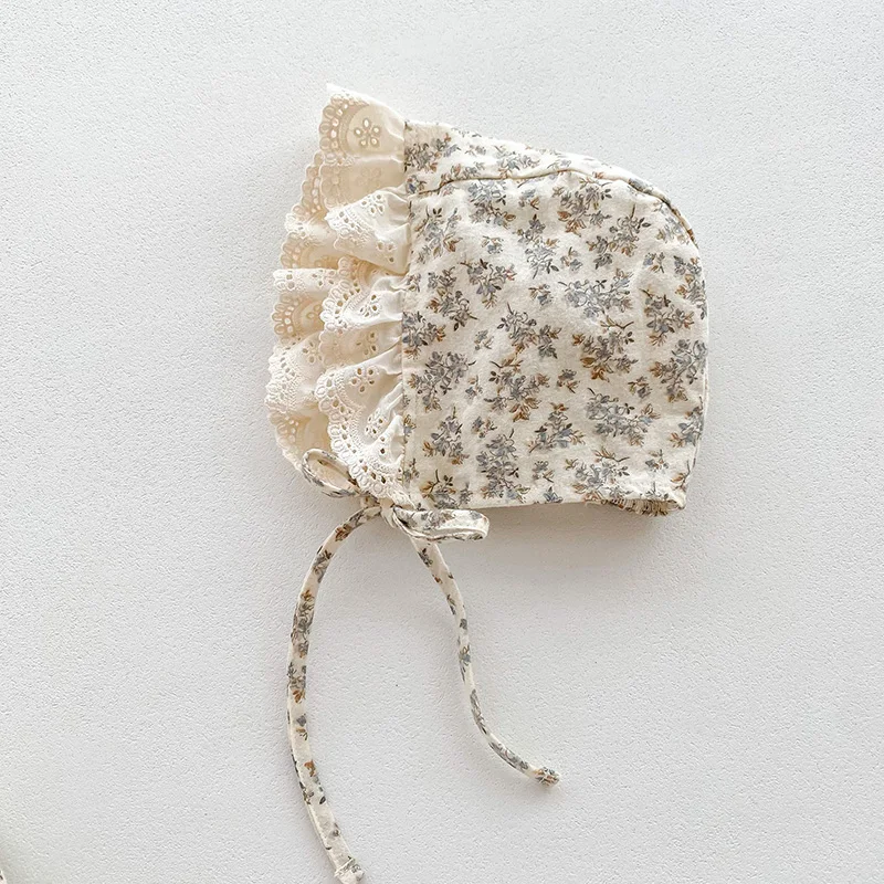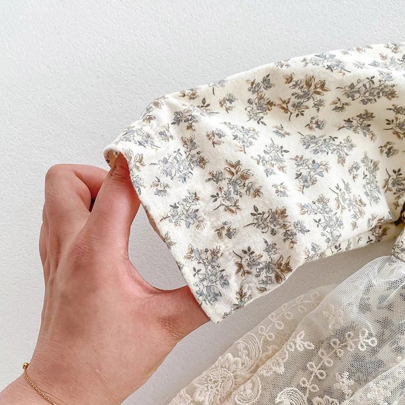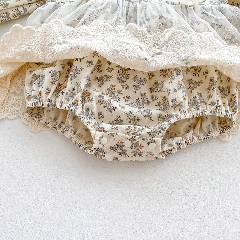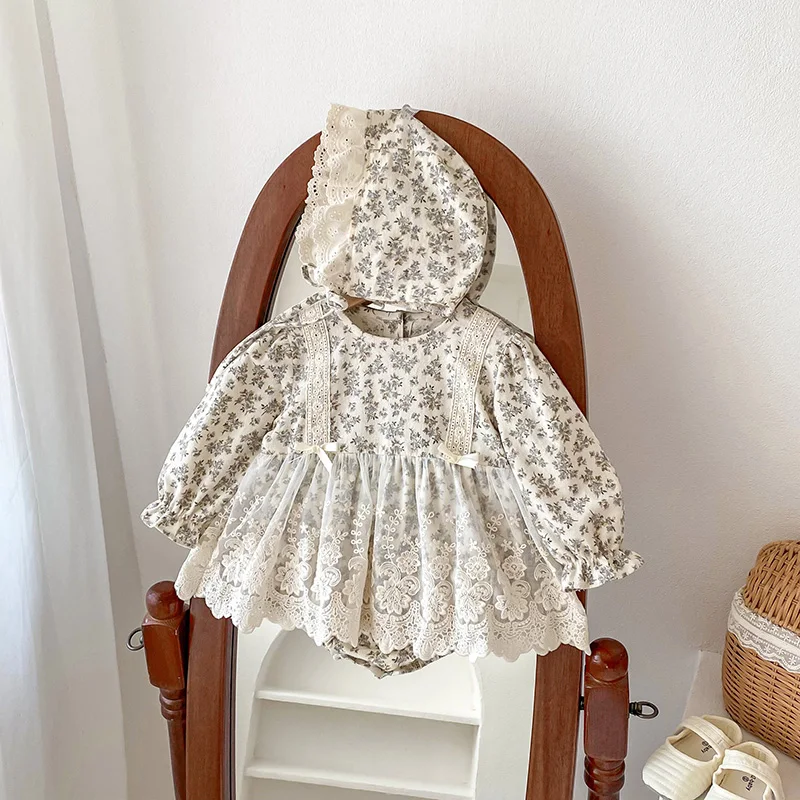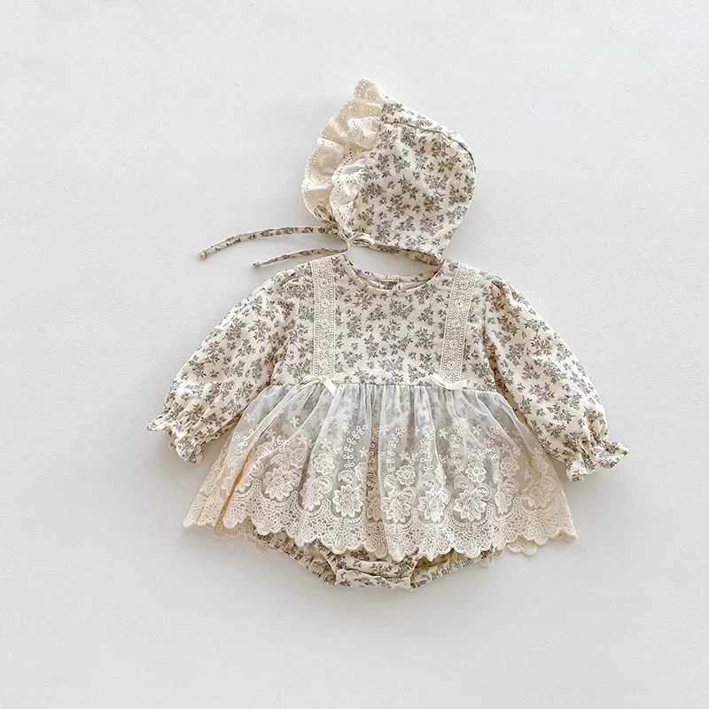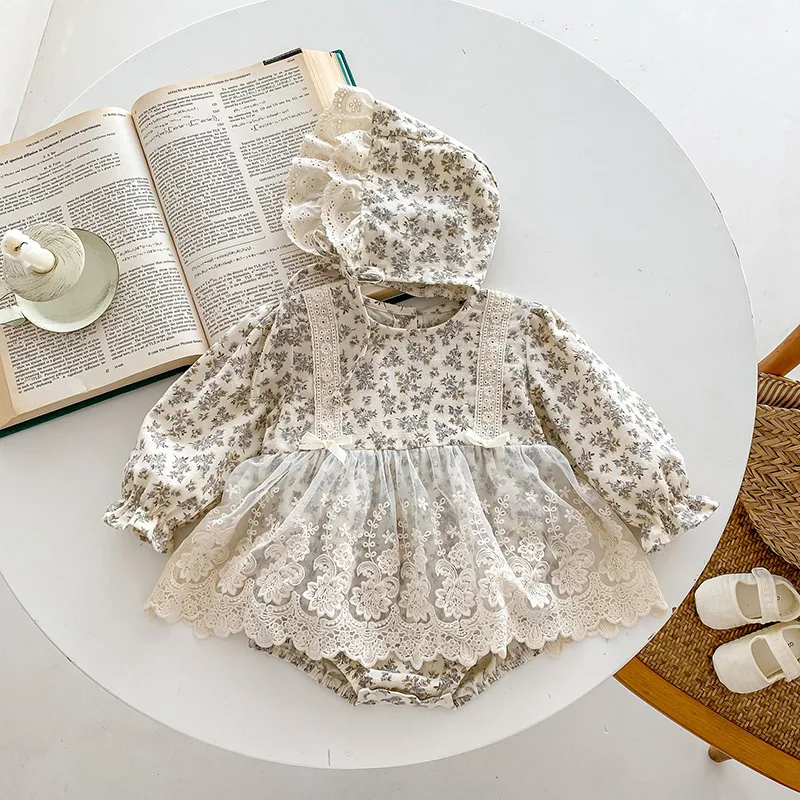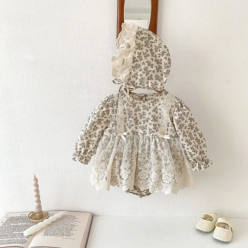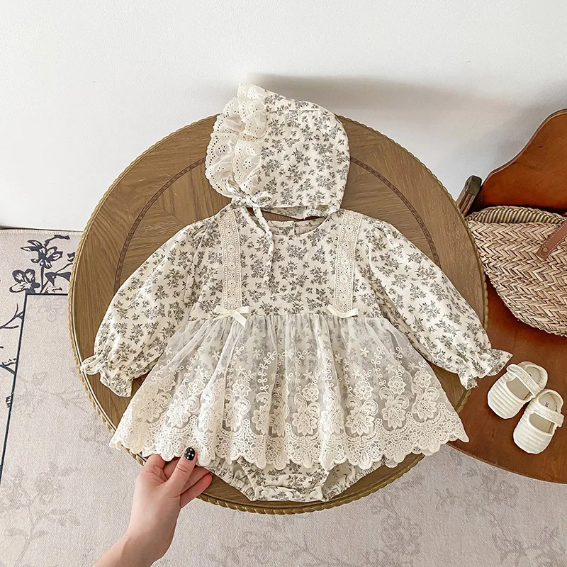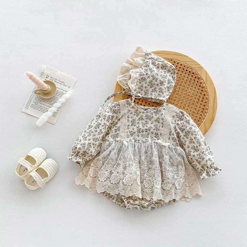ベビーロンパース ボンネットセット 長袖レーススカートドッキングボディスーツ 帽子セット フラワー花柄プリント【mh0006502】