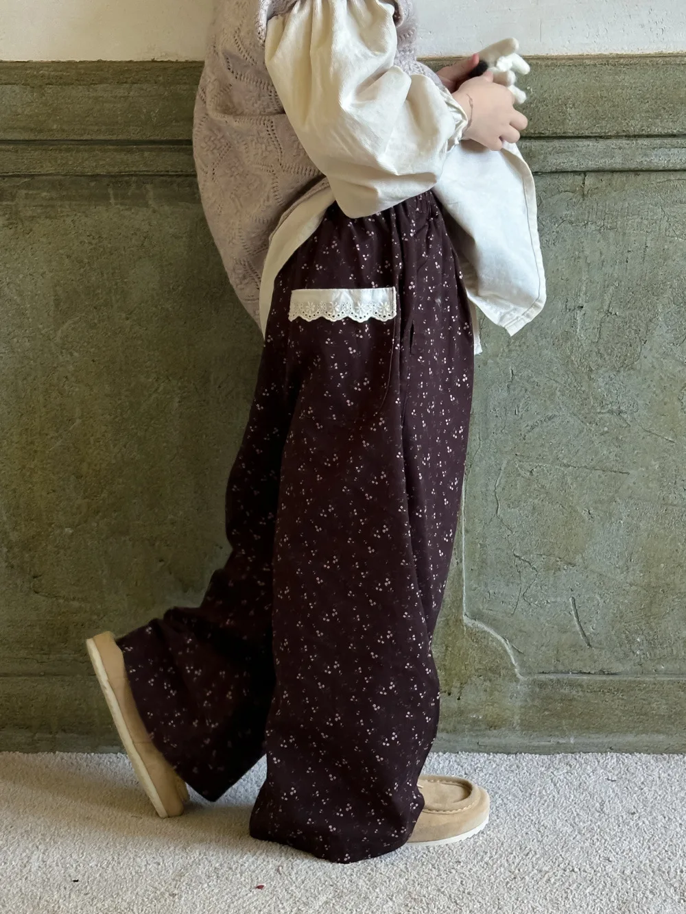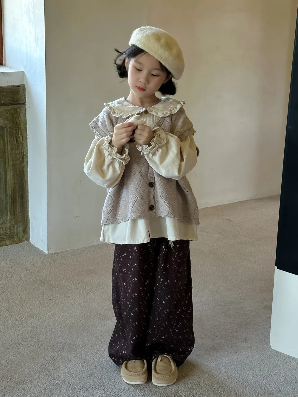 キッズトップス/ベスト/パンツ フリル襟長袖ブラウス/フラワーエンボスレースニットジレベスト/フラワープリントワイドパンツ【mh0007362】