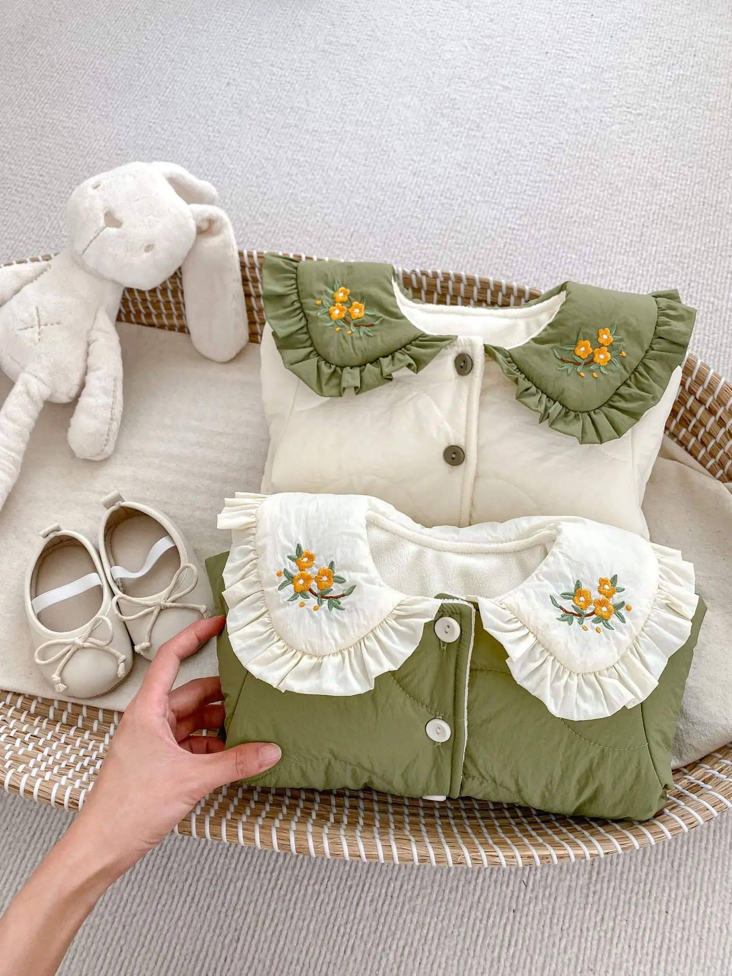 ベビーキッズアウター フリルビッグ襟フラワー刺繍キルティングコートジャケット 2カラー【mh0007513】