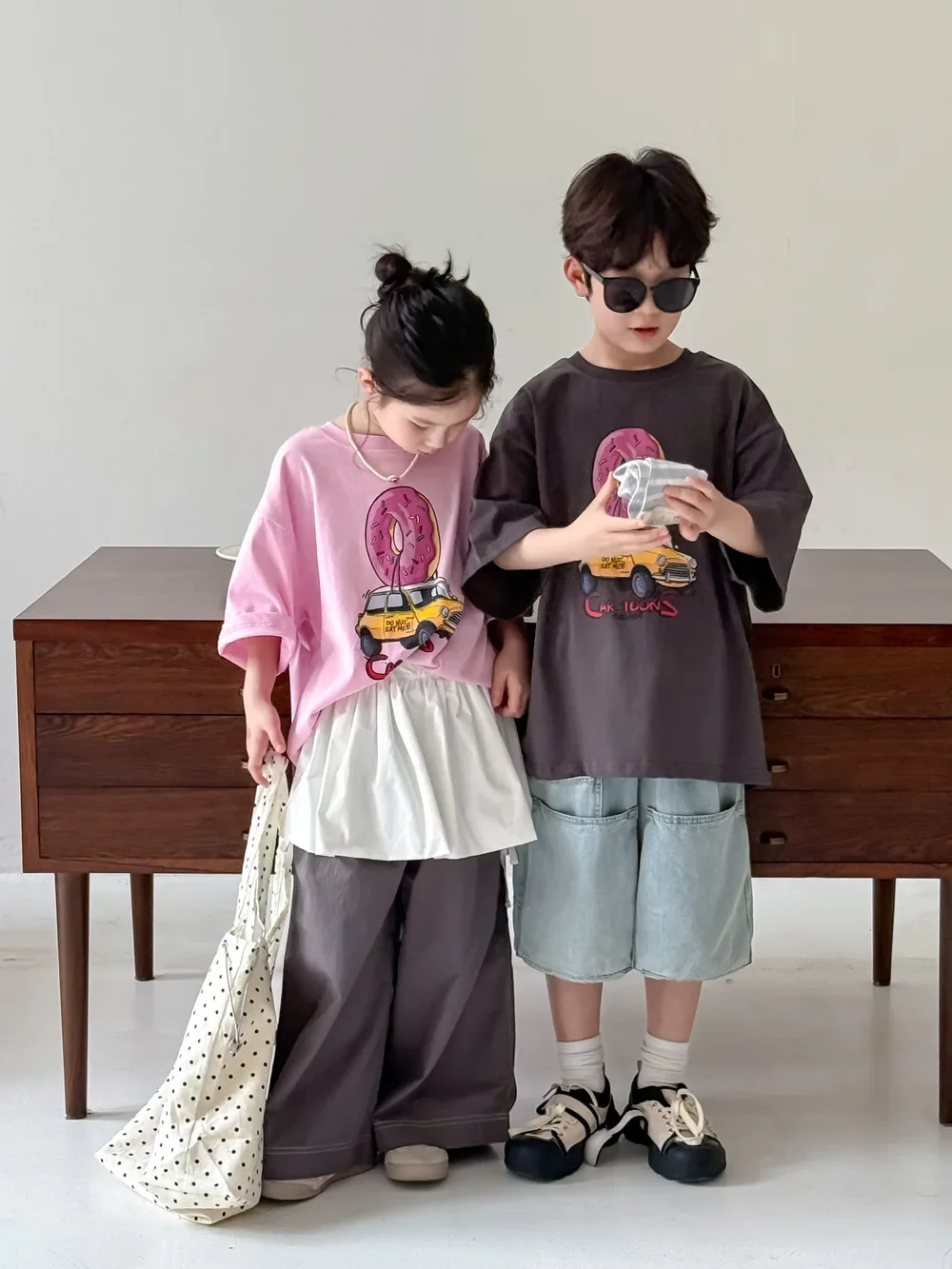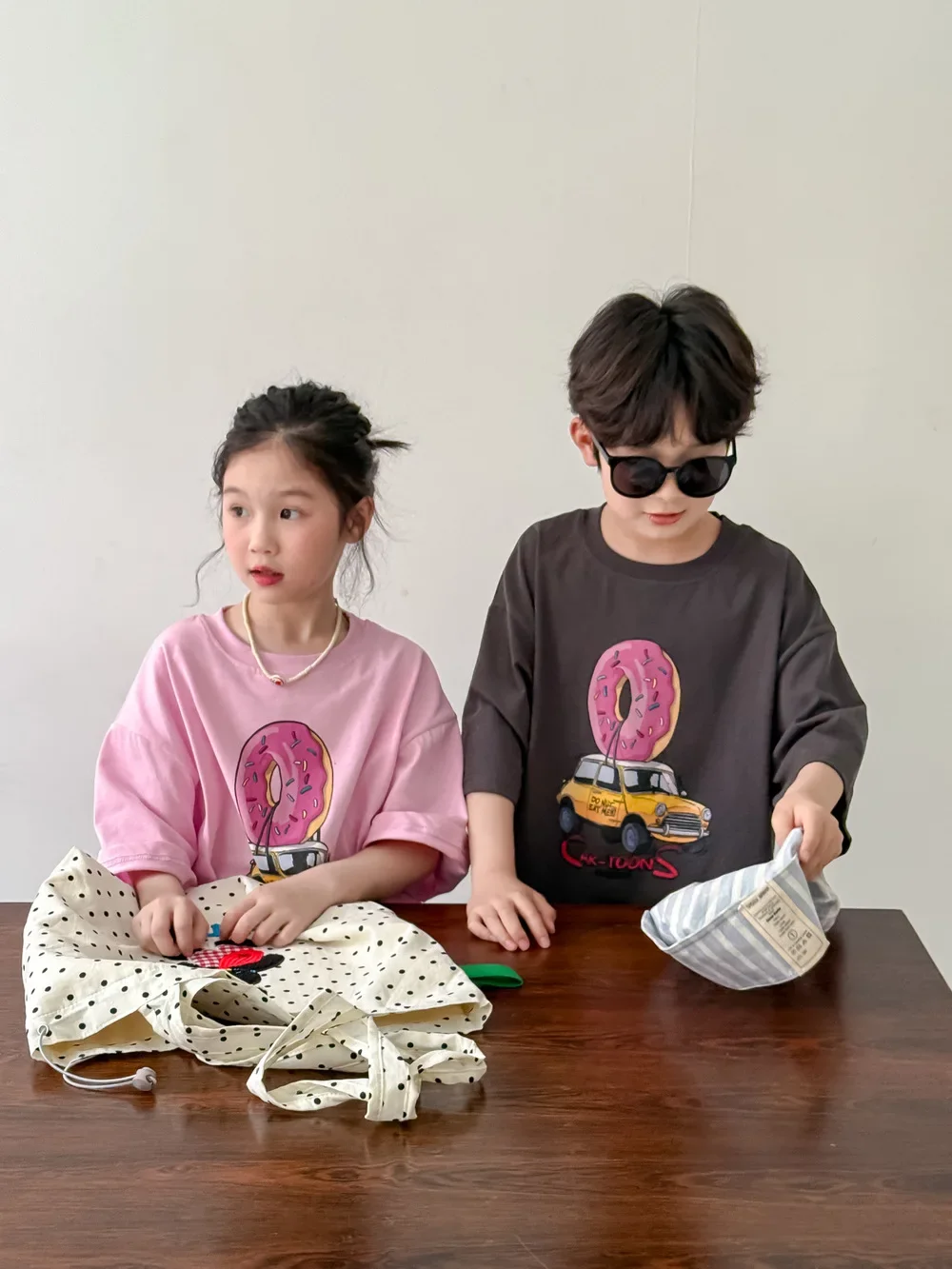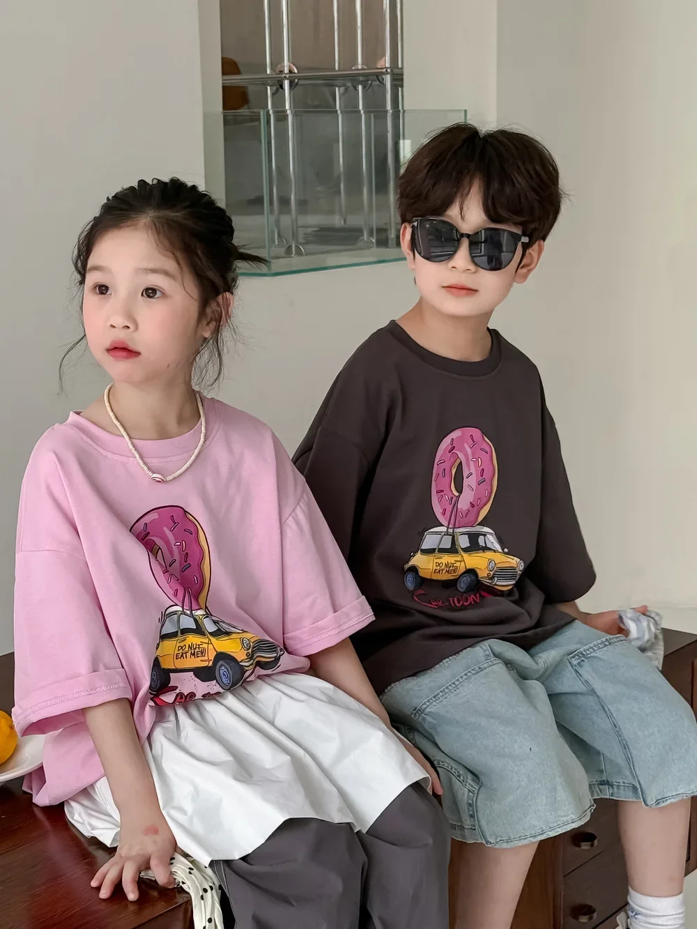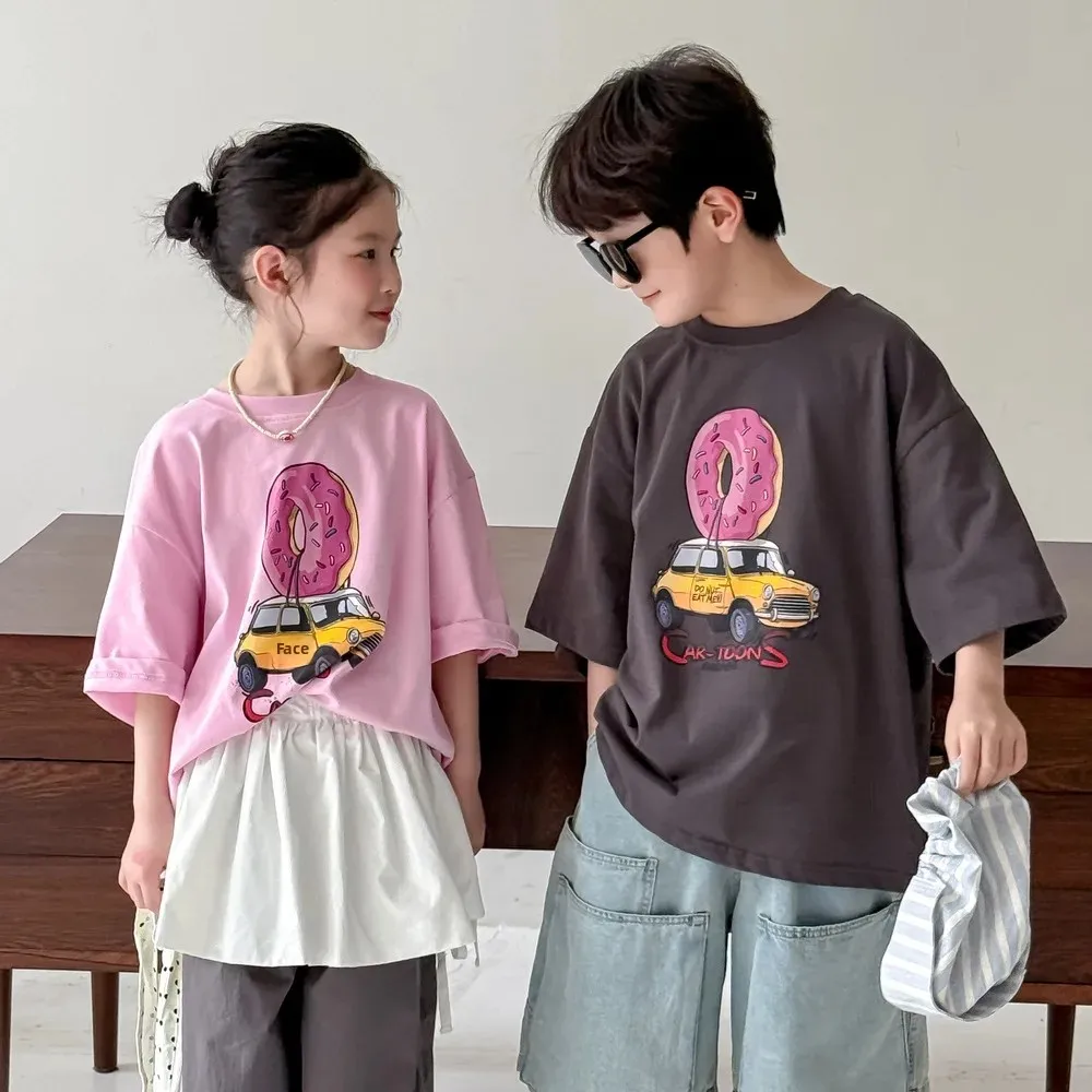 ドーナツと車が組み合わさった、ユニークなドーナツカープリント半袖Tシャツです。お子さんが大好きなモチーフが可愛らしいカートゥーン調で描かれており、見ているだけで楽しくなります。
